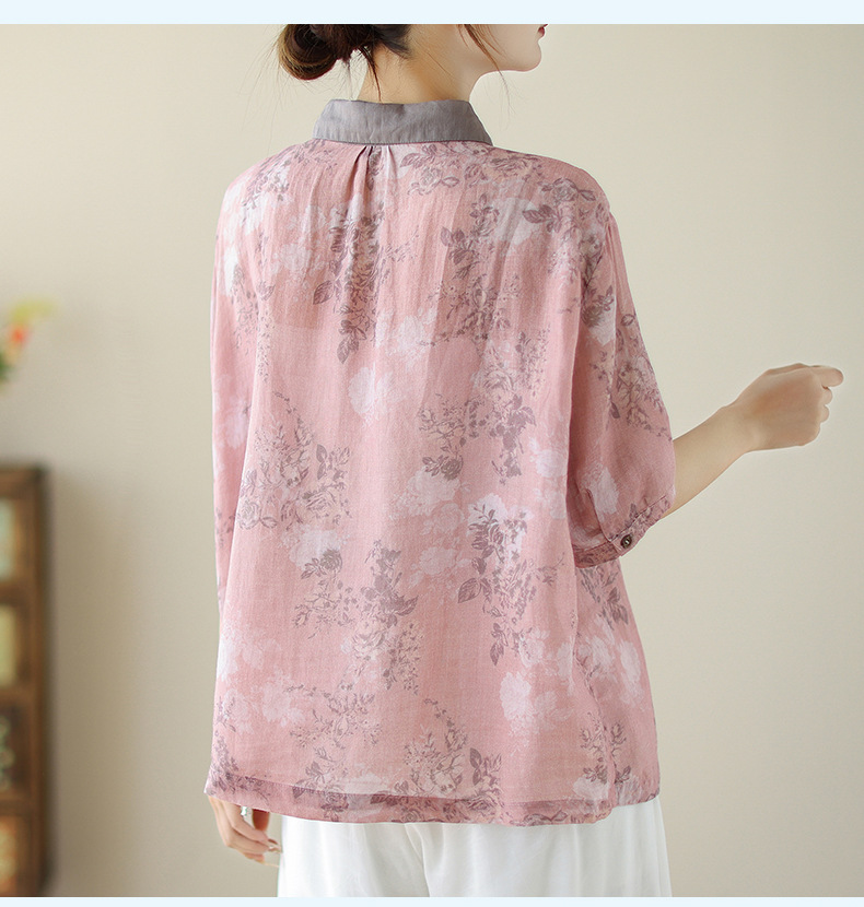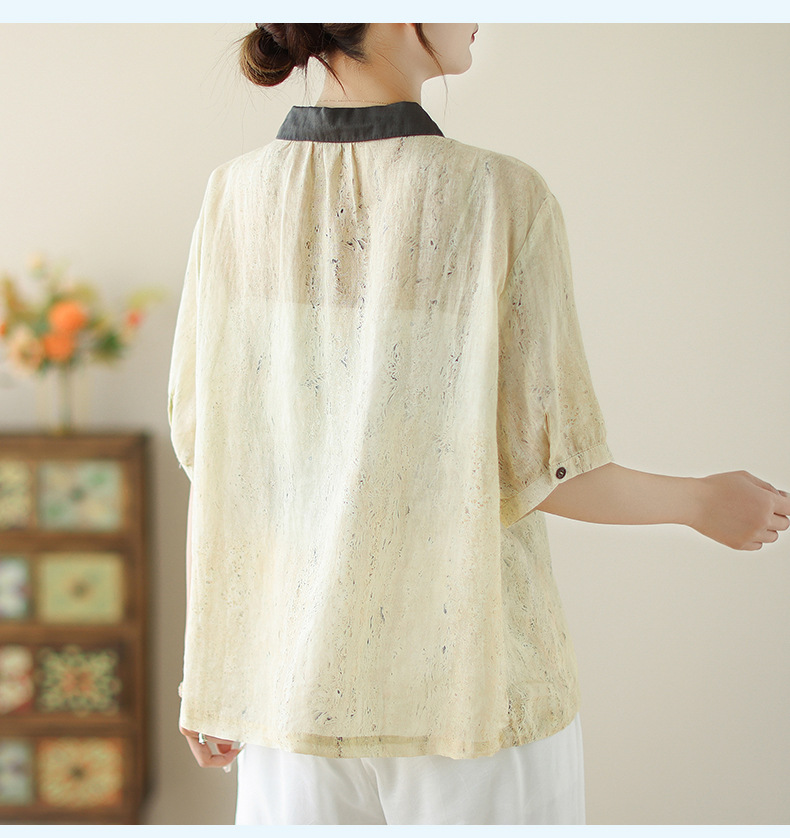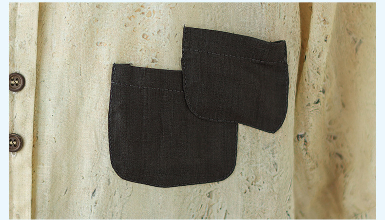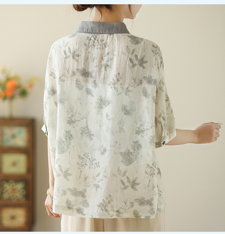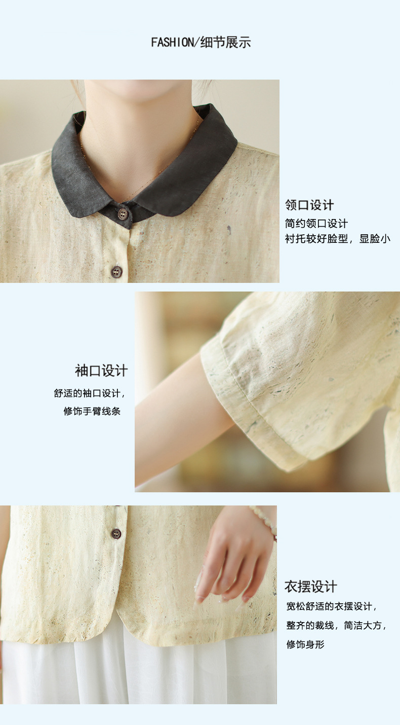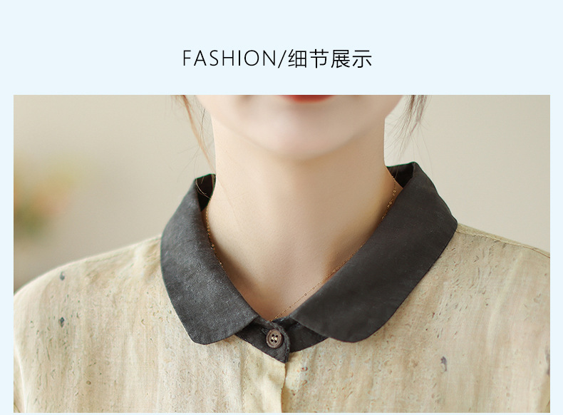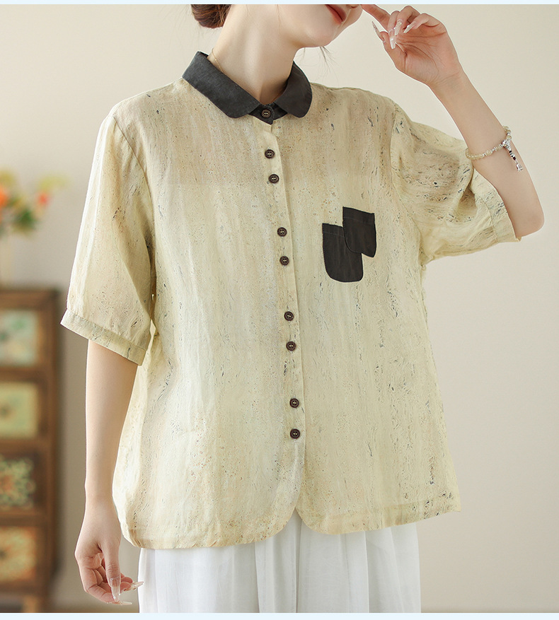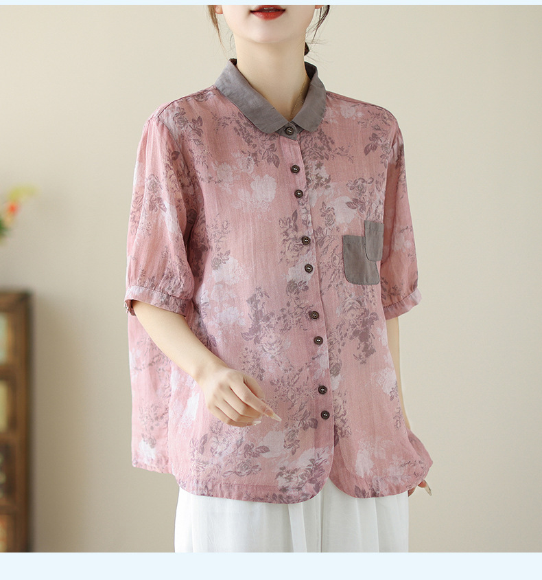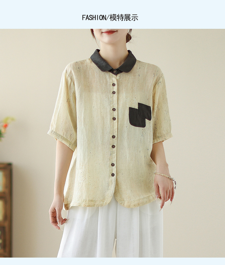 文艺印花棉麻衬衫上衣,翻领贴布口袋短袖衬衣LJX-D035-9097