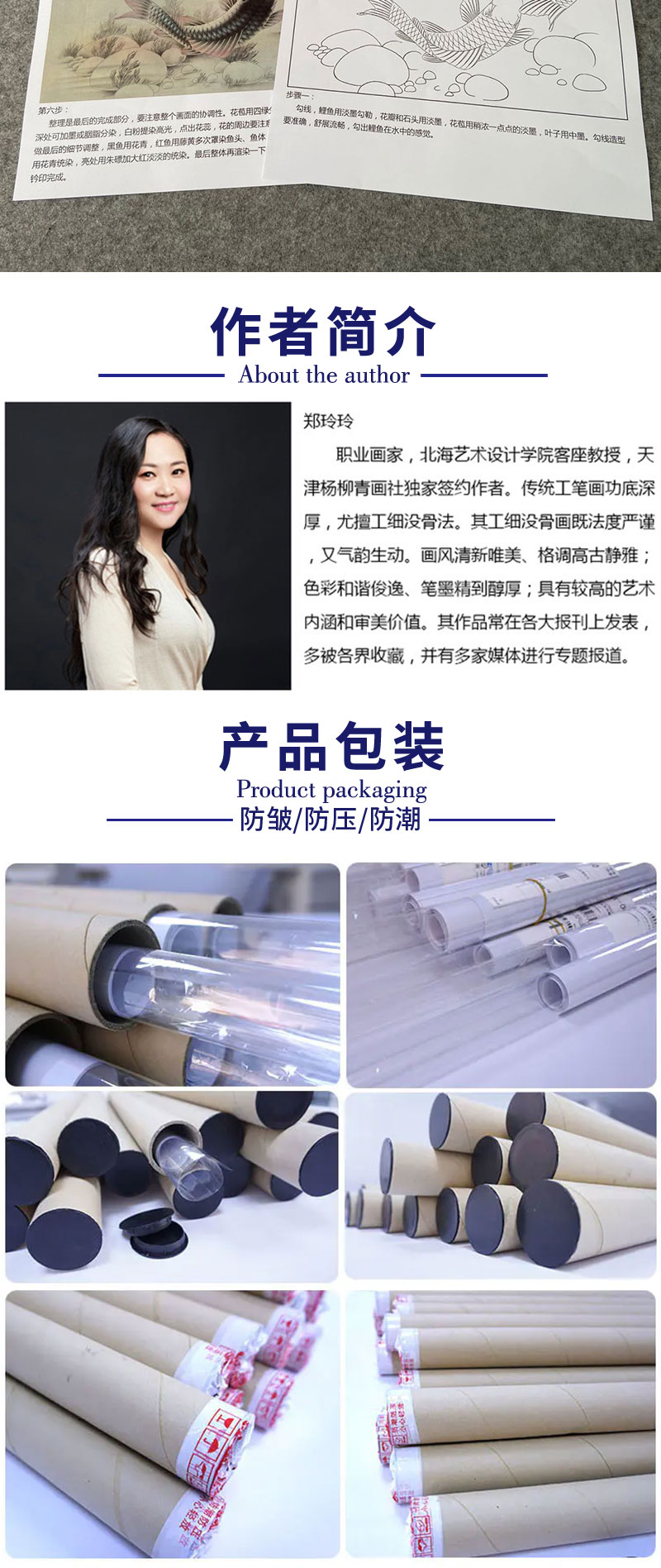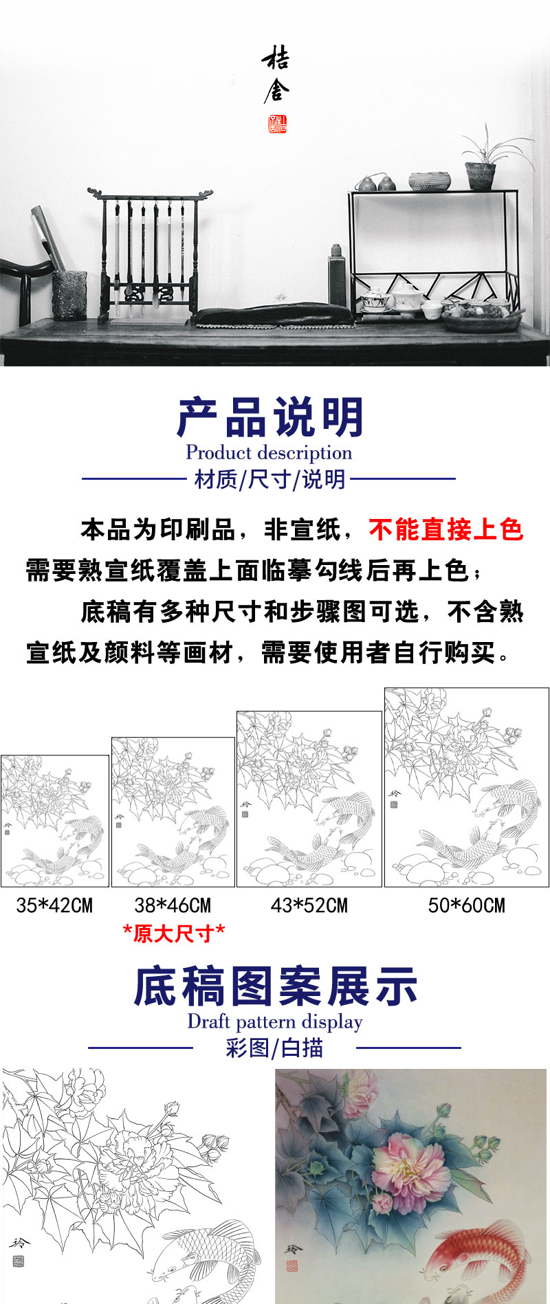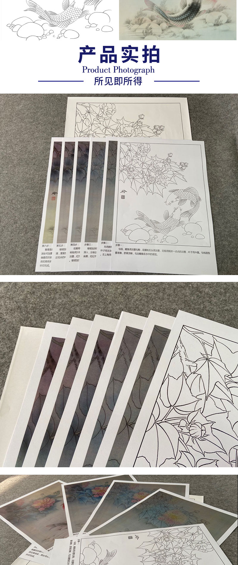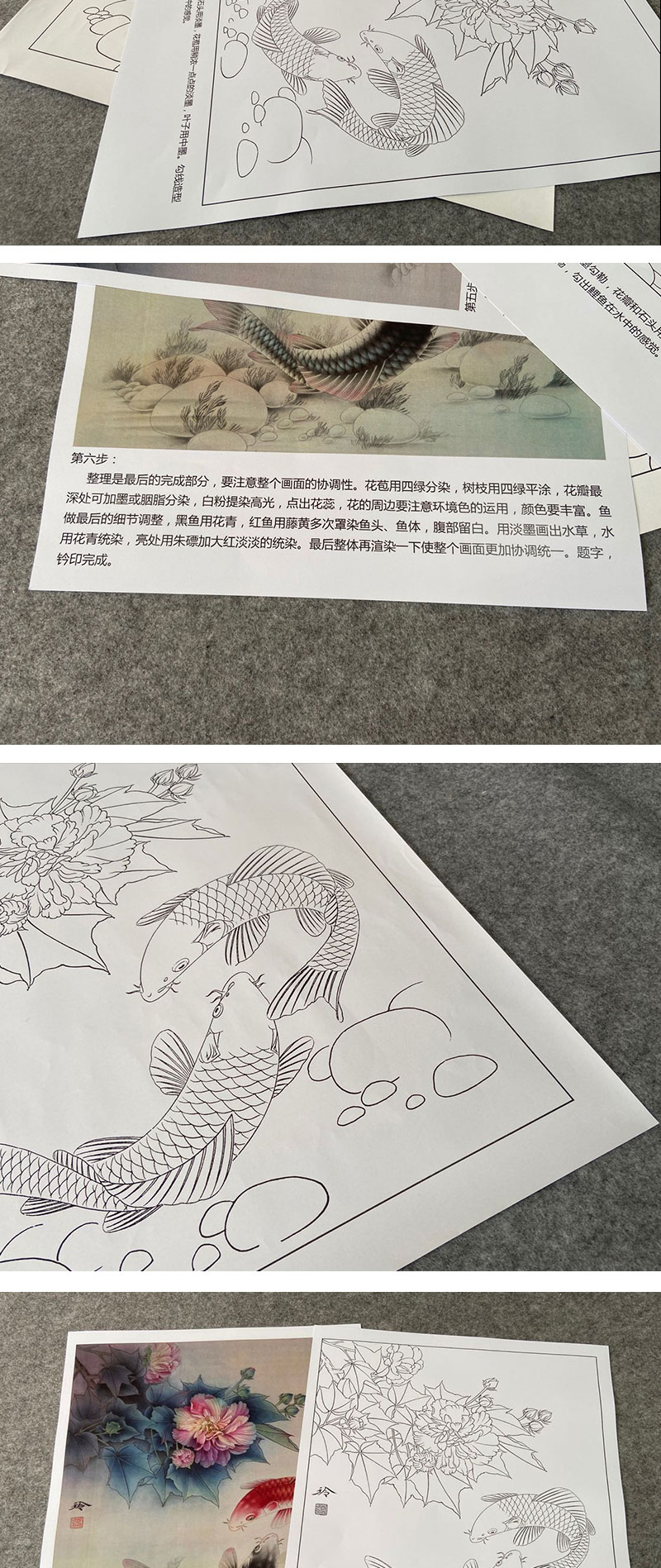 【有步骤、大彩图】郑玲玲工笔画白描底稿《双锦比翼图》牡丹鲤鱼初学者临摹花鸟线稿ZL36
