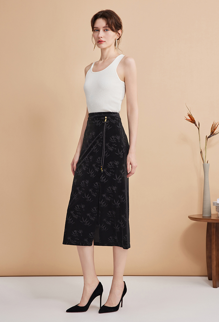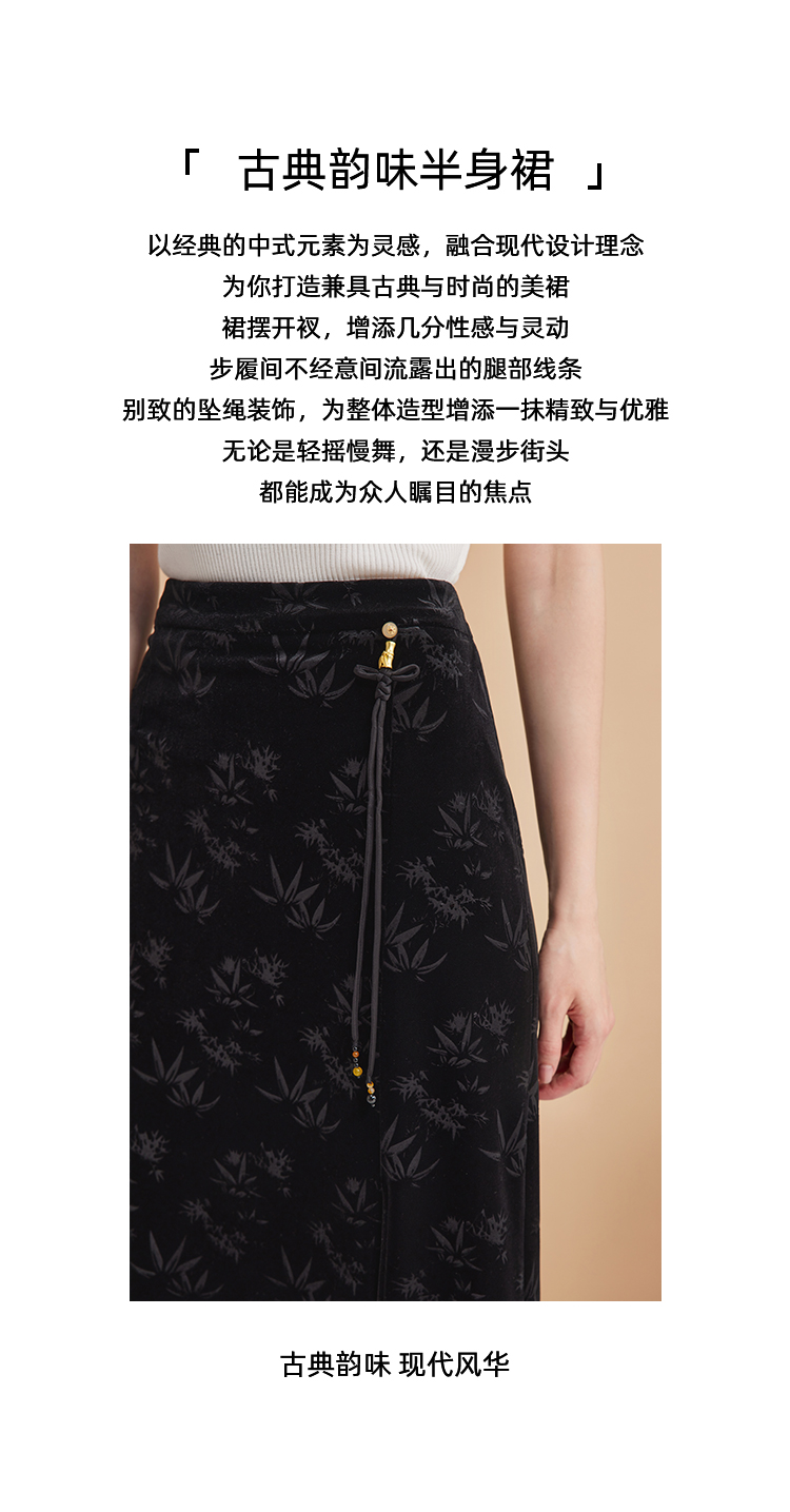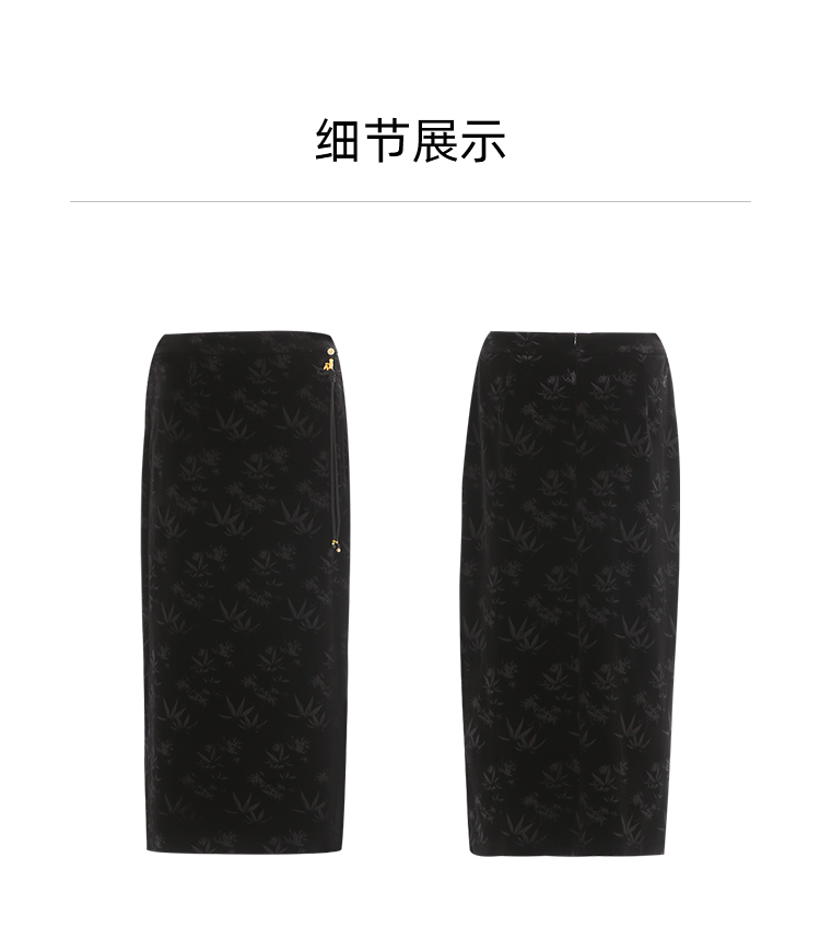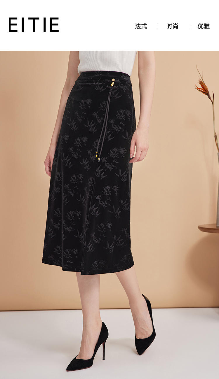 EITIE爱特爱气质优雅中式暗纹吊坠黑色丝绒开叉半身裙秋新款C2406418