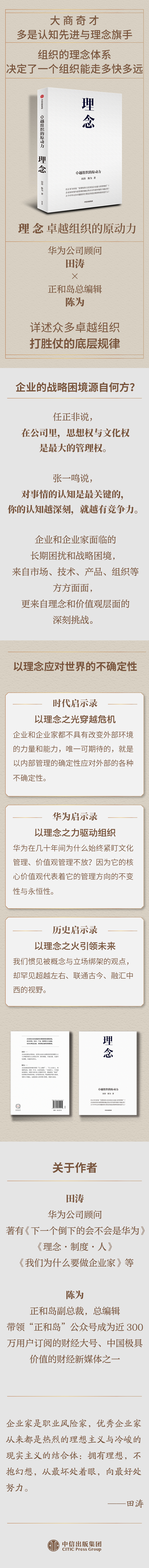 田涛、陈为,田涛,华为公司顾问。著有《下一个倒下的会不会是华为》《理念·制度·人》《我们为什么要做企业家》等论著,主编有《枪林弹雨中成长》《厚积薄发》《黄沙百战穿金甲》《迈向新赛道》《一人一厨一狗》《蓬生麻中 不扶自直》《华为访谈录》等华为系列案例图书。