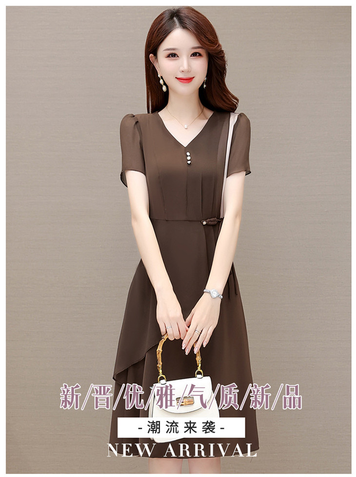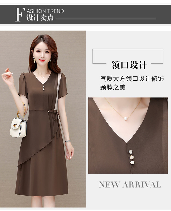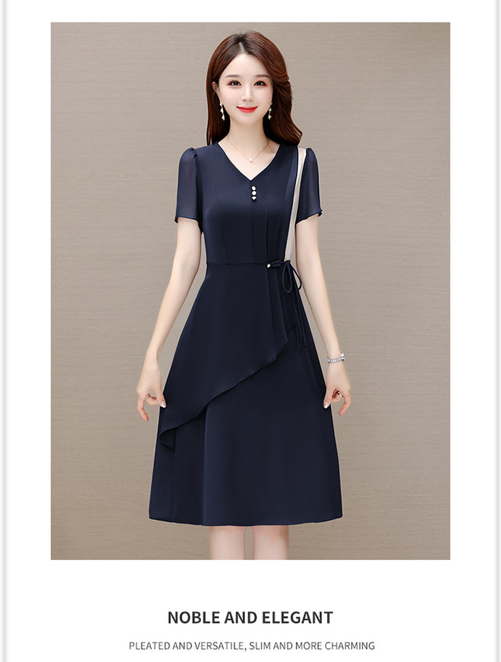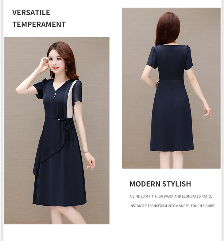 QYMOMS-YQA409-L简约中长款时尚雪纺裙2024年夏款短袖修身A字裙洋气拼接连衣裙