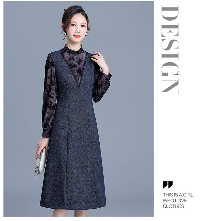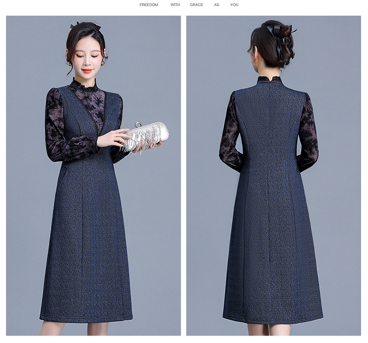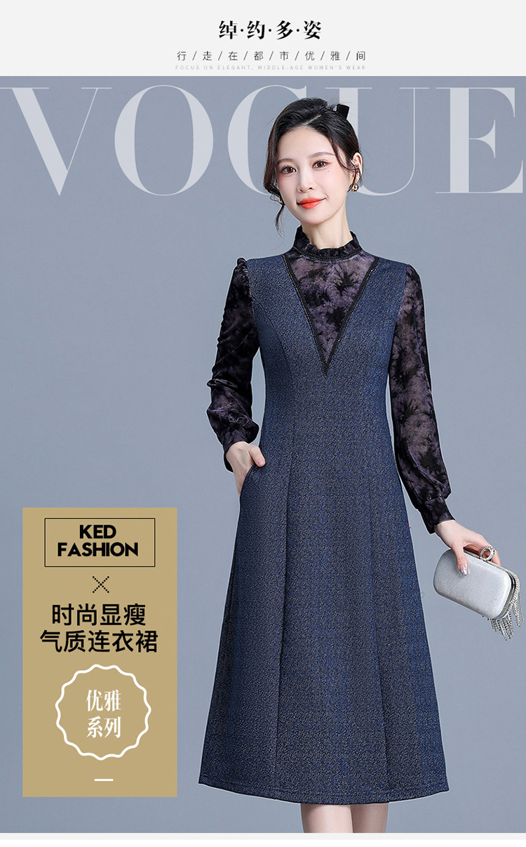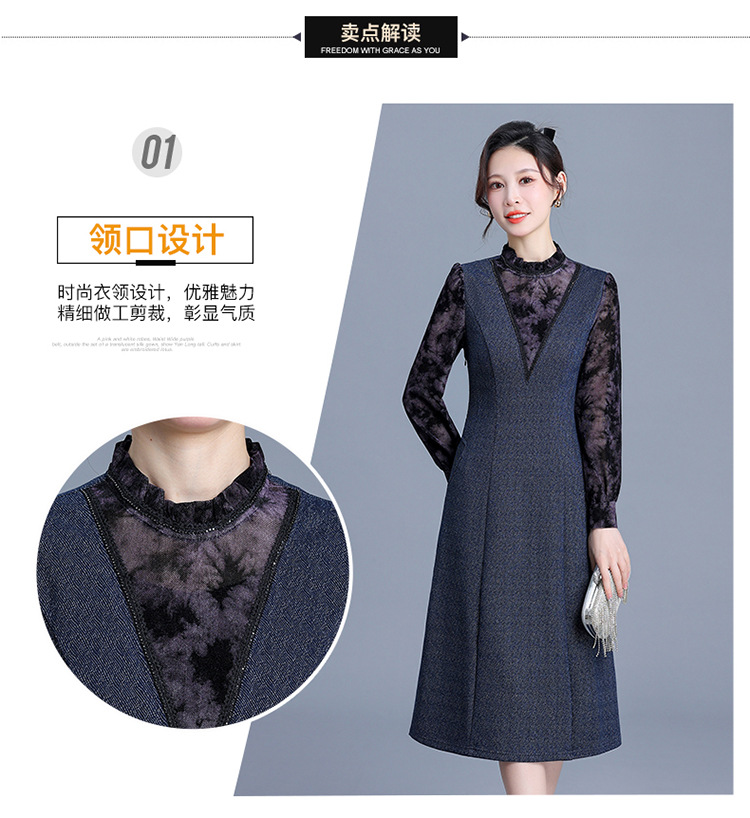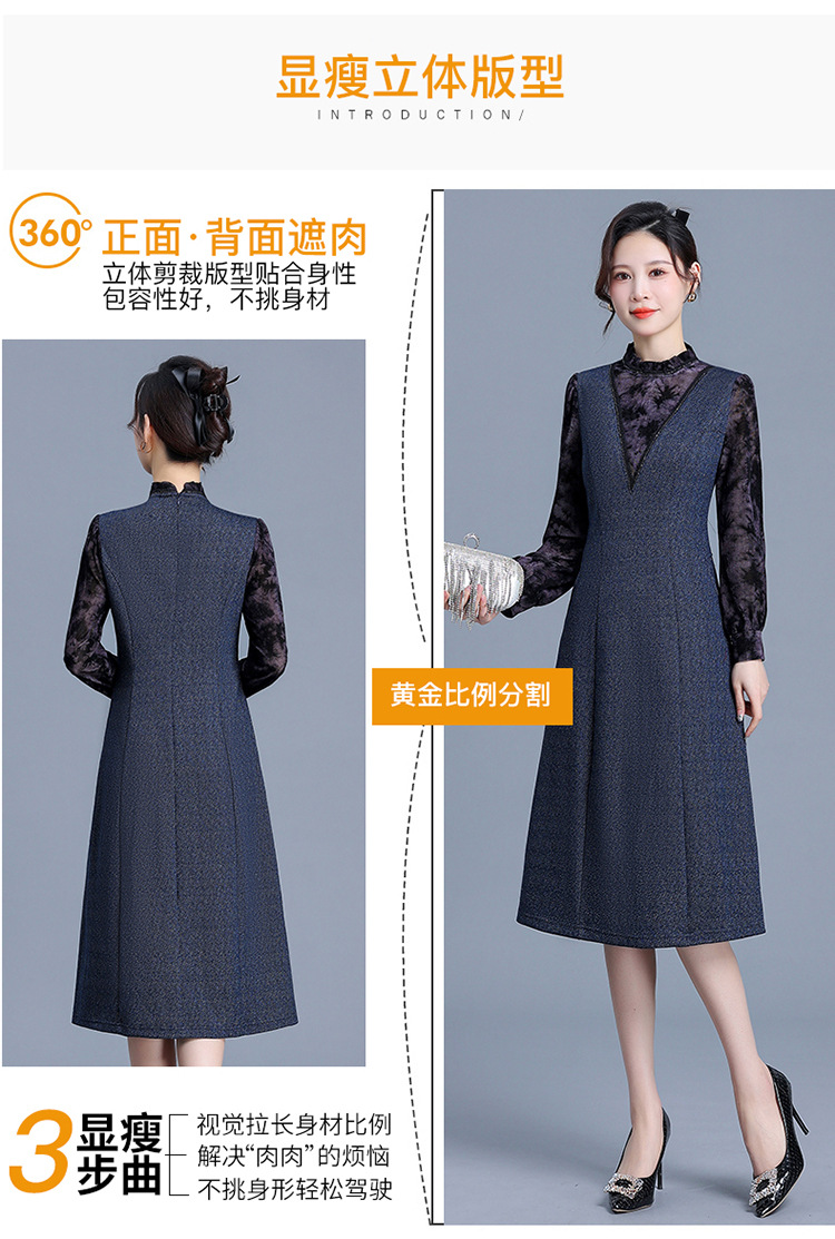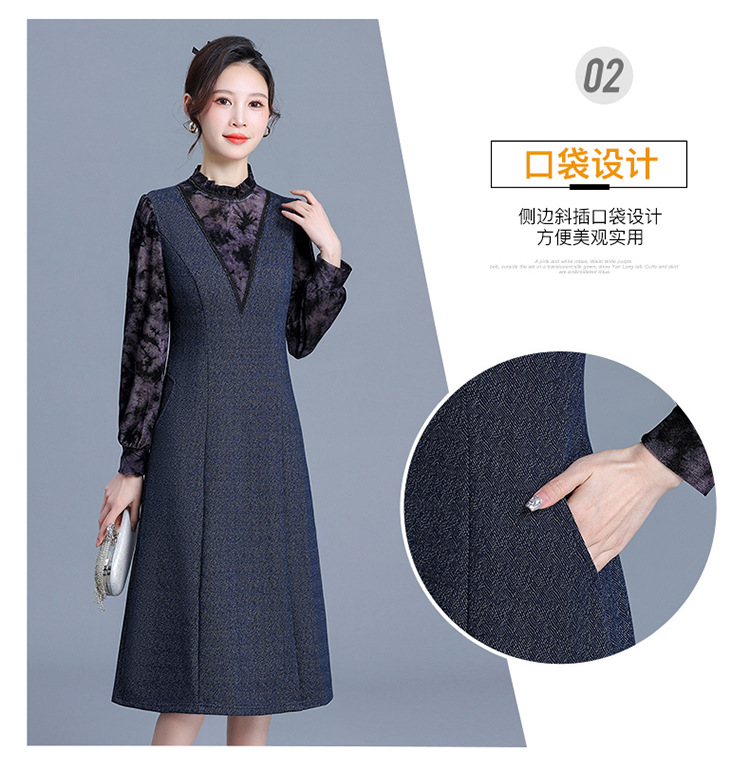 拼结假两件长袖裙,时尚中老年妈妈装牛仔蓝色厚款中长款连衣裙QYM-KED-H1573-Y