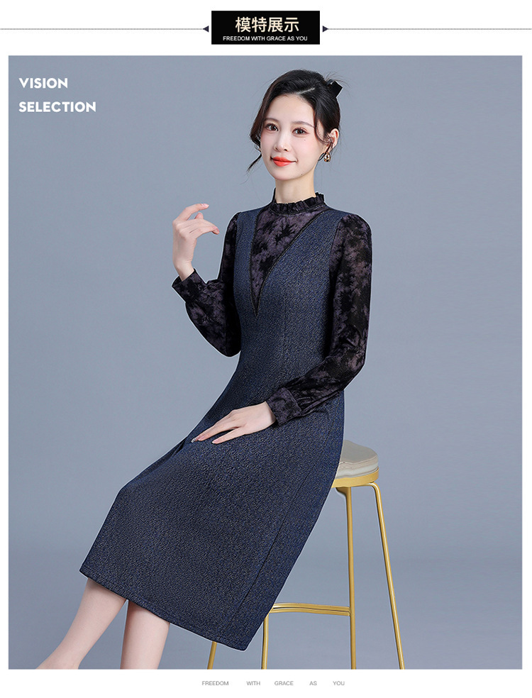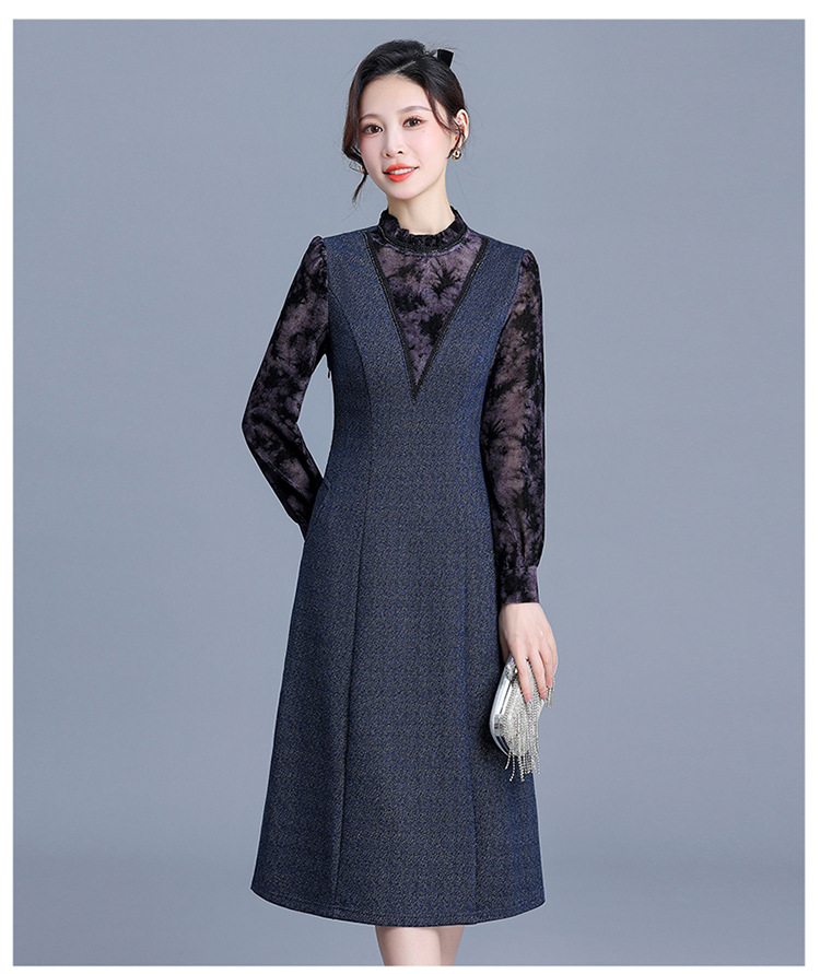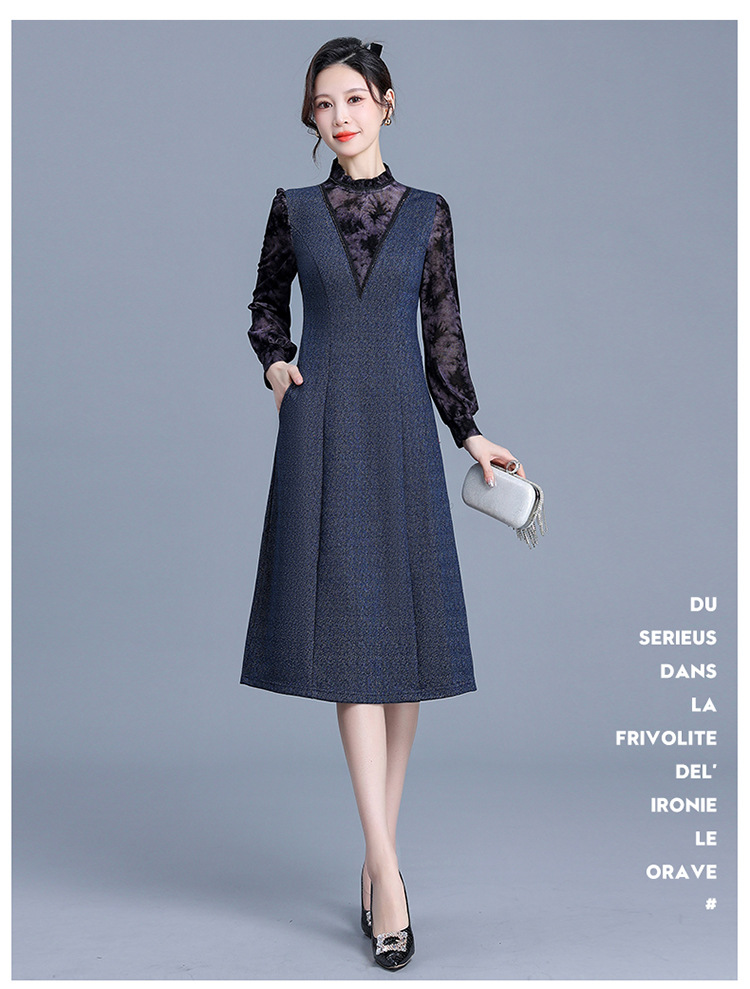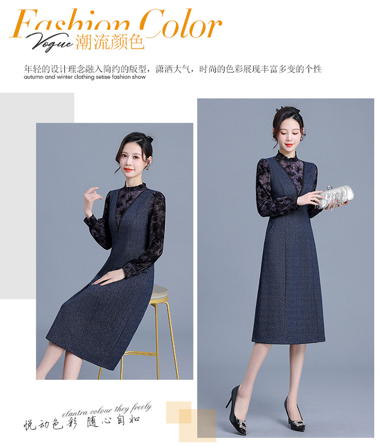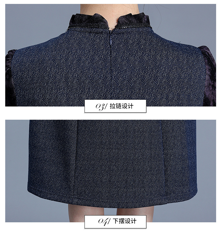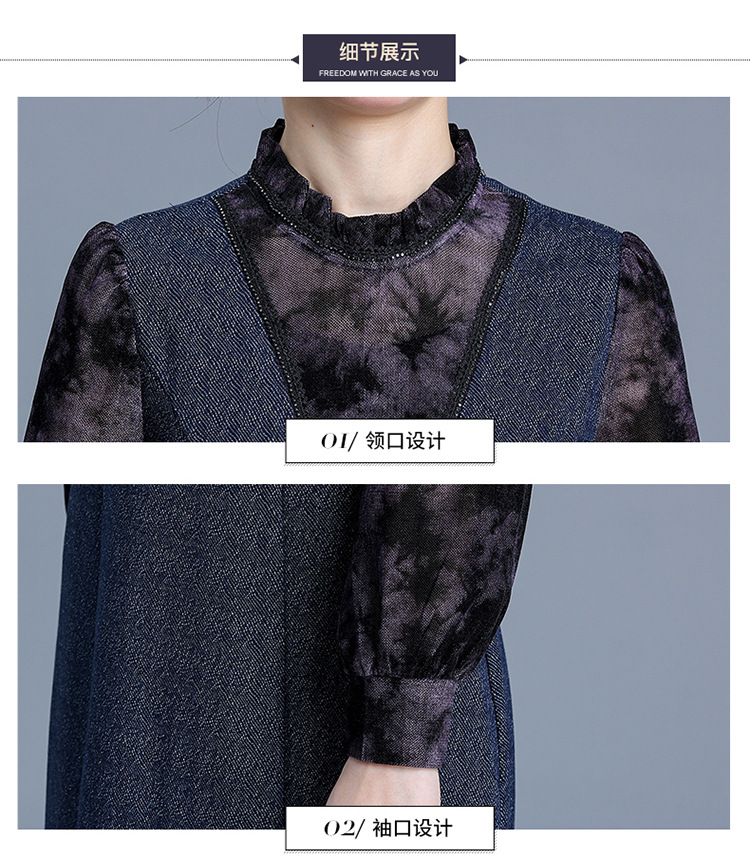 拼结假两件长袖裙,时尚中老年妈妈装牛仔蓝色厚款中长款连衣裙QYM-KED-H1573-Y