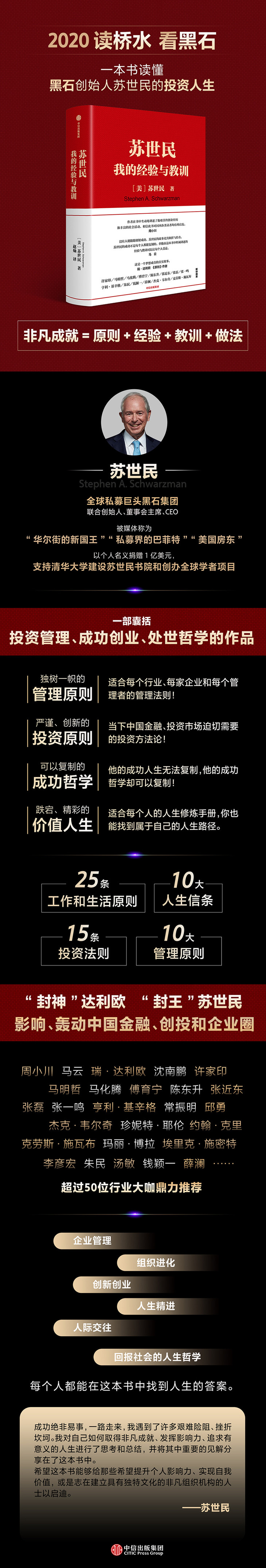 成功绝非易事,一路走来,我遇到了许多艰难险阻、挫折坎坷。我对自己如何取得卓越成就、发挥影响力、追求有意义的人生进行了思考和总结,并将其中重要的见解分享在了《苏世民:我的经验与教训》这本书中。书中记述了许多我在追逐成功的道路上获得的经验与教训,同时对于如何取得成功提供了切实可行的建议。希望这本书能够给那些希望提升个人影响力、实现自我价值,或是志在建立具有独特文化的卓越组织机构的人士以启迪。这本书在美国一经出版就受到了企业家、学生、普通职工等大众读者的喜爱,已成为美国的畅销图书。