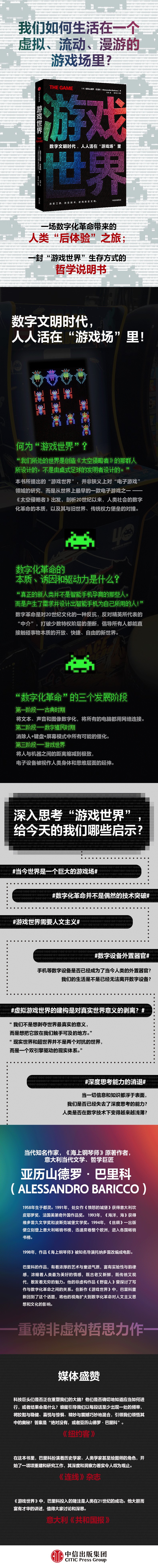 本书是意大利著名作家亚历山德罗•巴里科的全新力作,他被誉为是继卡尔维诺、艾柯之后受世界瞩目的意大利作家。他每本作品的出版,都会在世界各国引起巨大的反响,不仅本本畅销,而且屡获大奖。其代表作品《海上钢琴师》《丝绸》等都被改编成了电影,广为流传。这本书以一个作家的视角,来审视数字化革命给现代人的生活和思维带来怎样的改变。在这本书中,巴里科次运用了非小说体的写作方式,将游戏的发展比喻成王国的兴衰,将游戏的世界比喻成世界的版图,在一代代科技力量的更迭和革新中,游戏世界里似乎也一次次经历着硝烟与战役,尘埃落定,会产生不一样的文明和感悟。