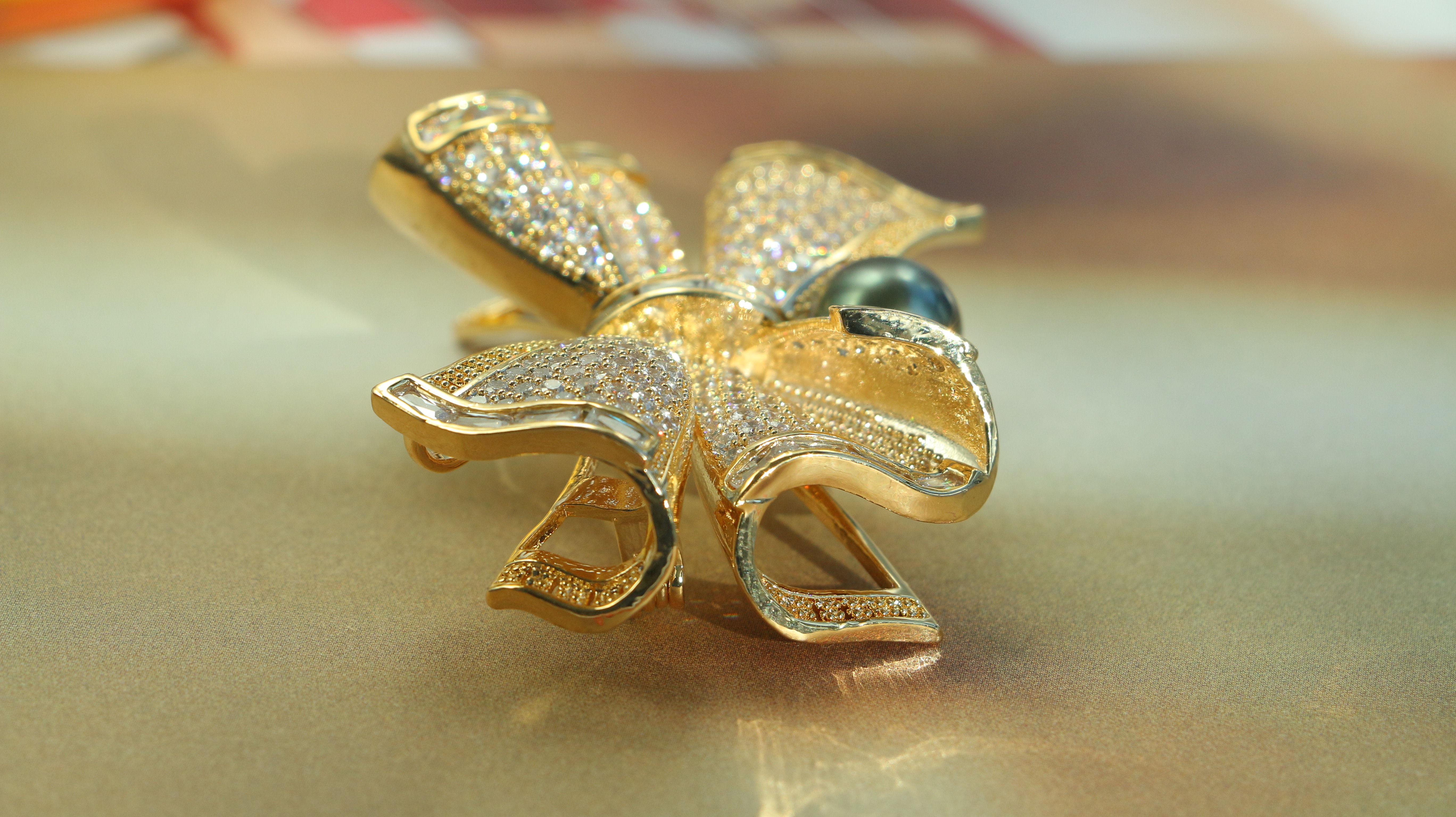 甄珠贝 重工满钻镶嵌 蝴蝶结胸针 立体感十足 大溪地黑珠 9-10mm