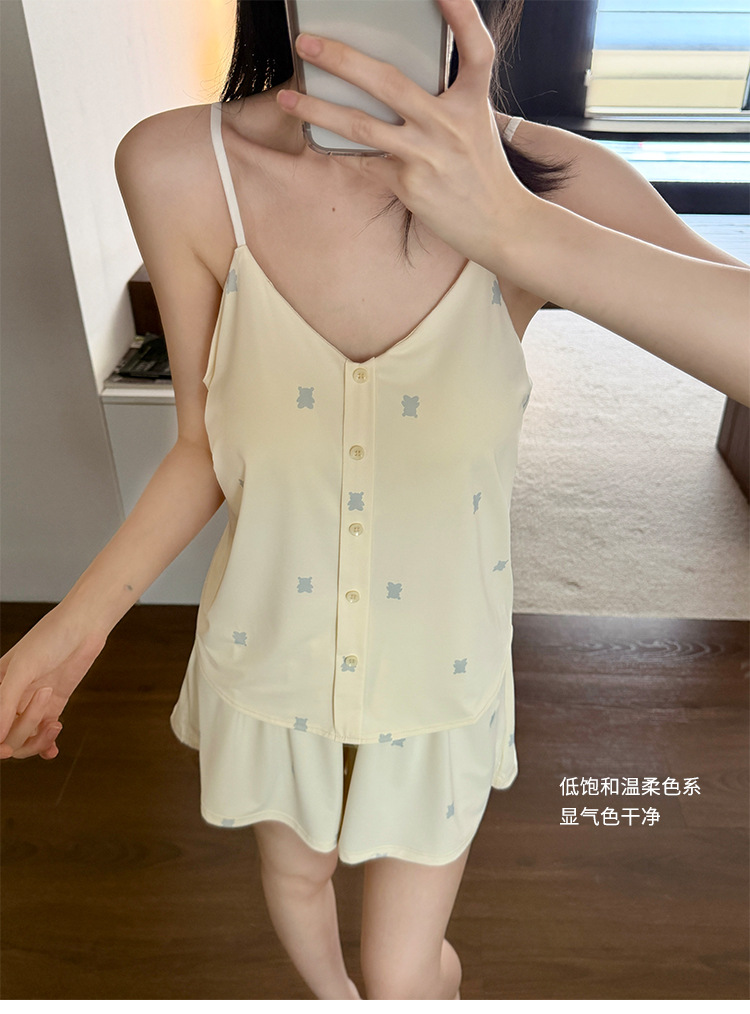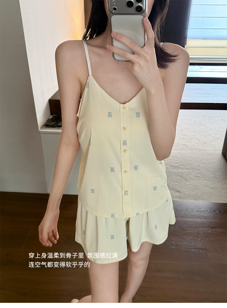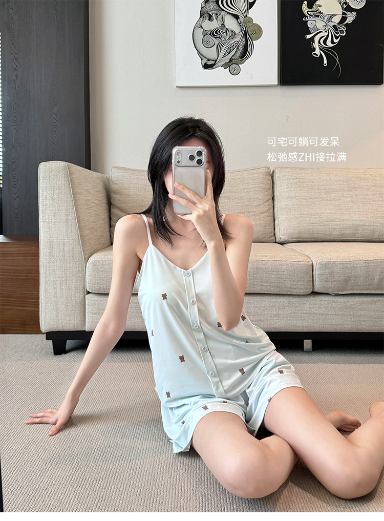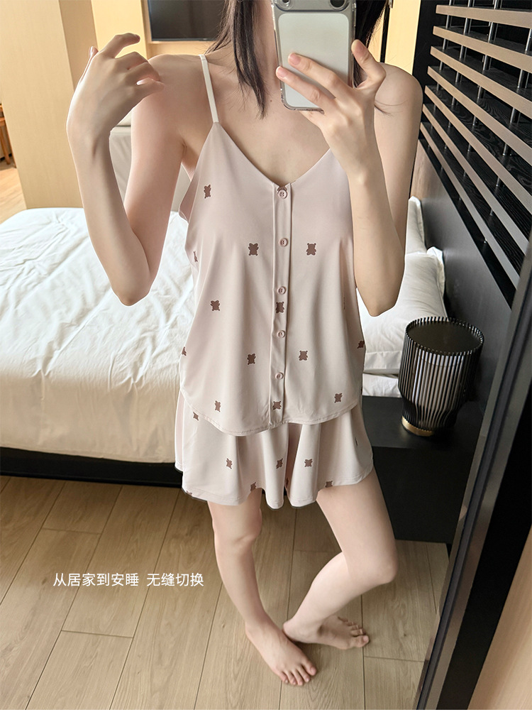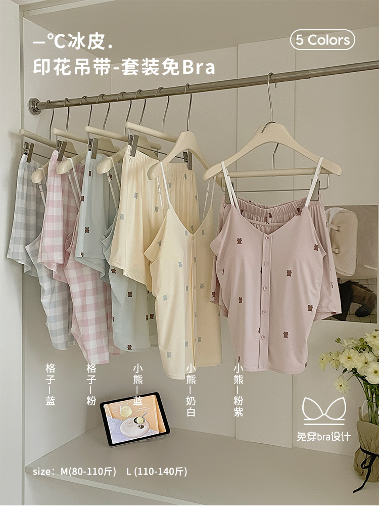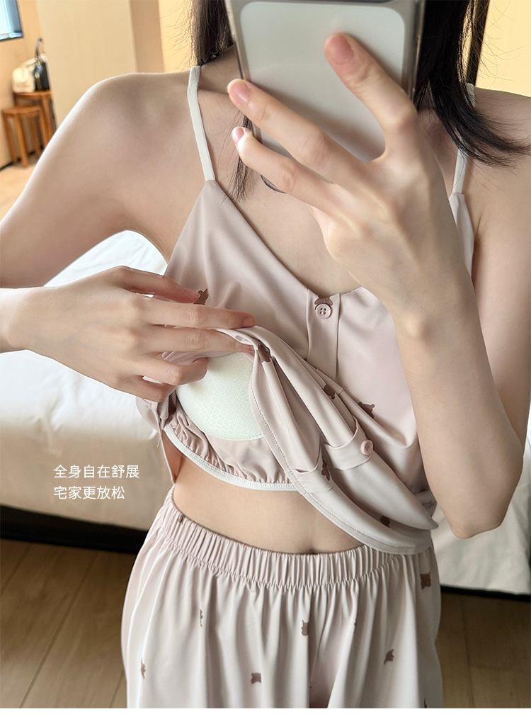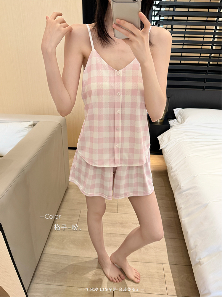 【冰皮带胸垫家居服】夏季女士冰丝凉感吊带睡衣 免穿内衣薄款家居服套装