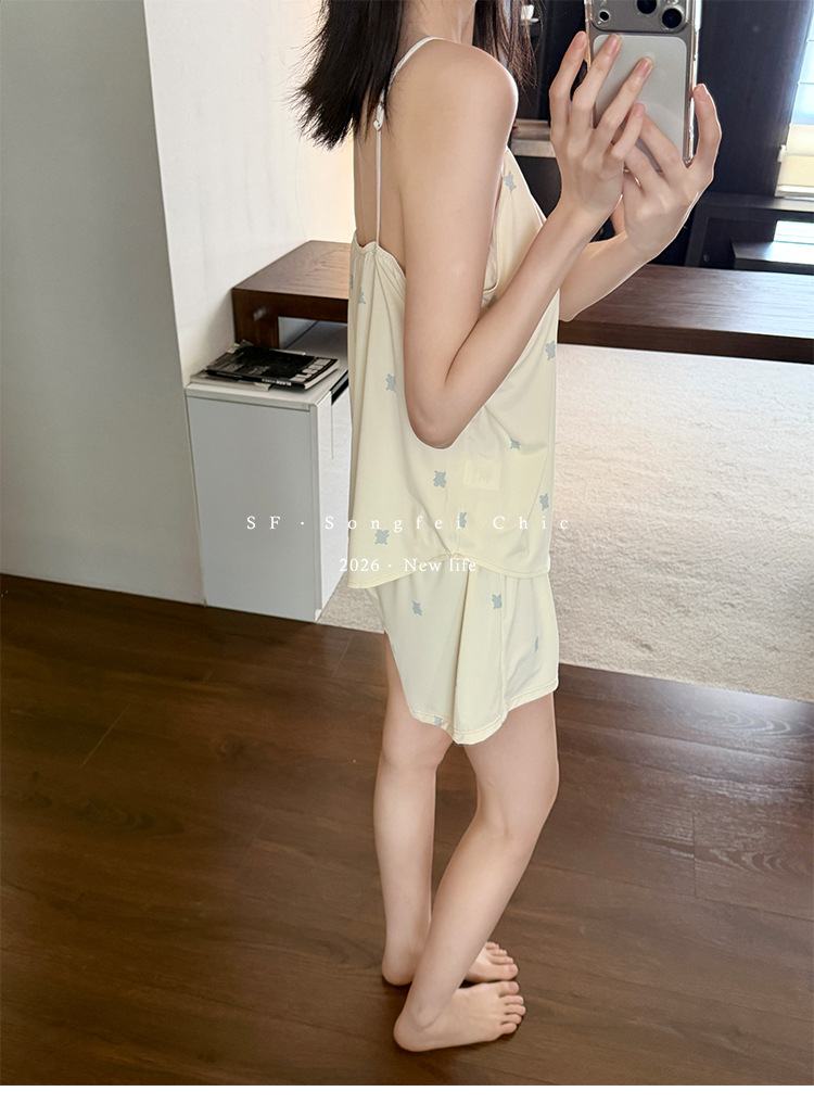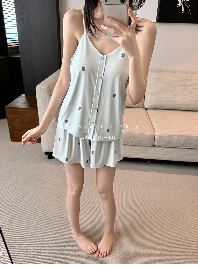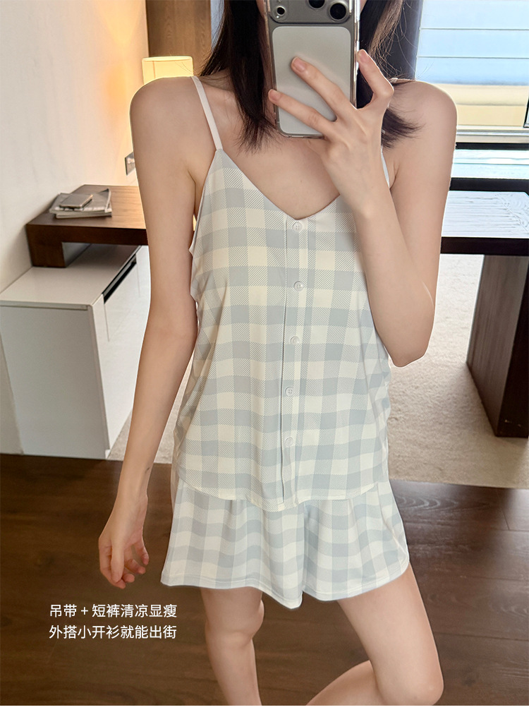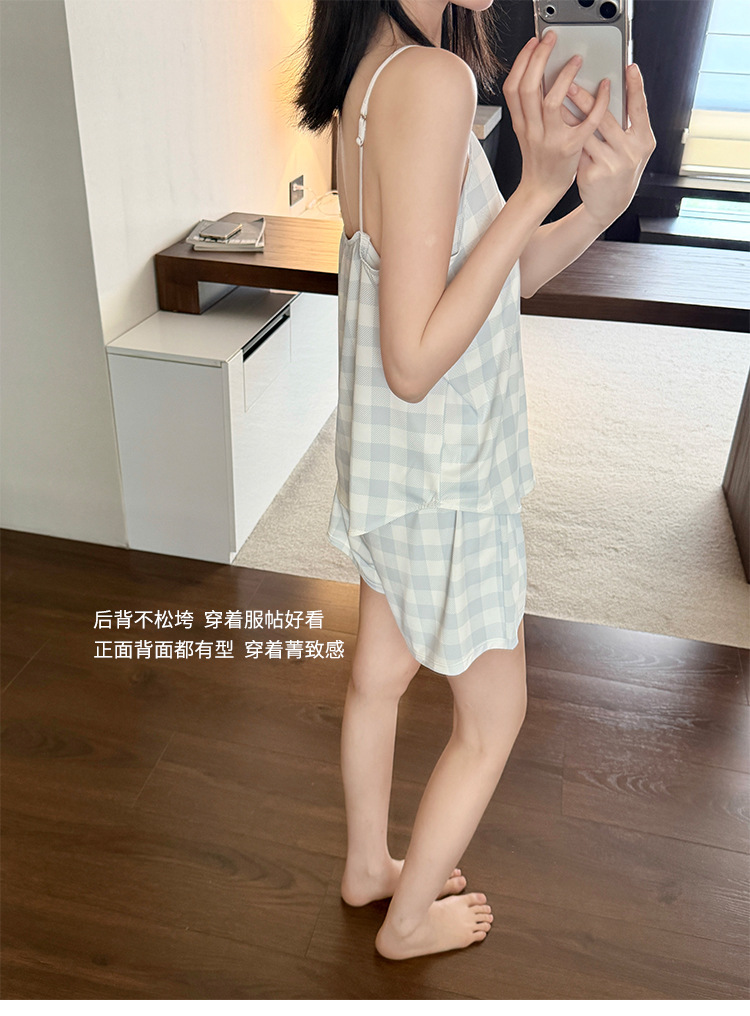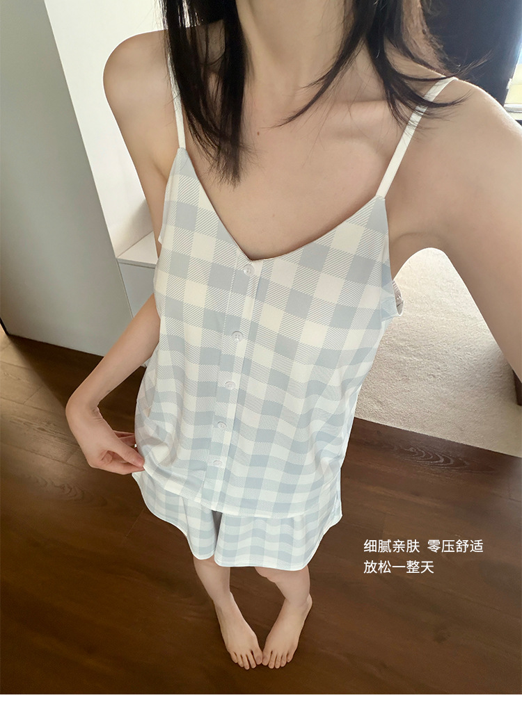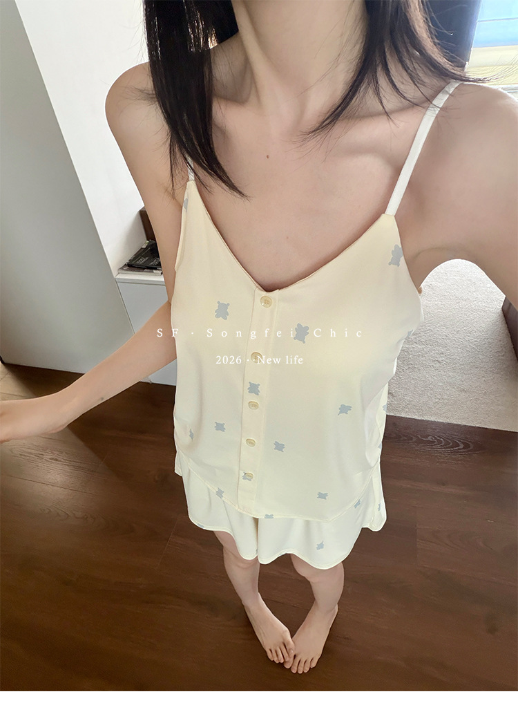 【冰皮带胸垫家居服】夏季女士冰丝凉感吊带睡衣 免穿内衣薄款家居服套装