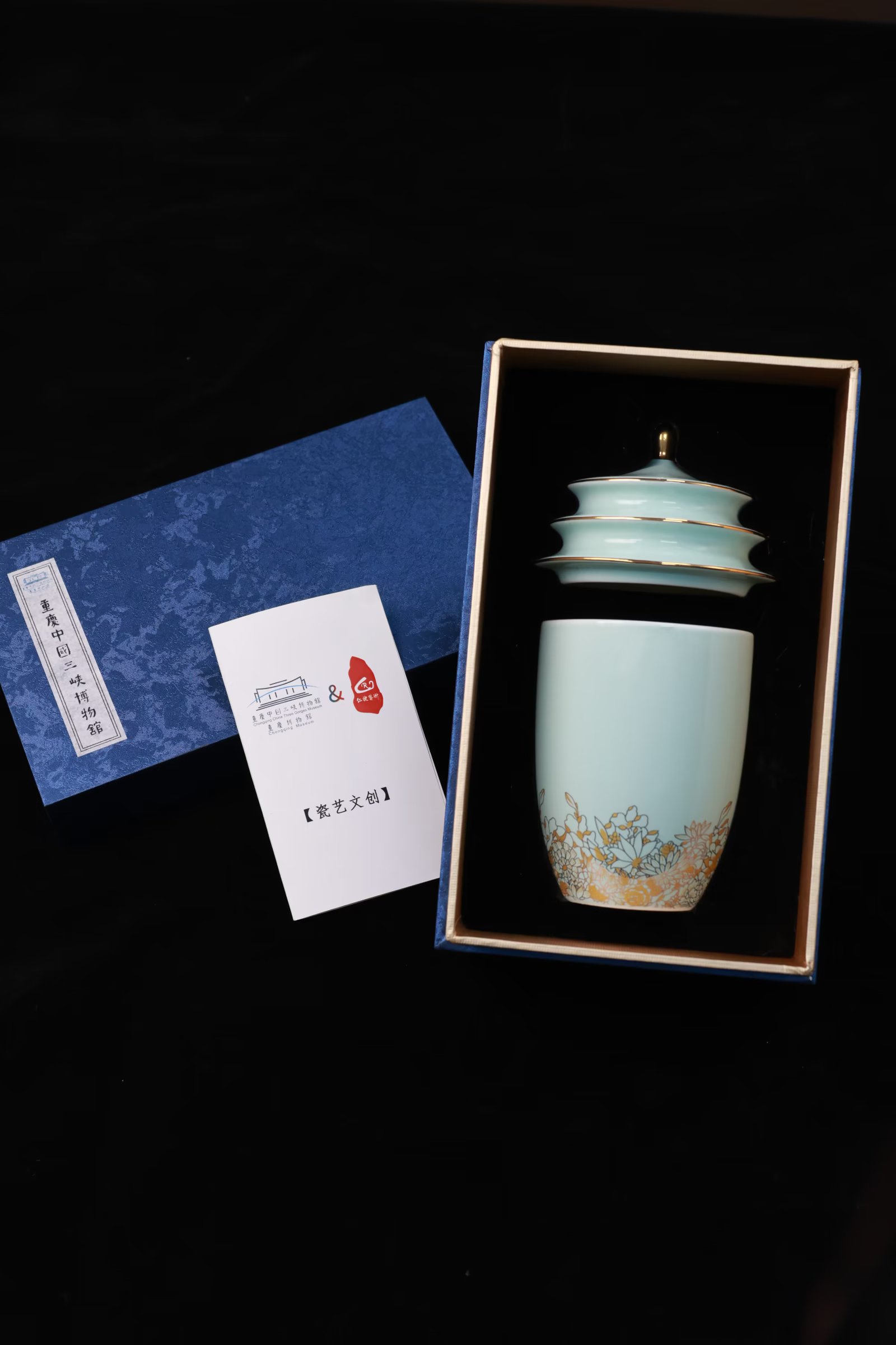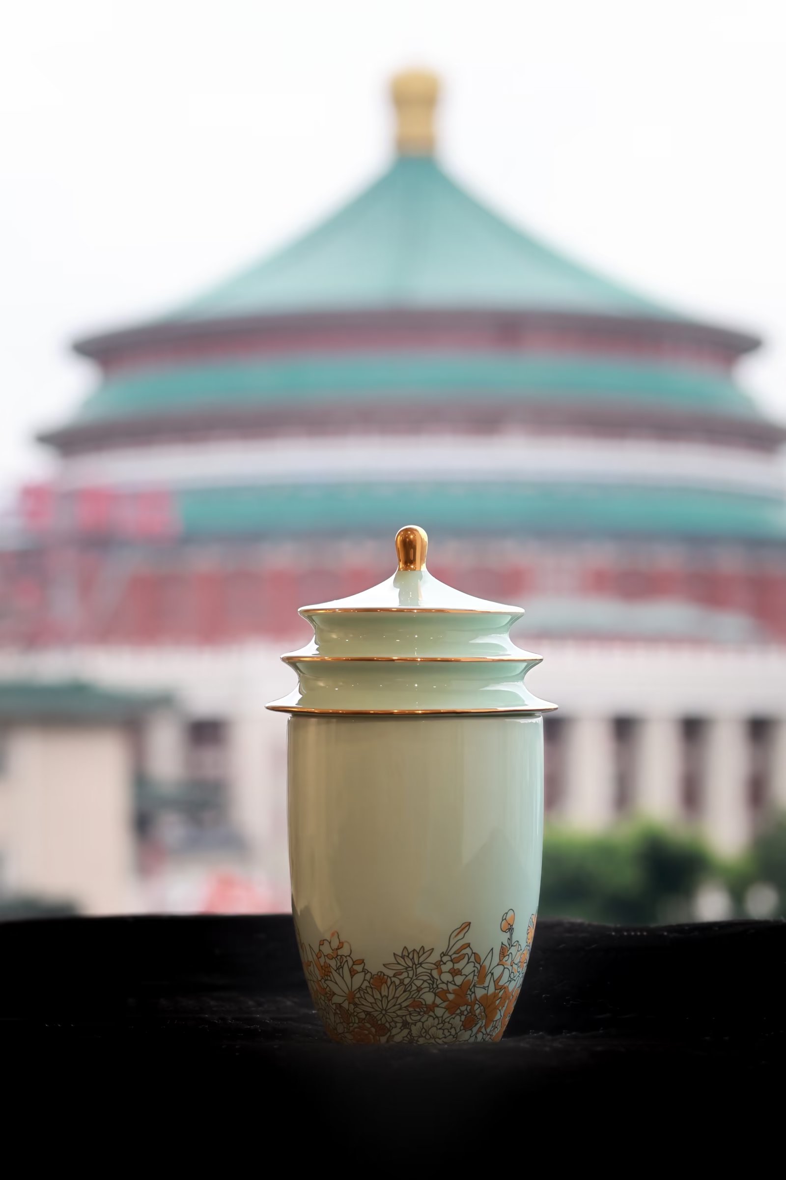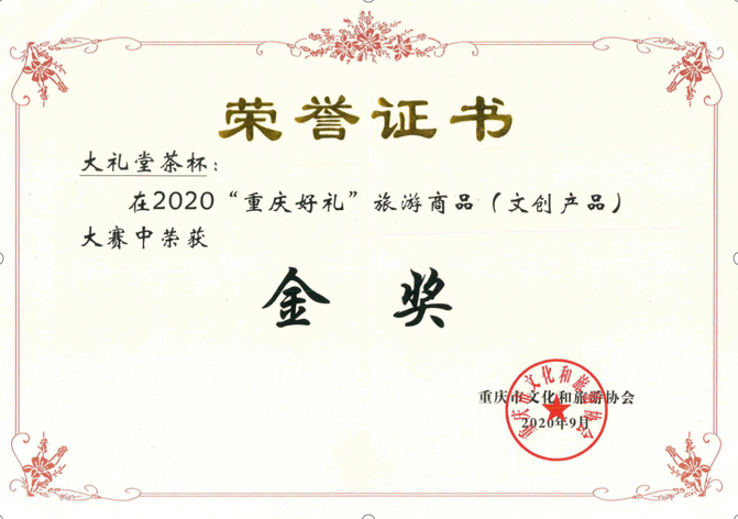 《大礼堂杯》以重庆地标性建筑重庆市人民大礼堂为原型,以大礼堂顶作杯盖和重庆市花山茶花为装饰图案制作而成,造型独特,工艺精良。