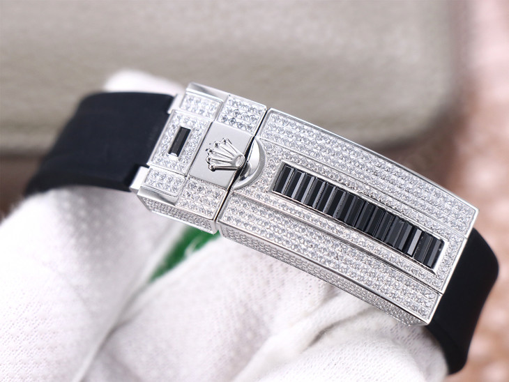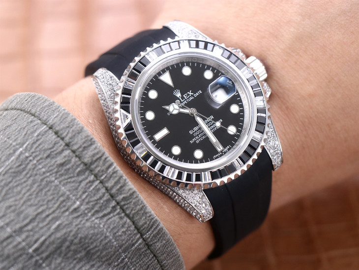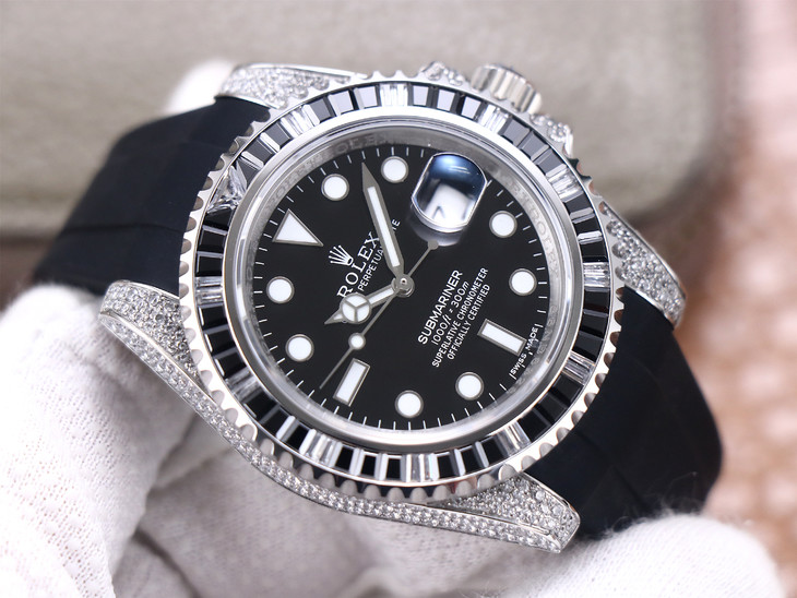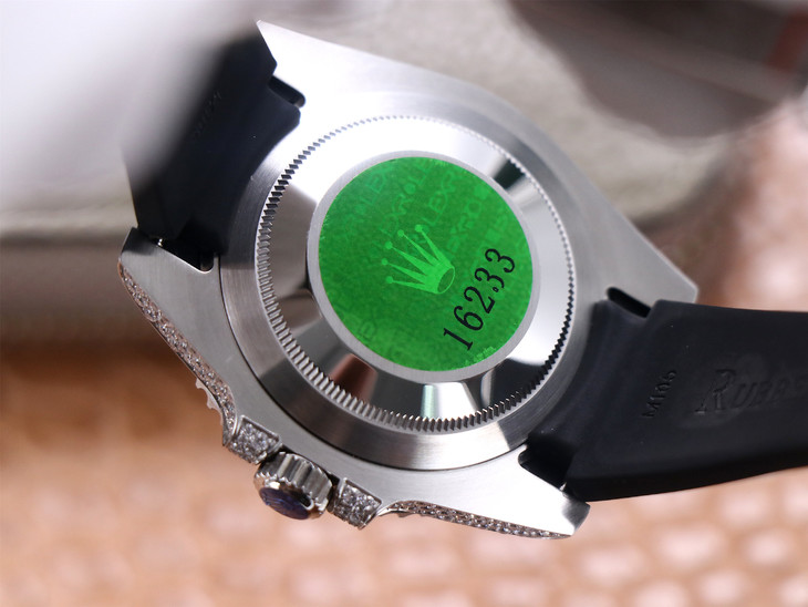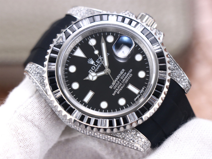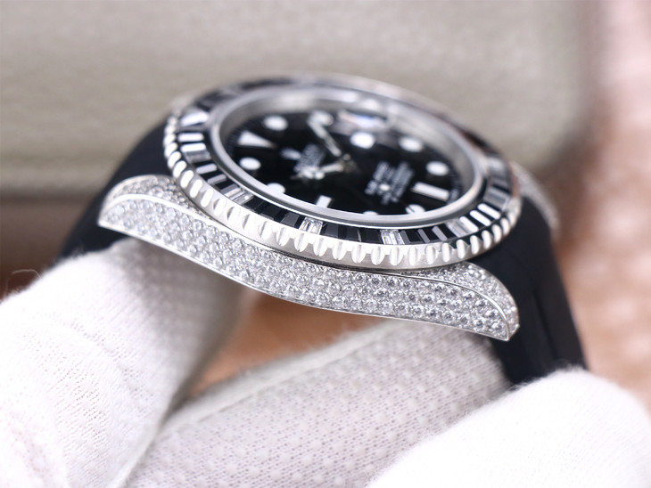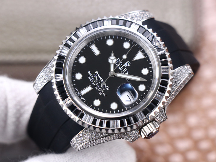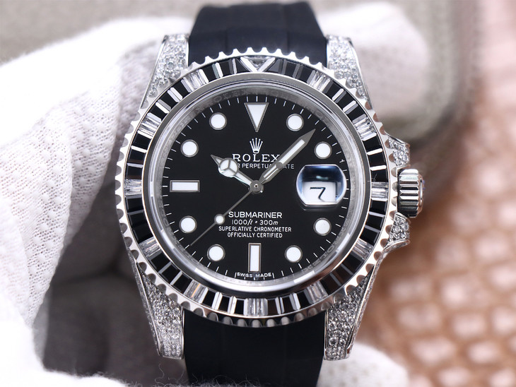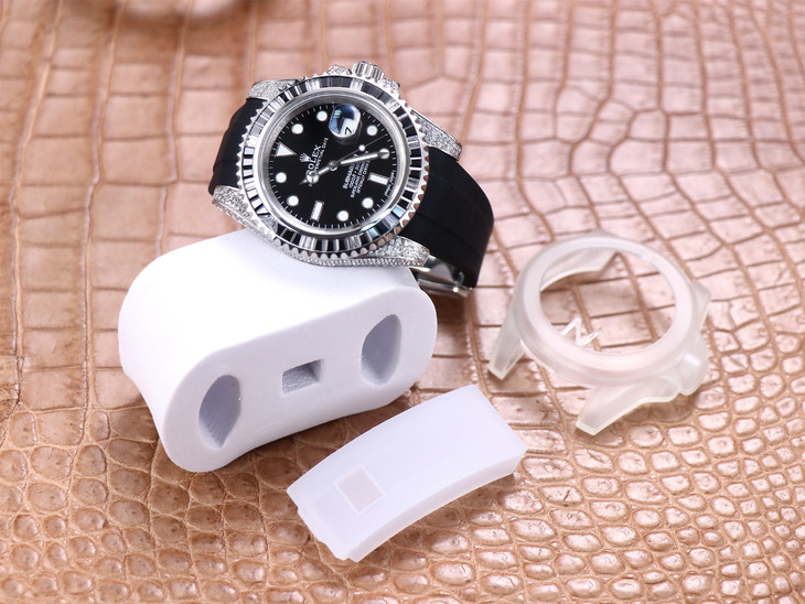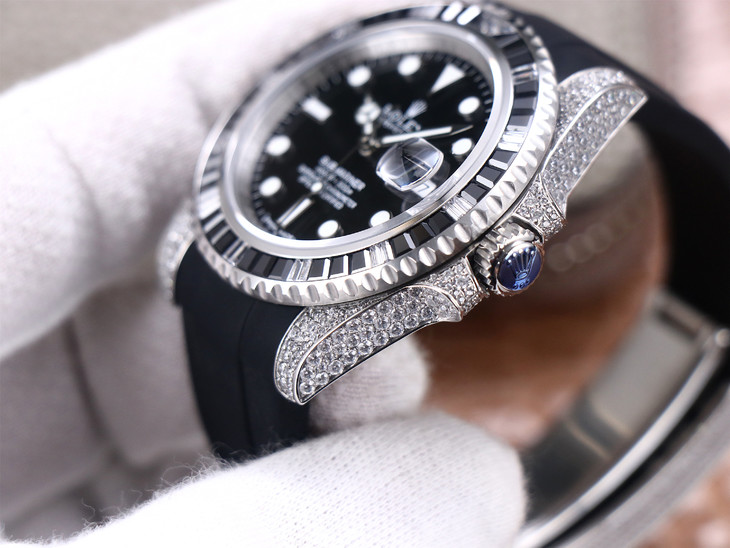 用劳力士最经典的潜航系列水鬼作为原型,表壳表扣均采用顶级904钢,经过圈口的二次改装,镶嵌顶级天然皓石,大闪亮,难度极高,目前同种材质最闪工艺。