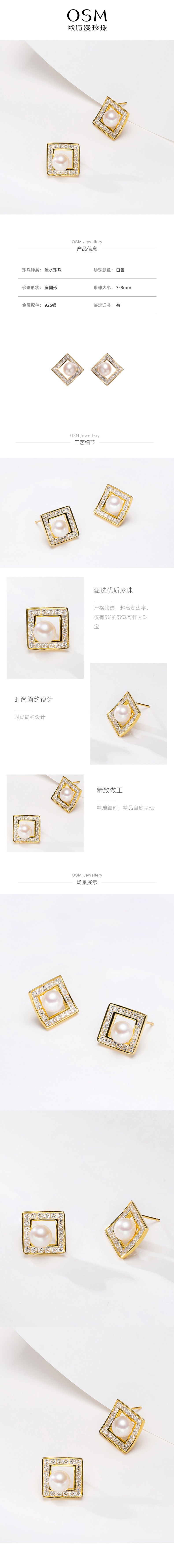 欧诗漫珠宝 珍珠耳钉925银气质款方型耳饰7-8mm扁圆形 尺烬032320