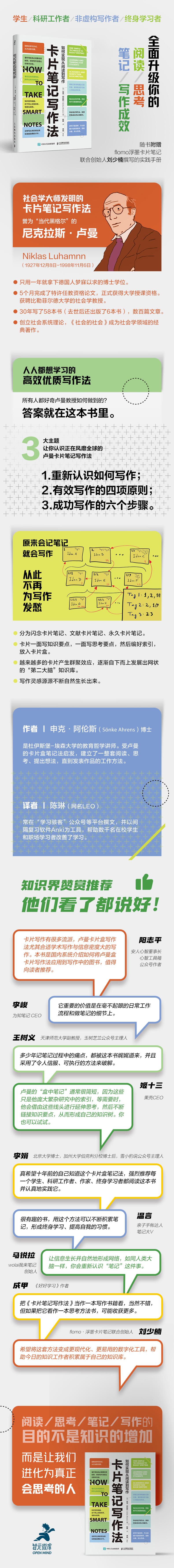 德国学者卢曼使用卡片笔记写作法,积累了9万张知识卡片,一生中出版了58本书和上百篇论文。其实著作等身只需要每天记6张卡片笔记,就能拥有一个能够产生复利效应、受用终生的知识库。这本书是中文综合指南和说明,本书分为三个部分,靠前个部分从写作知识、写作准备、写作能力和注意事项四个角度概述写作的基本问题;第二部分总结了有效写作的四个原则;第三部分是成功写作的六个步骤。书中详细解释了卡片盒笔记写作法的工作原理和具体写作方法,这一方法可以帮助我们将精力集中在真正重要的事情上--思考、理解和提出新的写作思路,而不用将时间浪费在寻找笔记、资料或参考文献上。无论你喜欢用笔和纸,还是喜欢在Windows、Mac或Linux上做笔记都没关系,这个方法都能够被轻松应用。