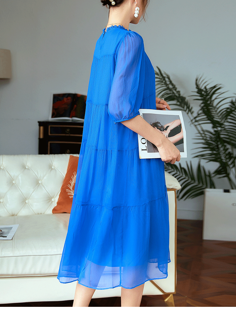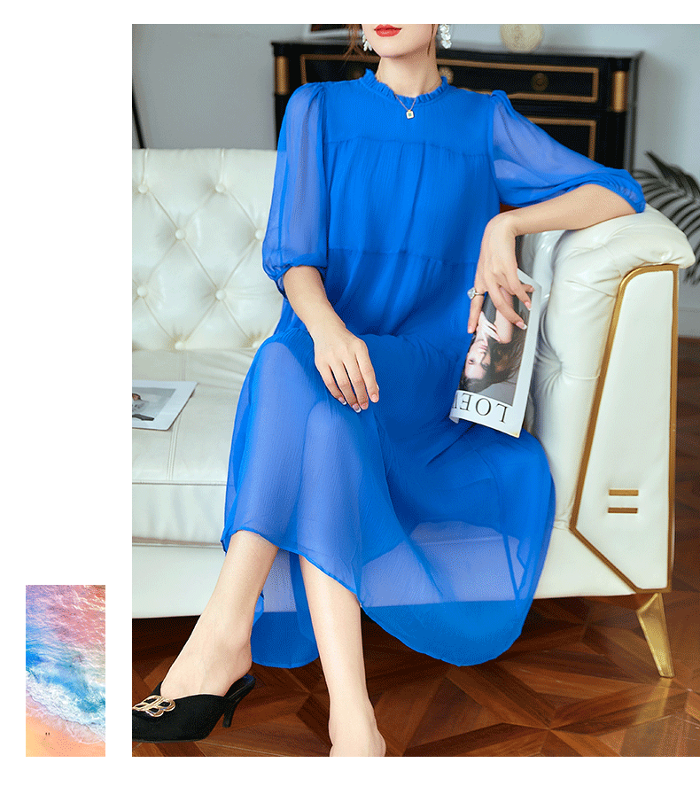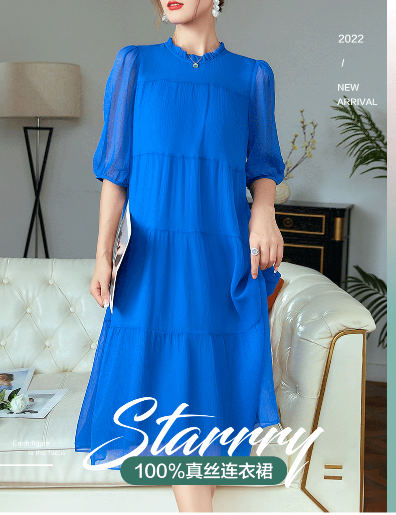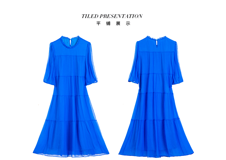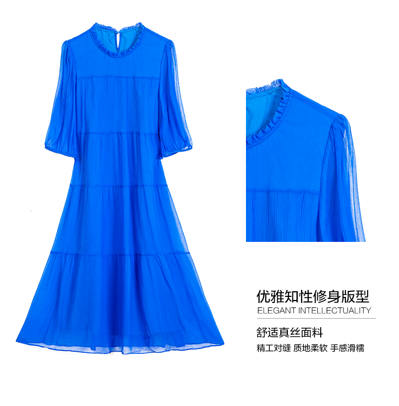 法式气质,新款优雅名媛桑蚕丝克莱因蓝真丝连衣裙SS-002