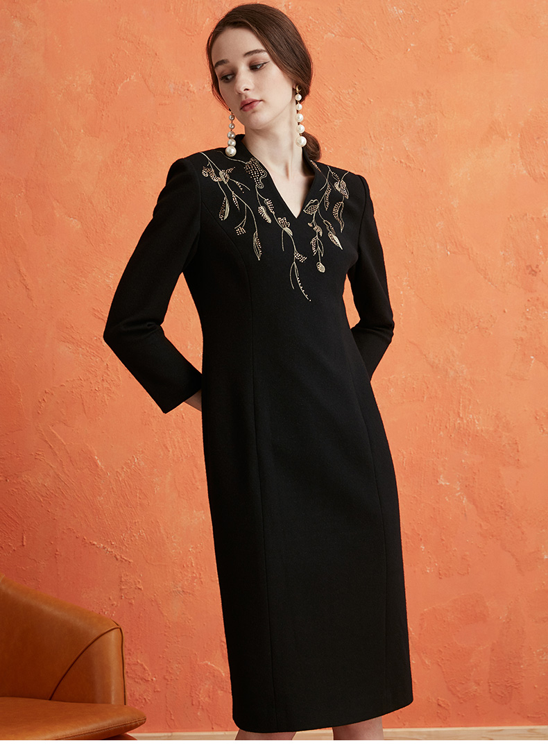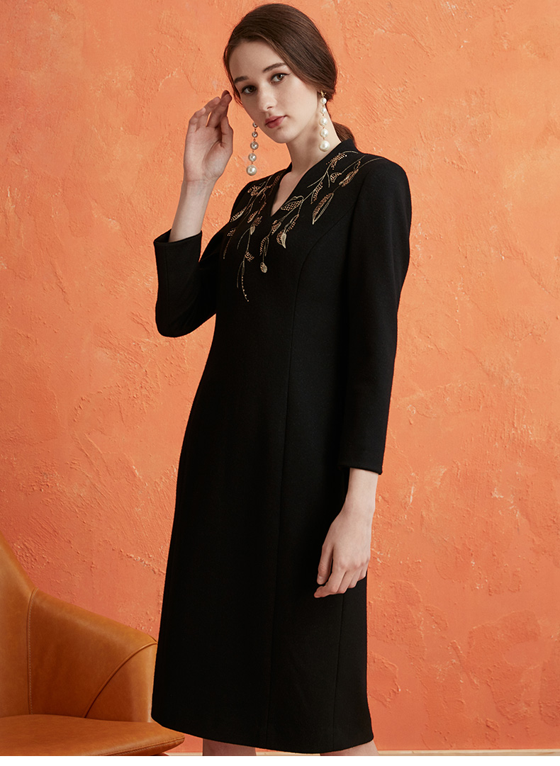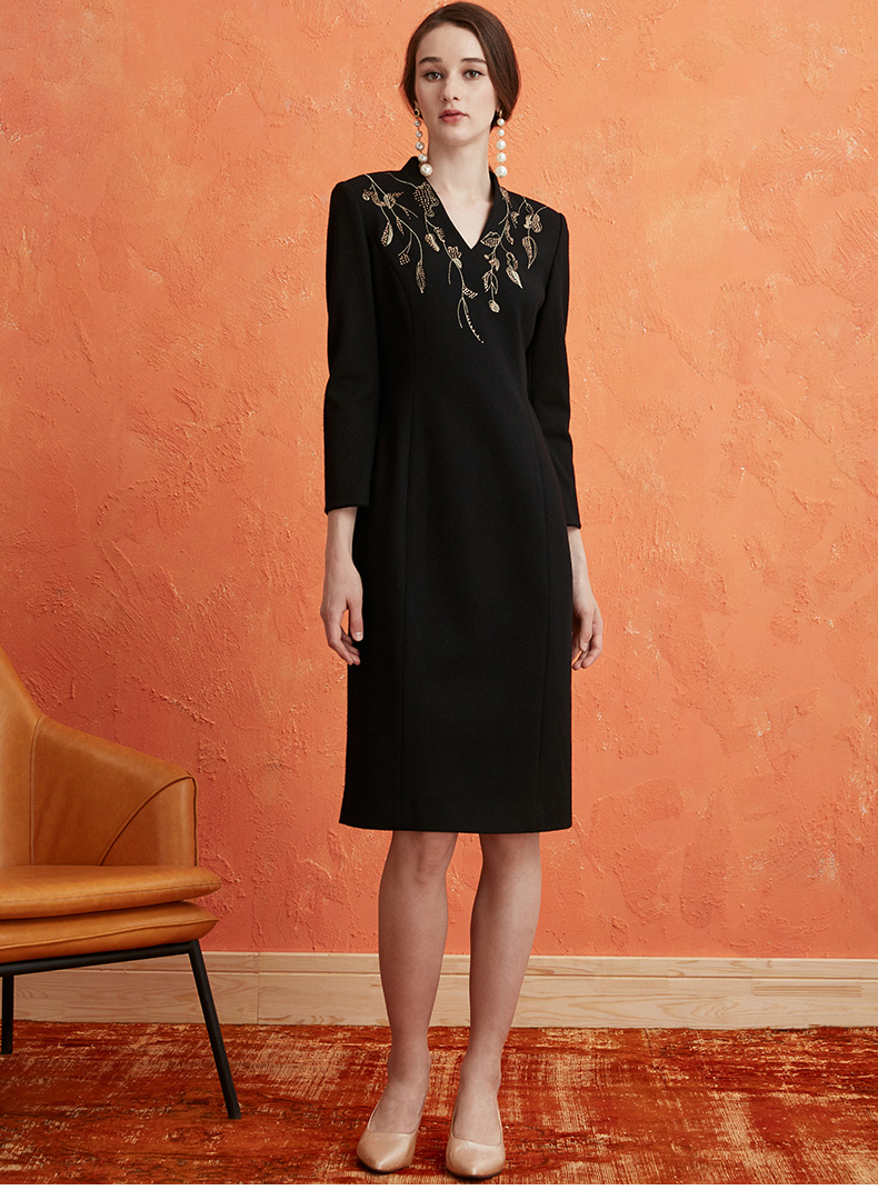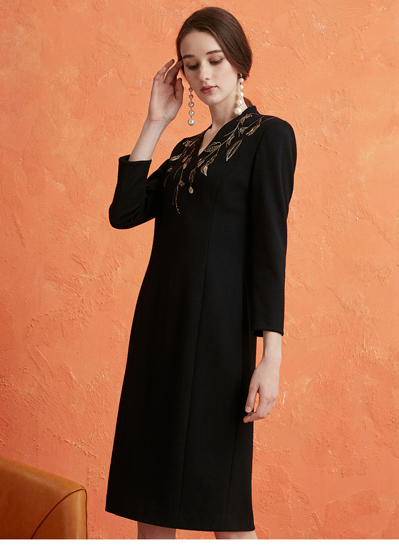 皮尔卡丹女装百搭通勤刺绣V领长袖连衣裙P0427DL20B0