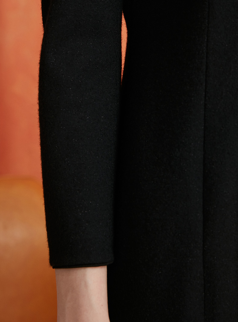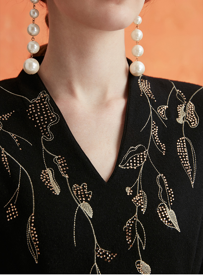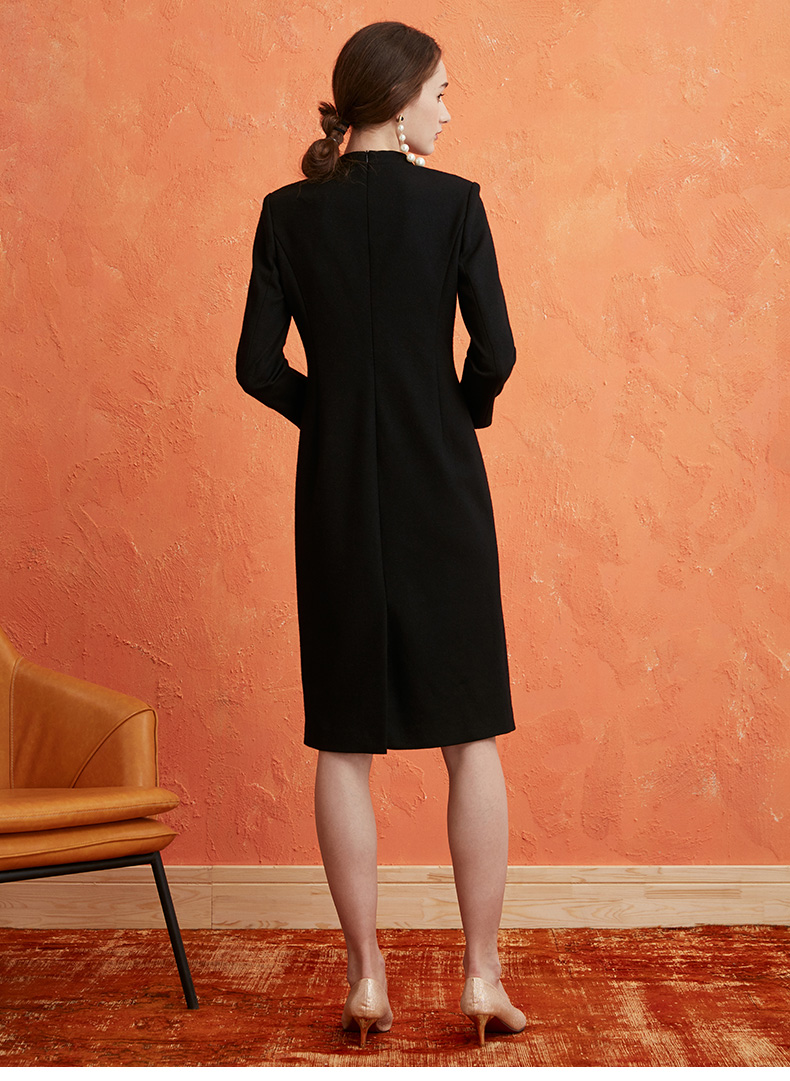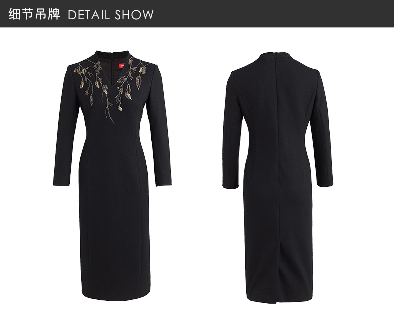 皮尔卡丹女装百搭通勤刺绣V领长袖连衣裙P0427DL20B0