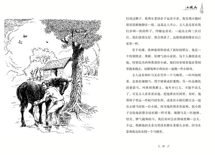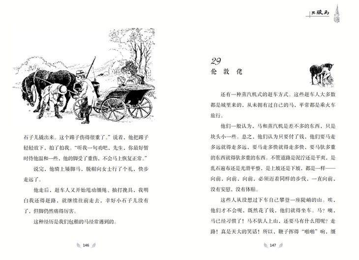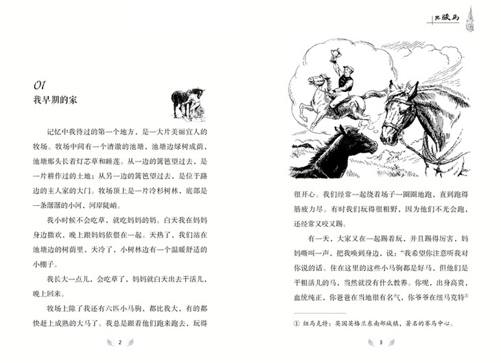 安娜·塞维尔(1820—1878),英国人。她少年时落下残疾,从此行走时便离不开拐杖,她还坚持自己驾驭由一匹矮种马拉的马车到处活动。她身患重病期间历经8年完成了《黑骏马》的创作,作品出版后不久就去世了。《黑骏马》是她唯一一部作品。作品一经出版便轰动欧洲文坛,多年来在世界享有盛名,是颇具代表性和权威性的儿童文学,唤醒了一代又一代读者理解动物、善待动物。