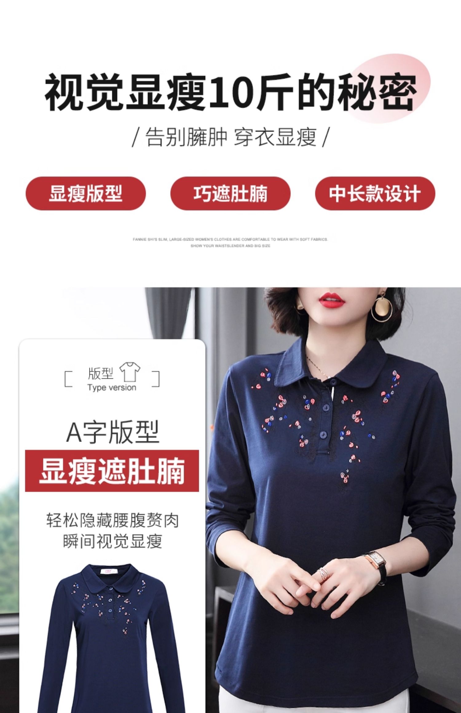 纯棉t恤女长袖中年妈妈翻领上衣大码女装女士春秋新款打底polo衫