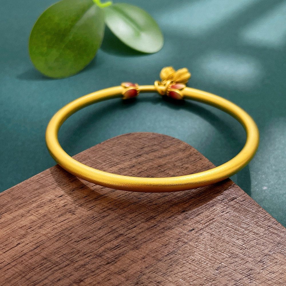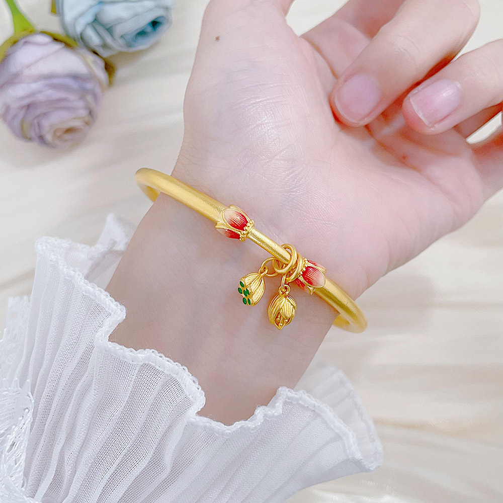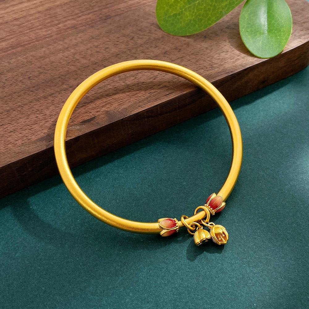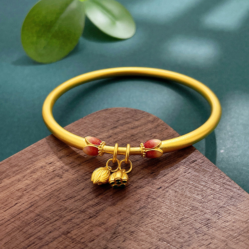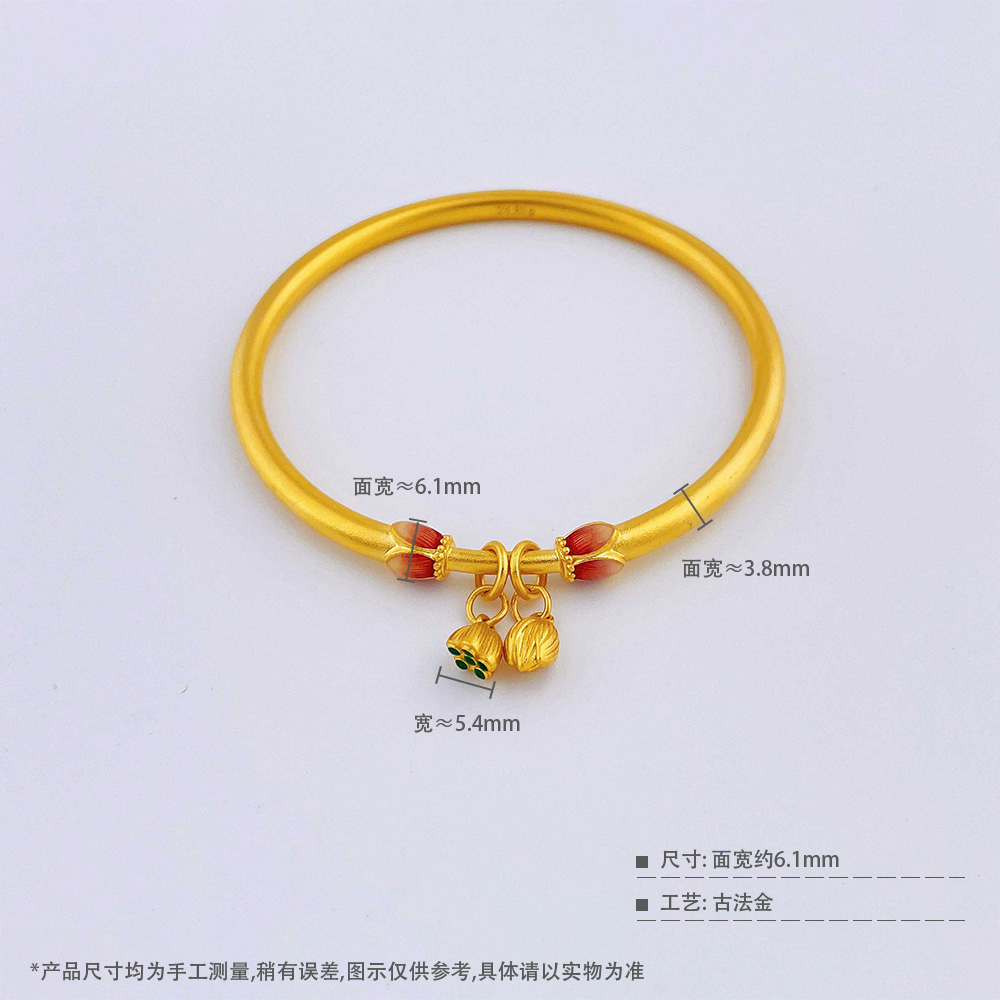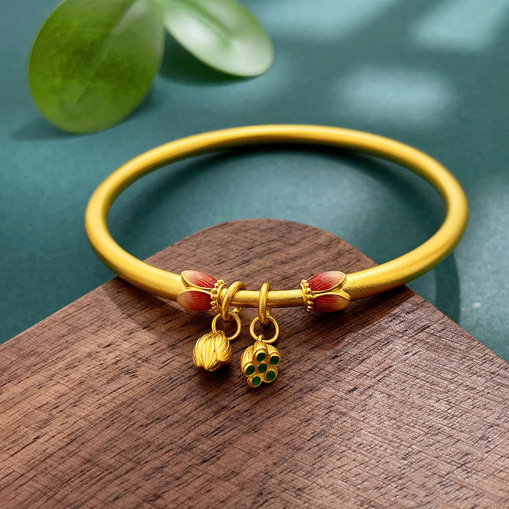 【限时克减150元】足金999 #复古风 #低温珐琅 #两世欢 古法空心固口手镯好运莲莲莲花莲蓬吊饰圆管手镯(YQGFSZ00521))预售产品下单后不退款不退货不换货不补差价