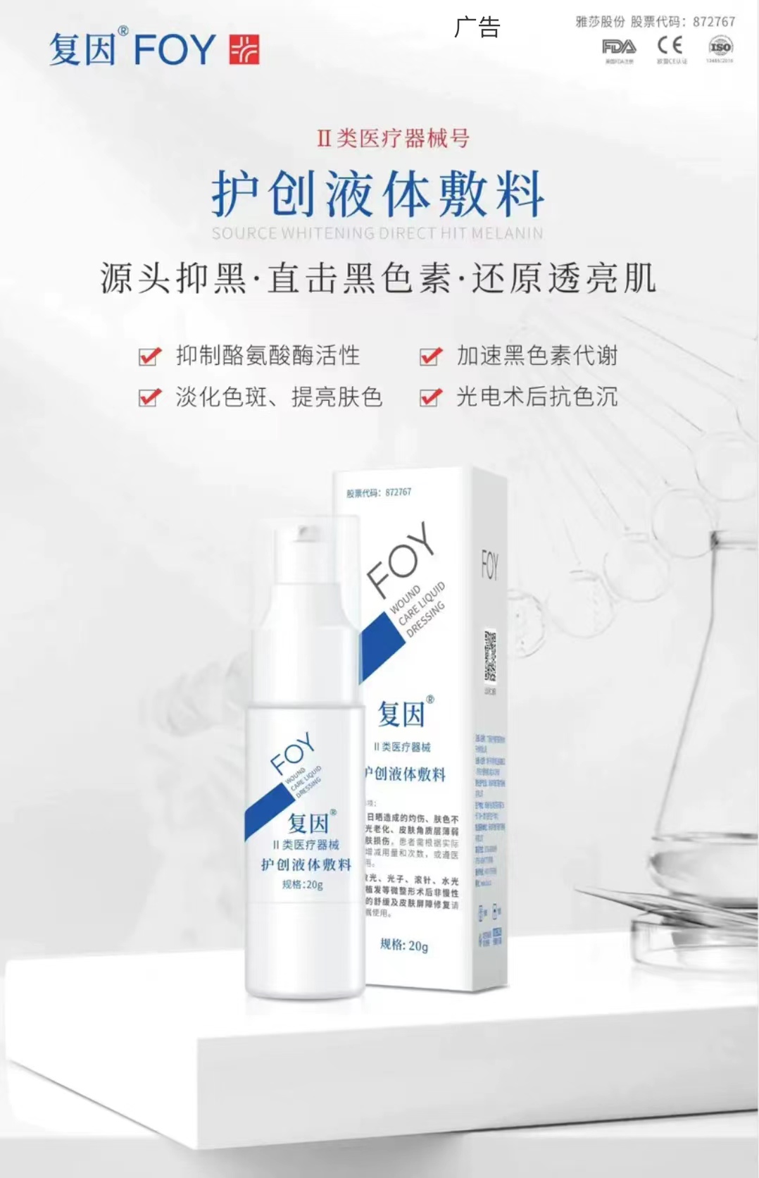 黄褐斑组套:复因医用聚谷氨酸功敷料30g+复因海藻糖修复凝胶30g+雅莎尔清透防晒隔离乳50g+雅莎左旋VC亮肤保湿精华膜(一盒6片)