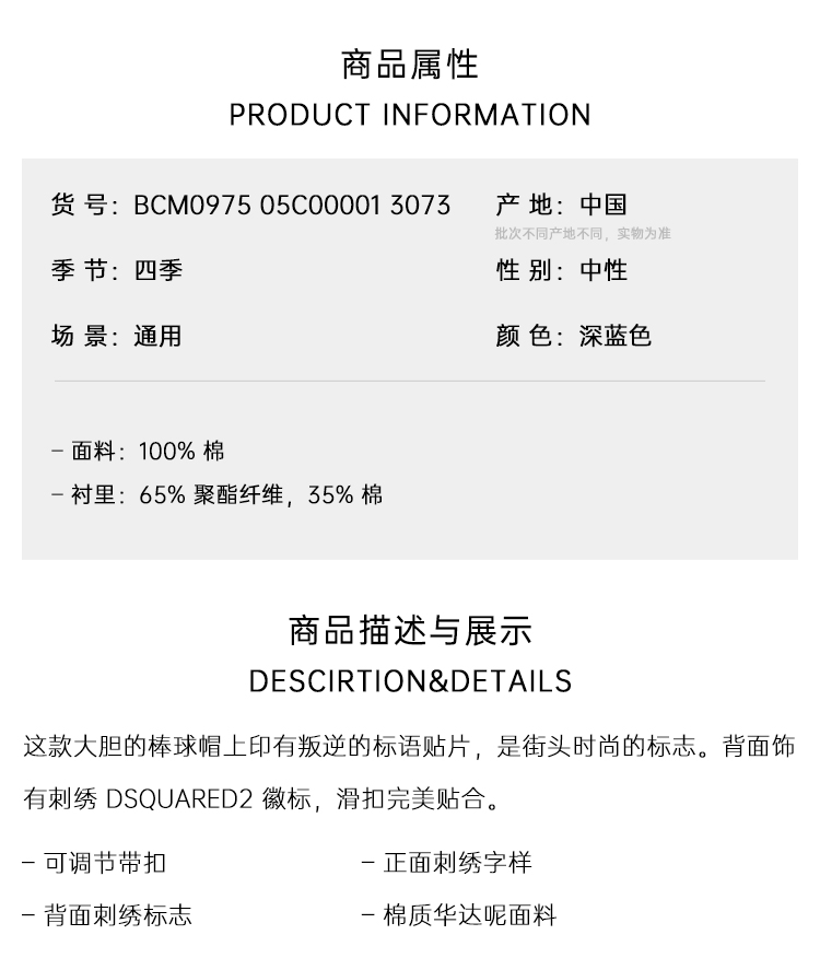 DSQUARED2 中性字母徽刺绣棉质棒球帽 深蓝色 BCM0975 05C00001 3073