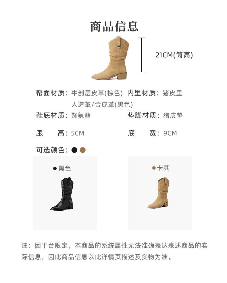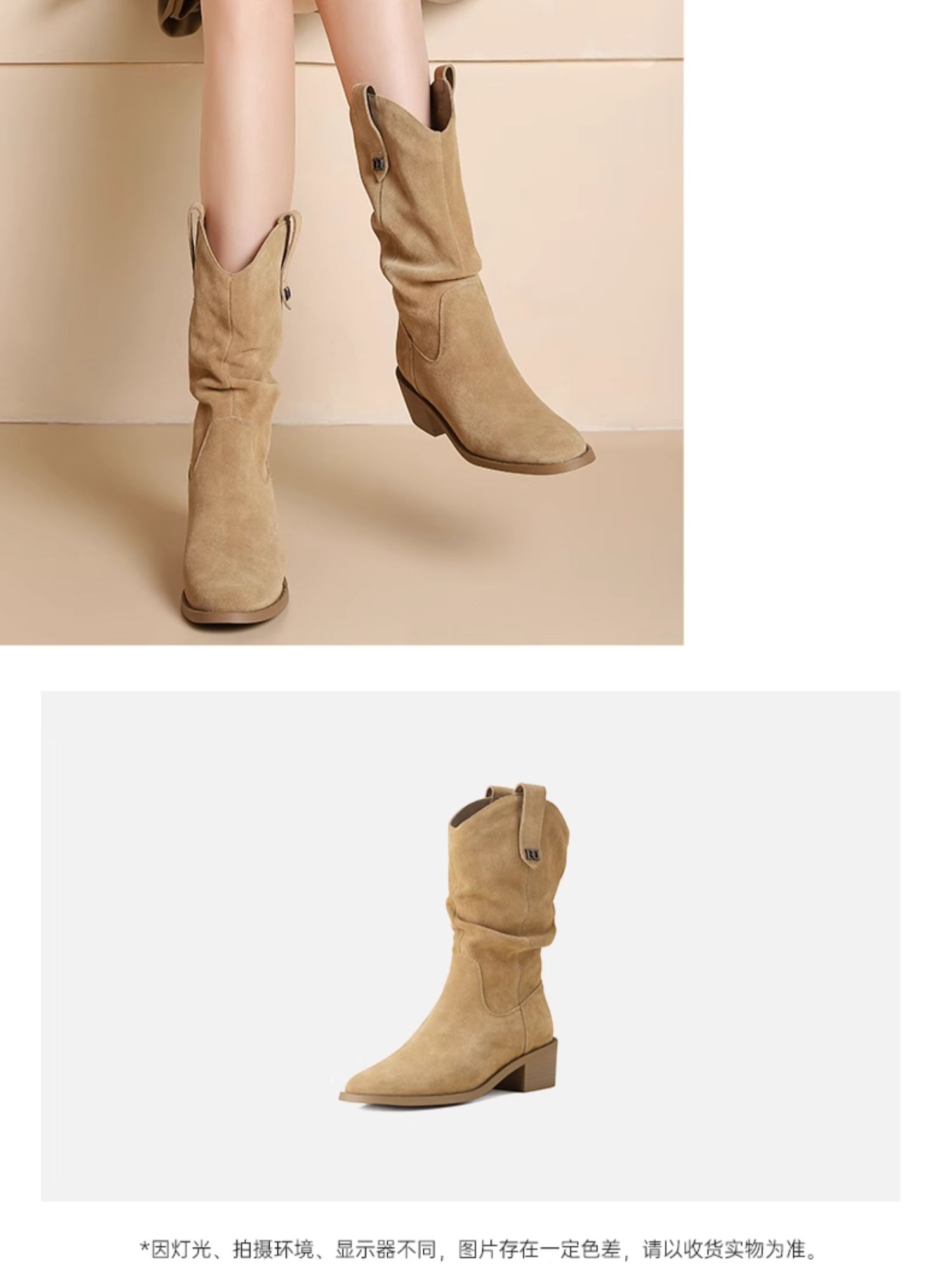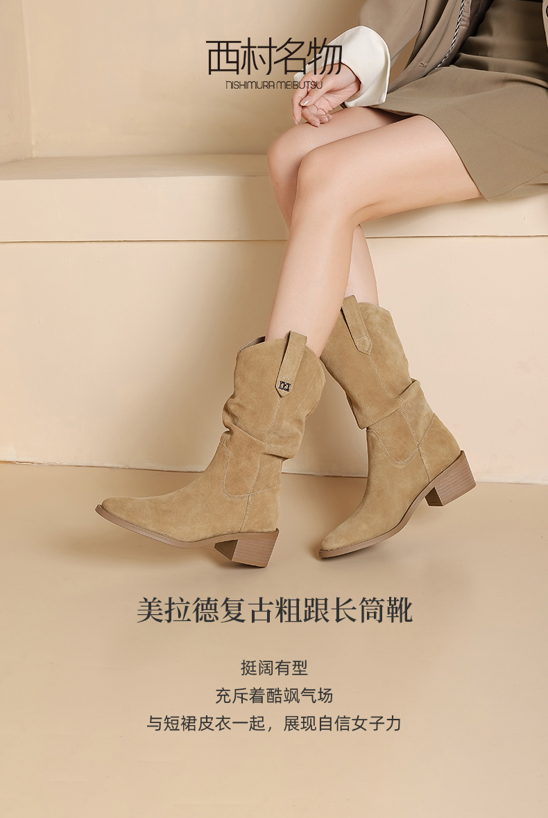 西村名物2024秋冬新款复古英伦风尖头粗跟褶皱美拉德中筒靴女T24DC46861