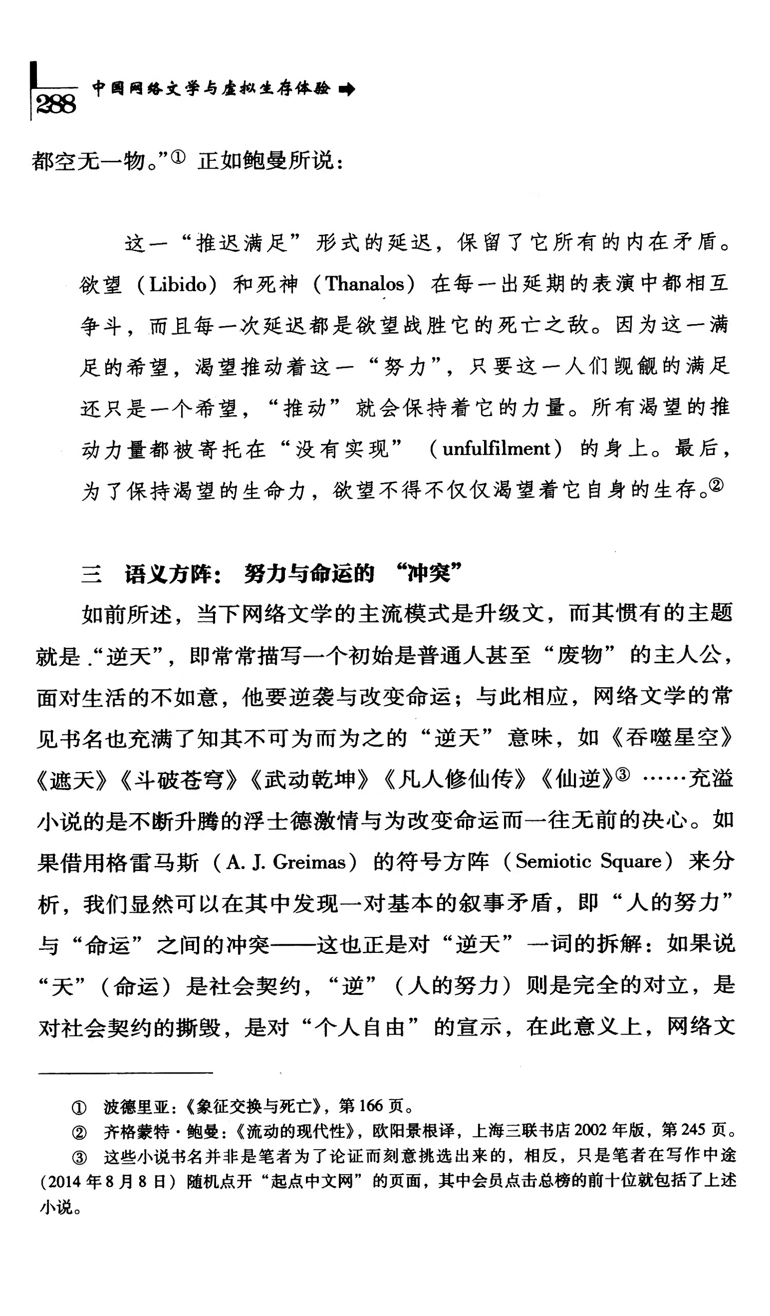 《中国网络文学与虚拟生存体验》立足于中国网络文学的特殊性,深入分析了中国网络文学在商业化、大众化外表下呈现的网络时代的生存体验(虚拟生存体验)。中国网络文学的“架空”表现了网络时代的“世界”观,世界具有了可塑性与跨越性;“随身流”文学表现了网络世界与现代人的伴随关系:重生小说表现了网络生活的“重置”体验及选择的困境;穿越小说表现了虚拟交往的诸种情形及其症候;网络文学的升级模式则呈现了数码浪漫主义与网络新青年的个人奋斗。中国网络文学的繁荣在世界上独树一帜,蕴含于中国网络文学中的虚拟生存体验表现了网络社会来临后的社会、文化与文学的走向与变迁,构成了中国网络文学的独特价值,具有重要的世界意义。我们应辩证理解中国网络文学的成就及其未来发展趋势,提升其思想文化境界和艺术水平,使之为中国的国家战略发展做出自己应有的贡献。