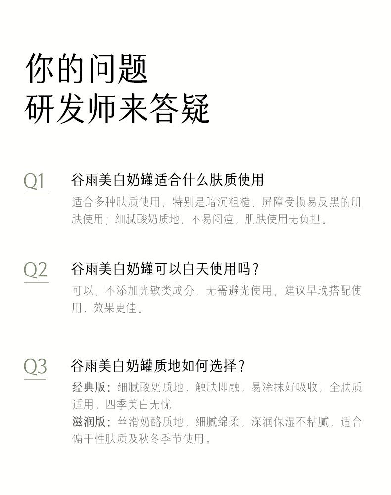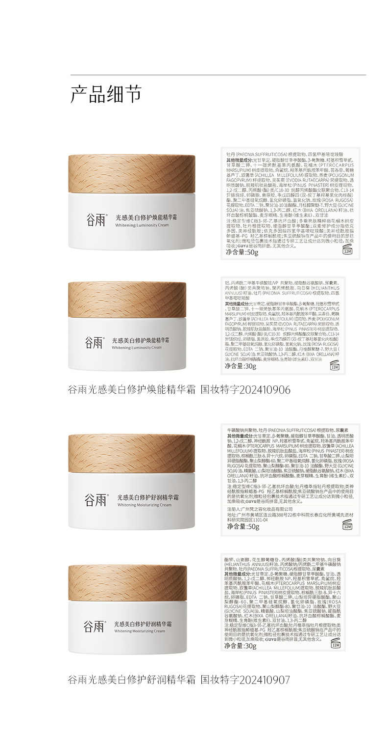 - 谷雨,更适合中国人肤质的植萃美白。专研中华珍稀美白植萃光甘草定,深入研究中国人肤质特点,打造中国女性独有的仙气白。