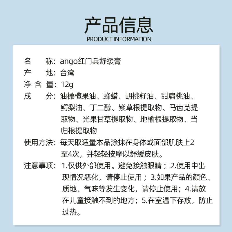 台湾Ango安购红门兵草本舒缓膏蚊虫叮咬膏驱蚊防蚊止痒舒缓紫草膏