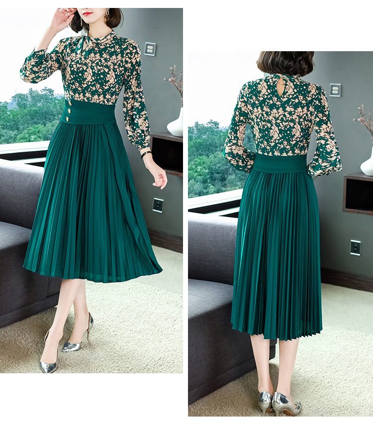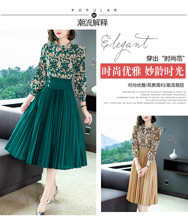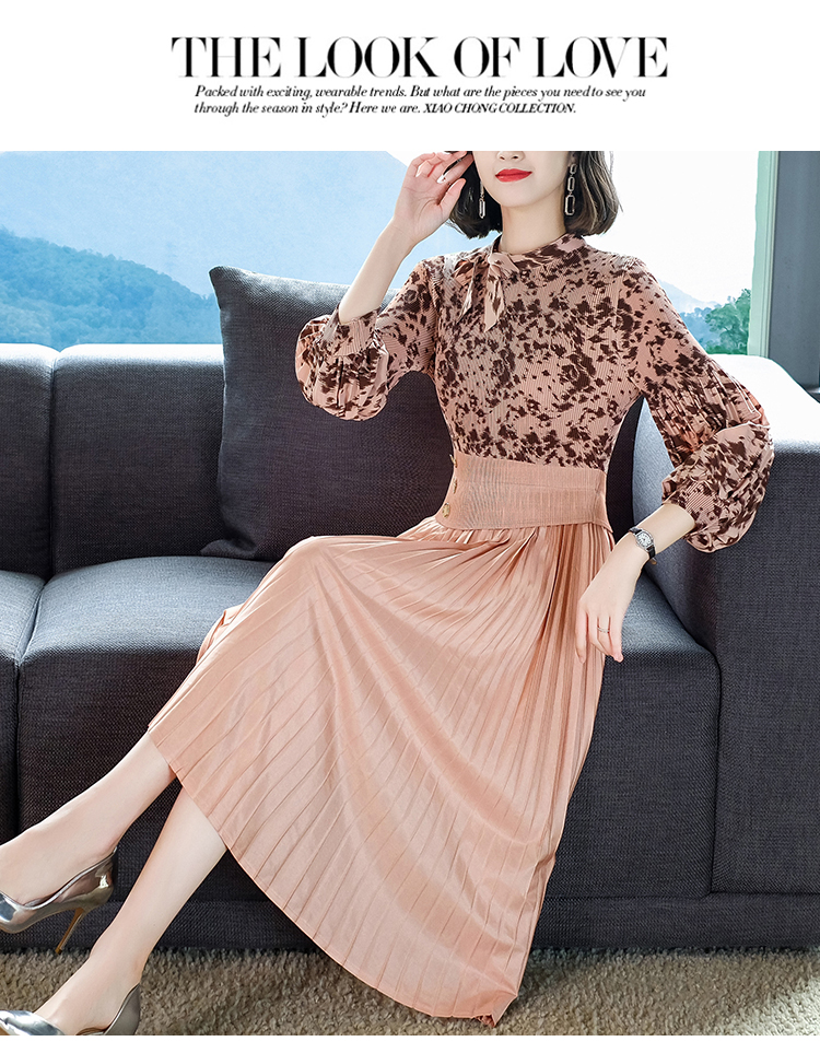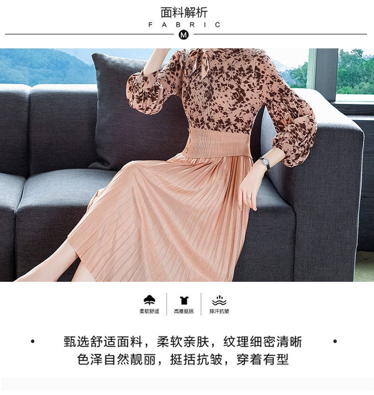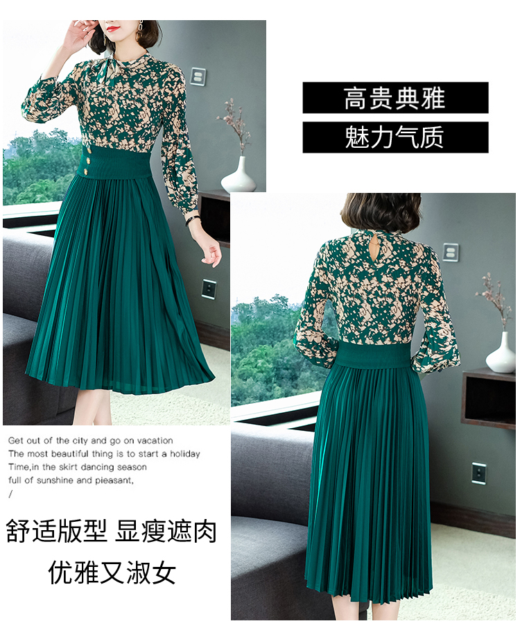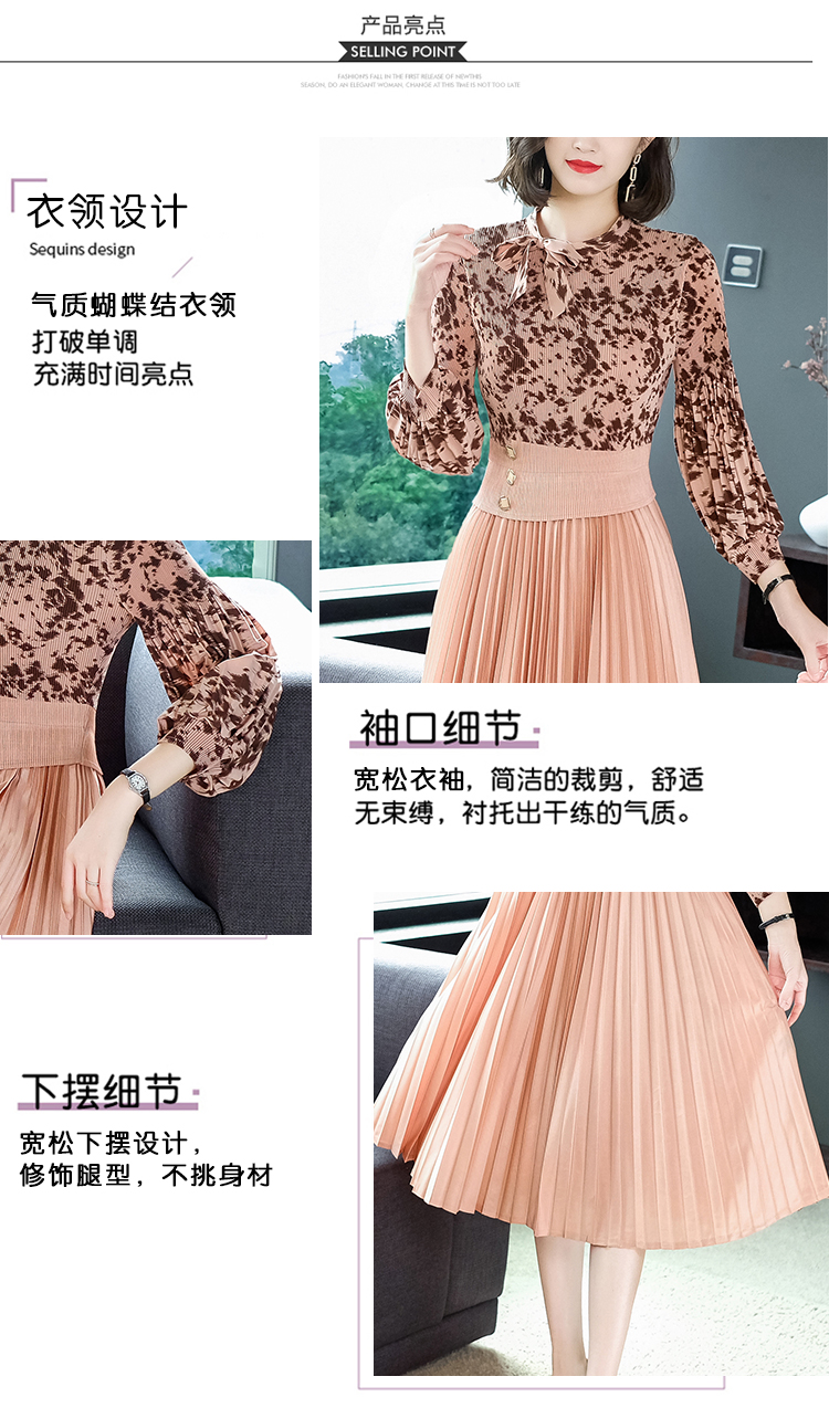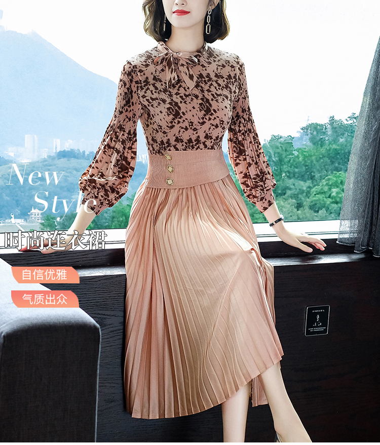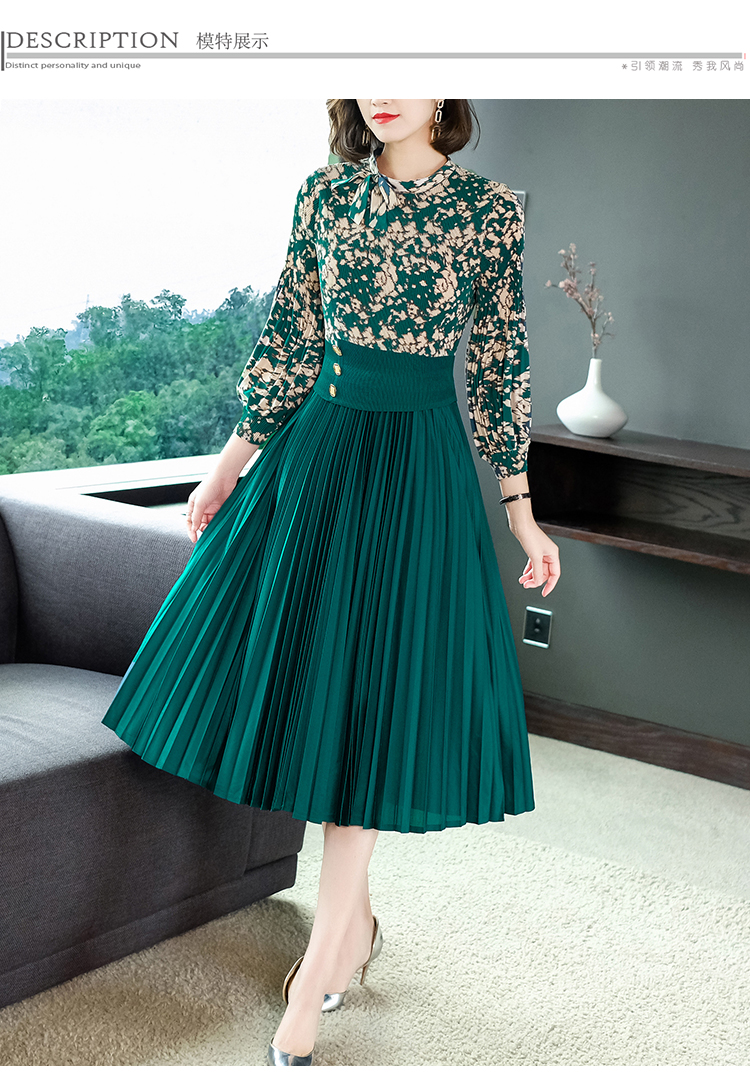 2022秋季新款时尚洋气碎花百褶修身显瘦过膝中长款褶皱连衣裙NSM2078