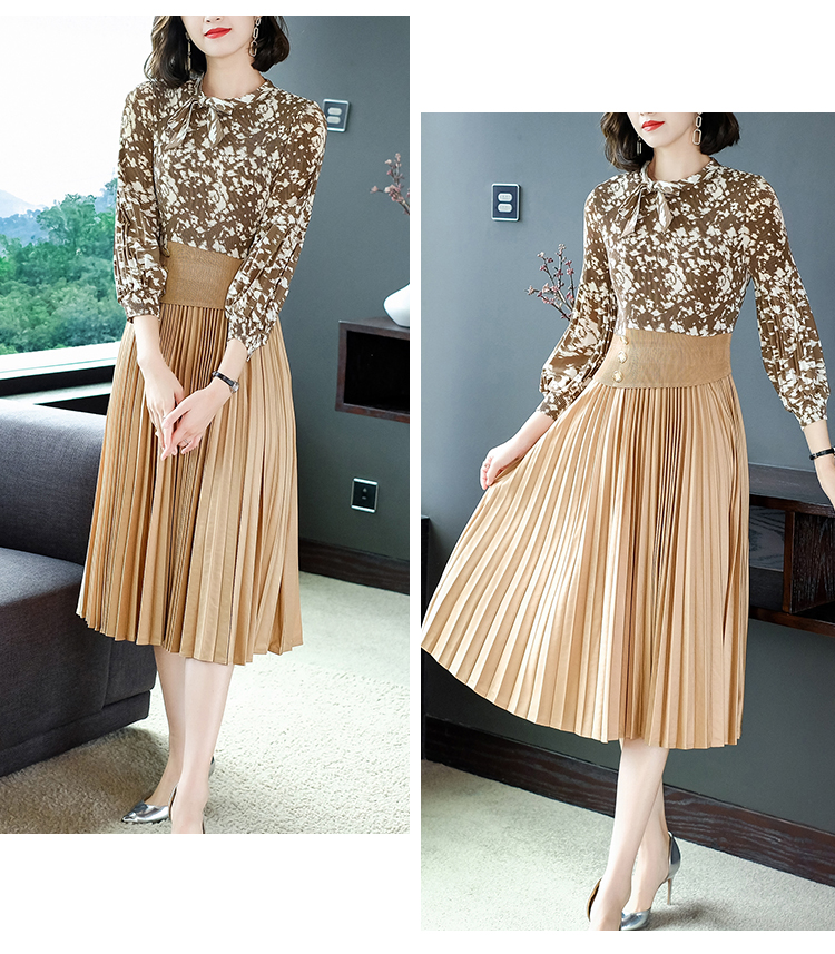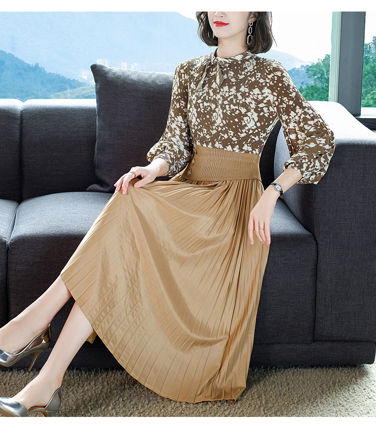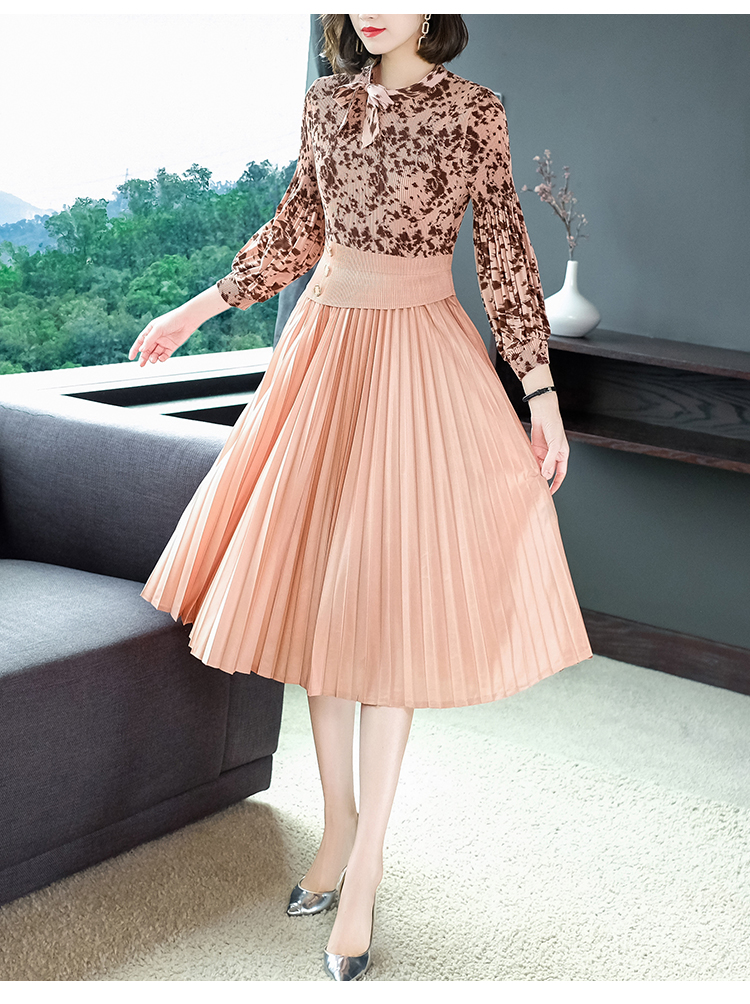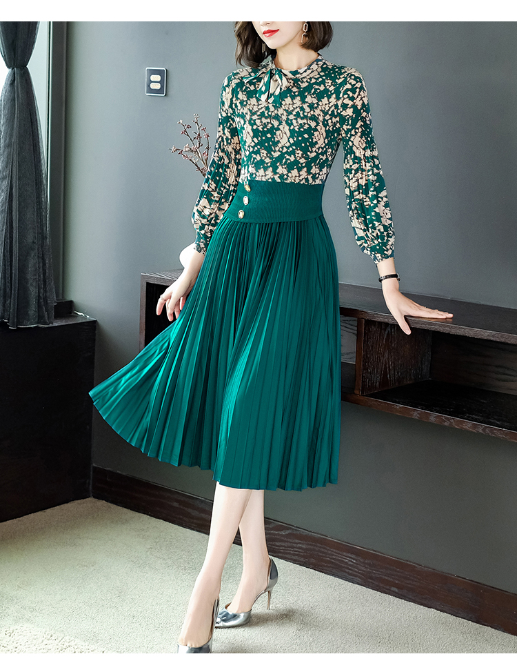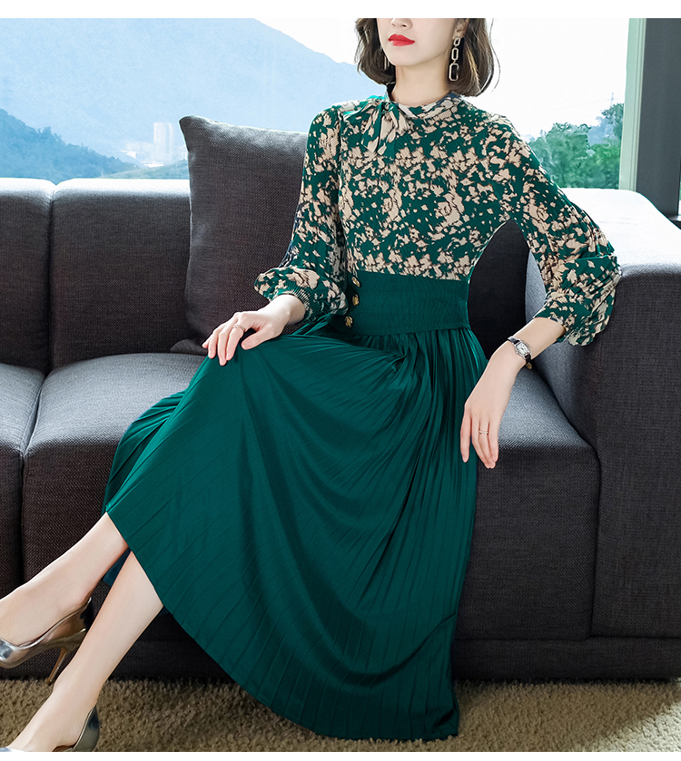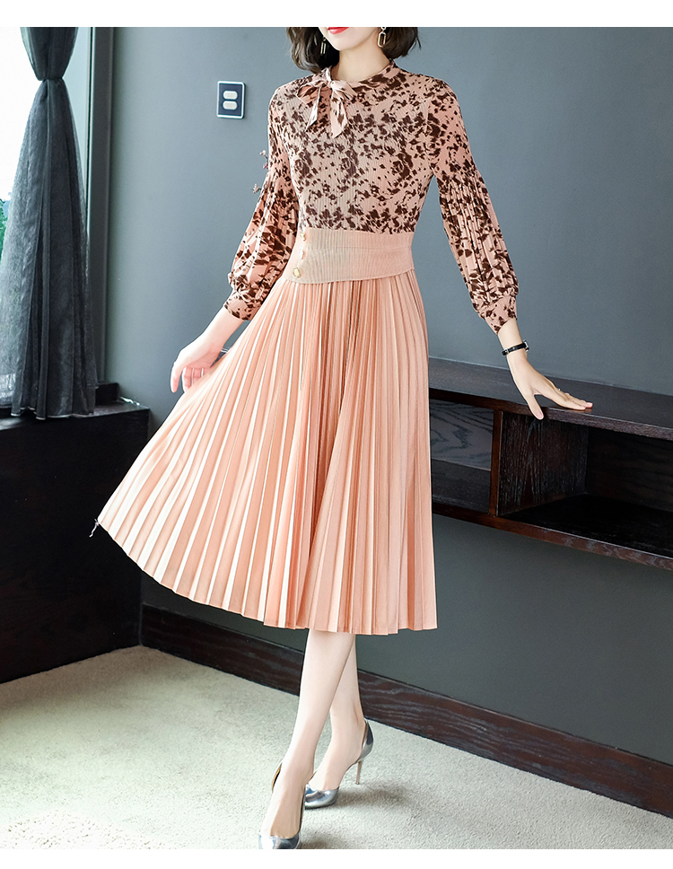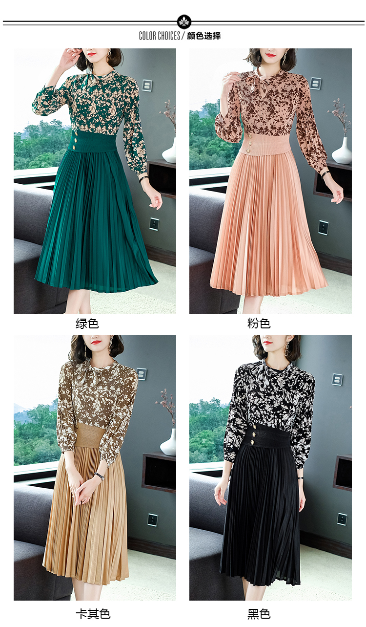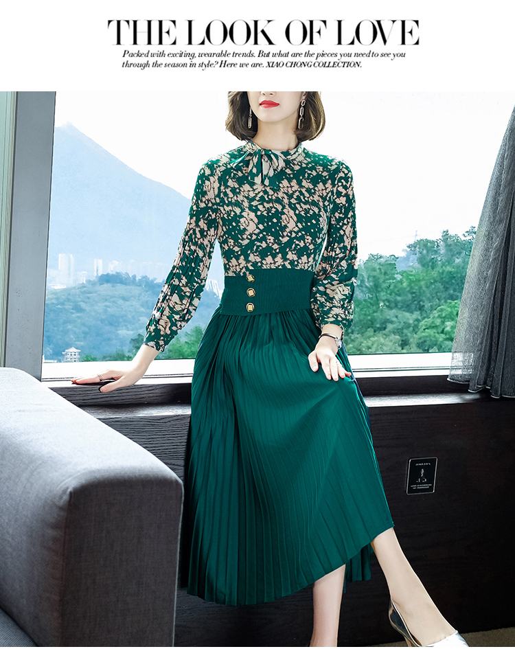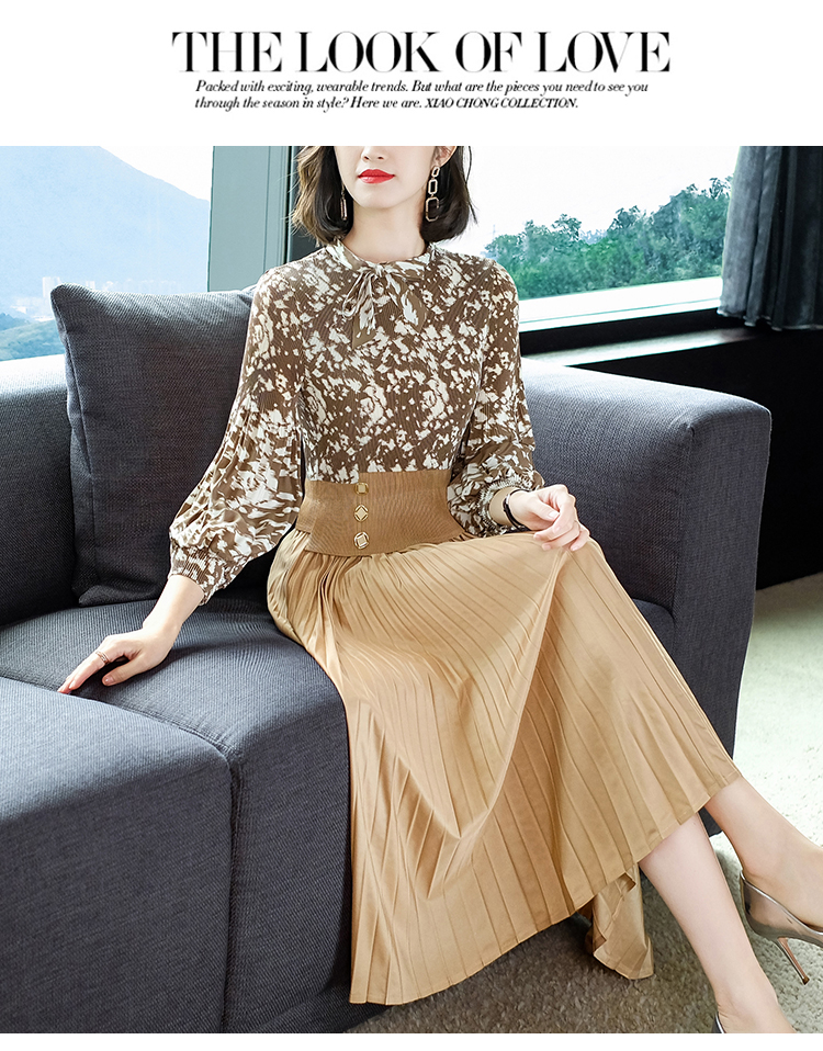 2022秋季新款时尚洋气碎花百褶修身显瘦过膝中长款褶皱连衣裙NSM2078