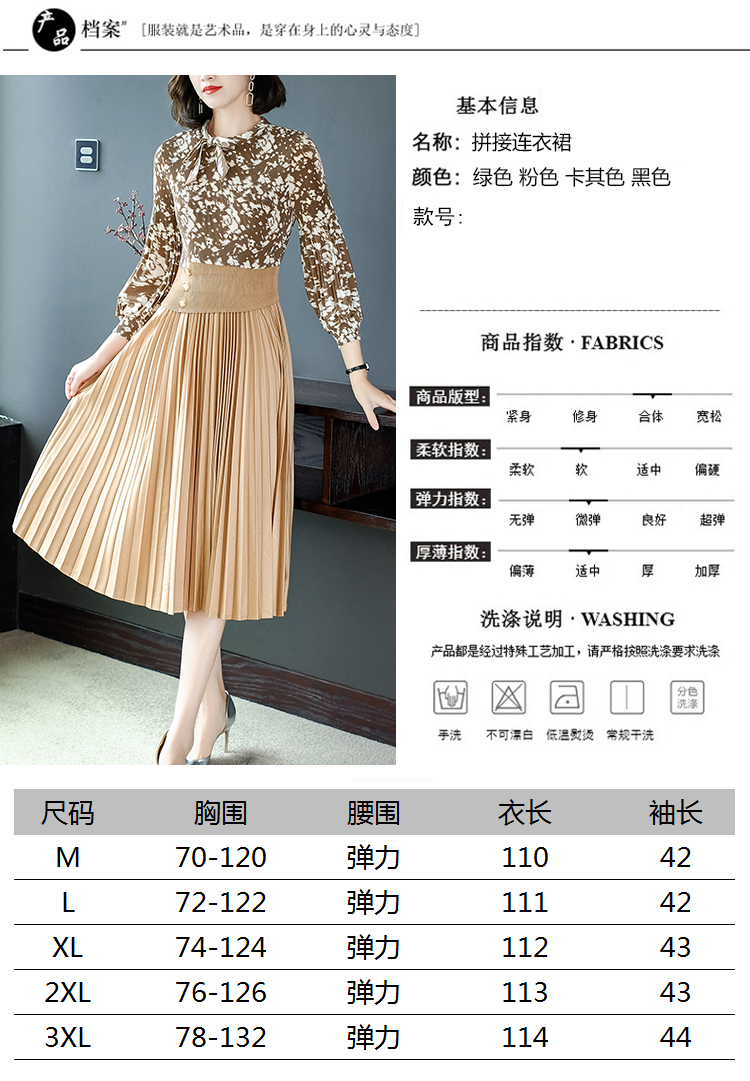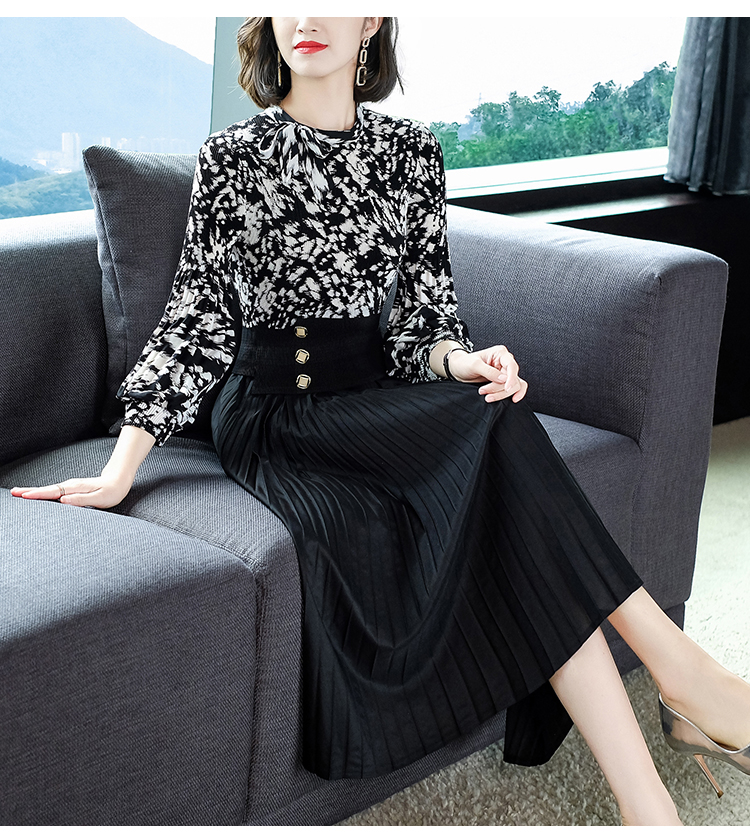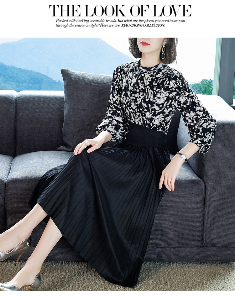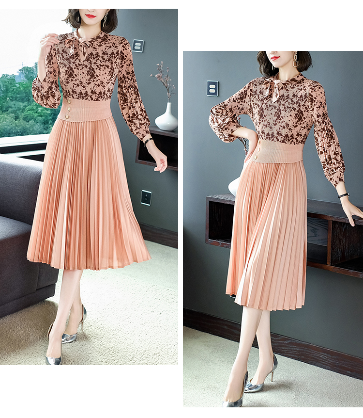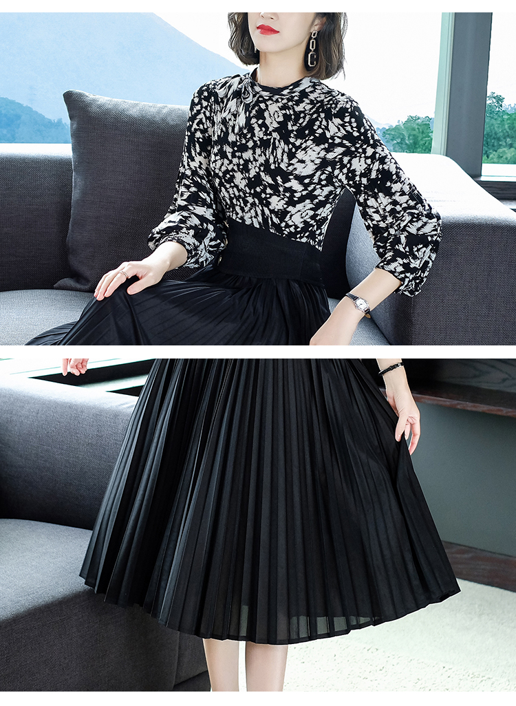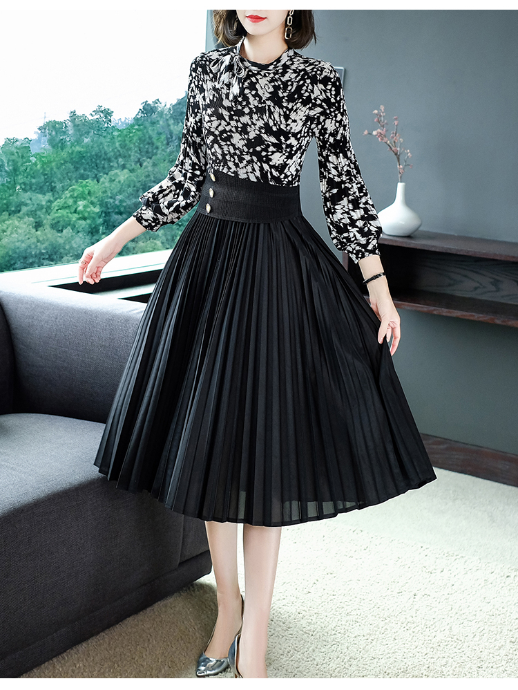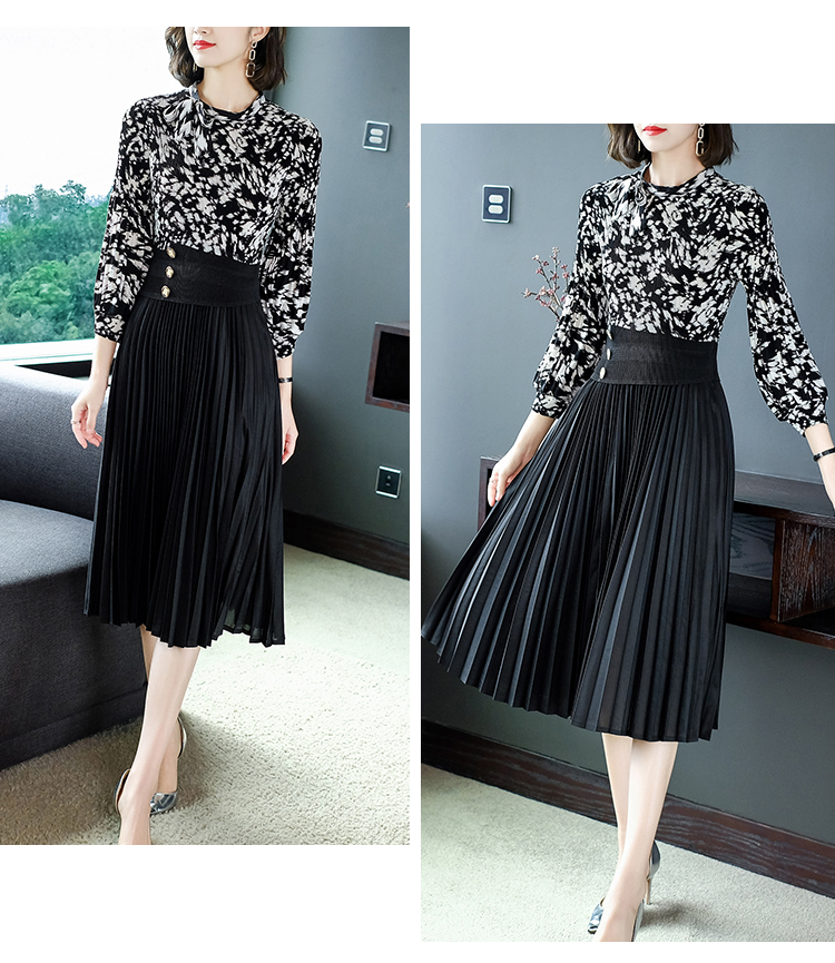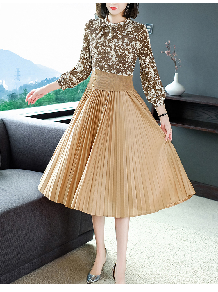 2022秋季新款时尚洋气碎花百褶修身显瘦过膝中长款褶皱连衣裙NSM2078