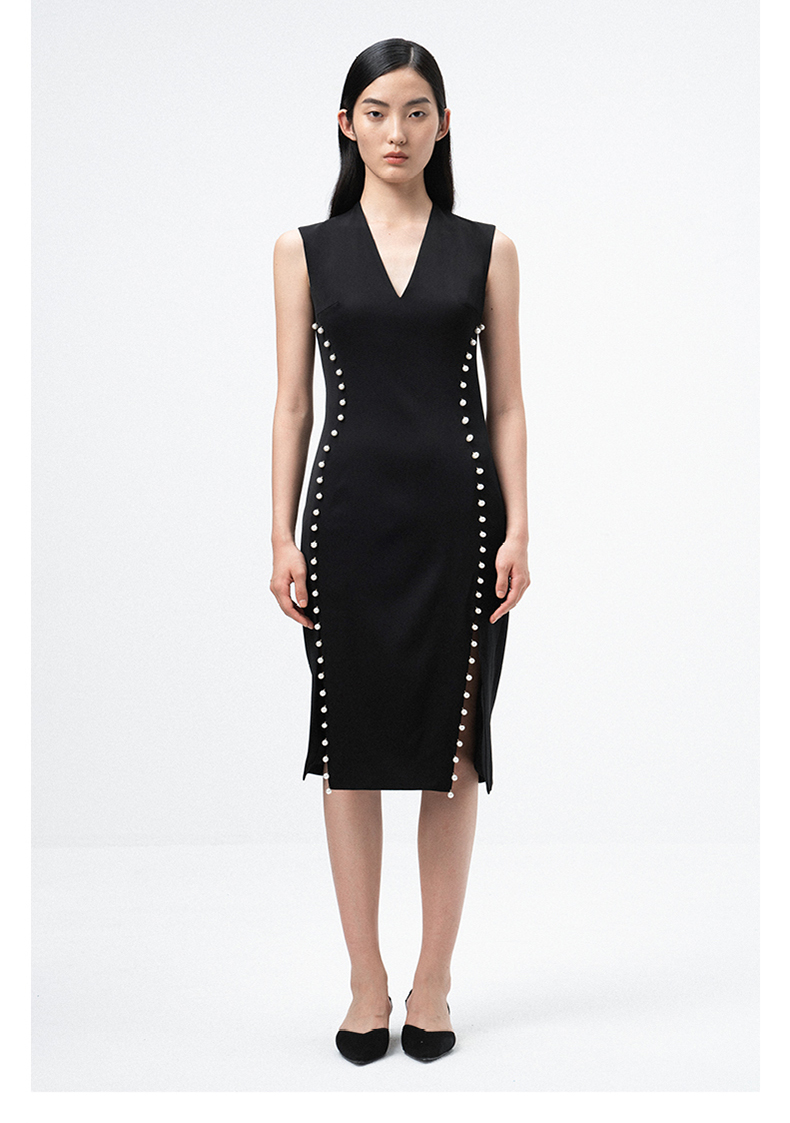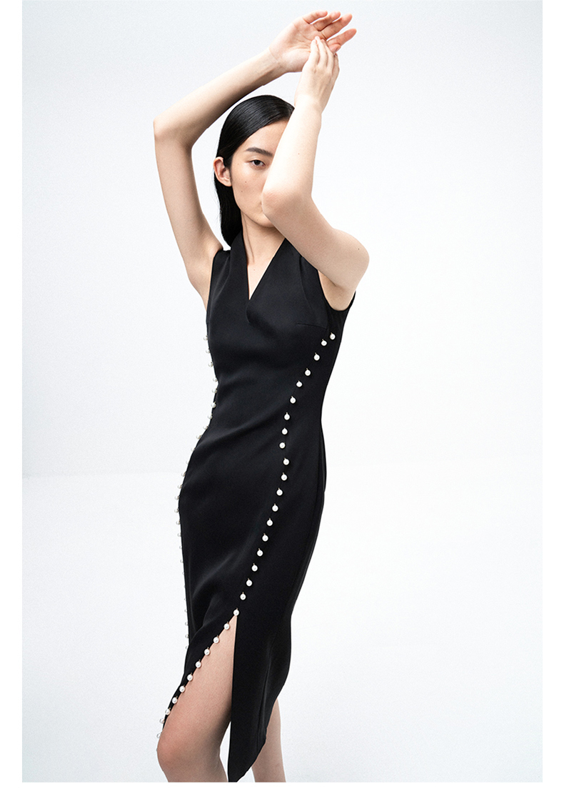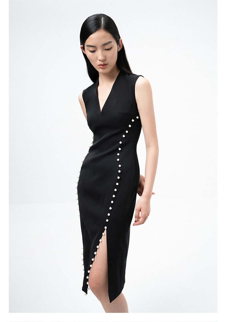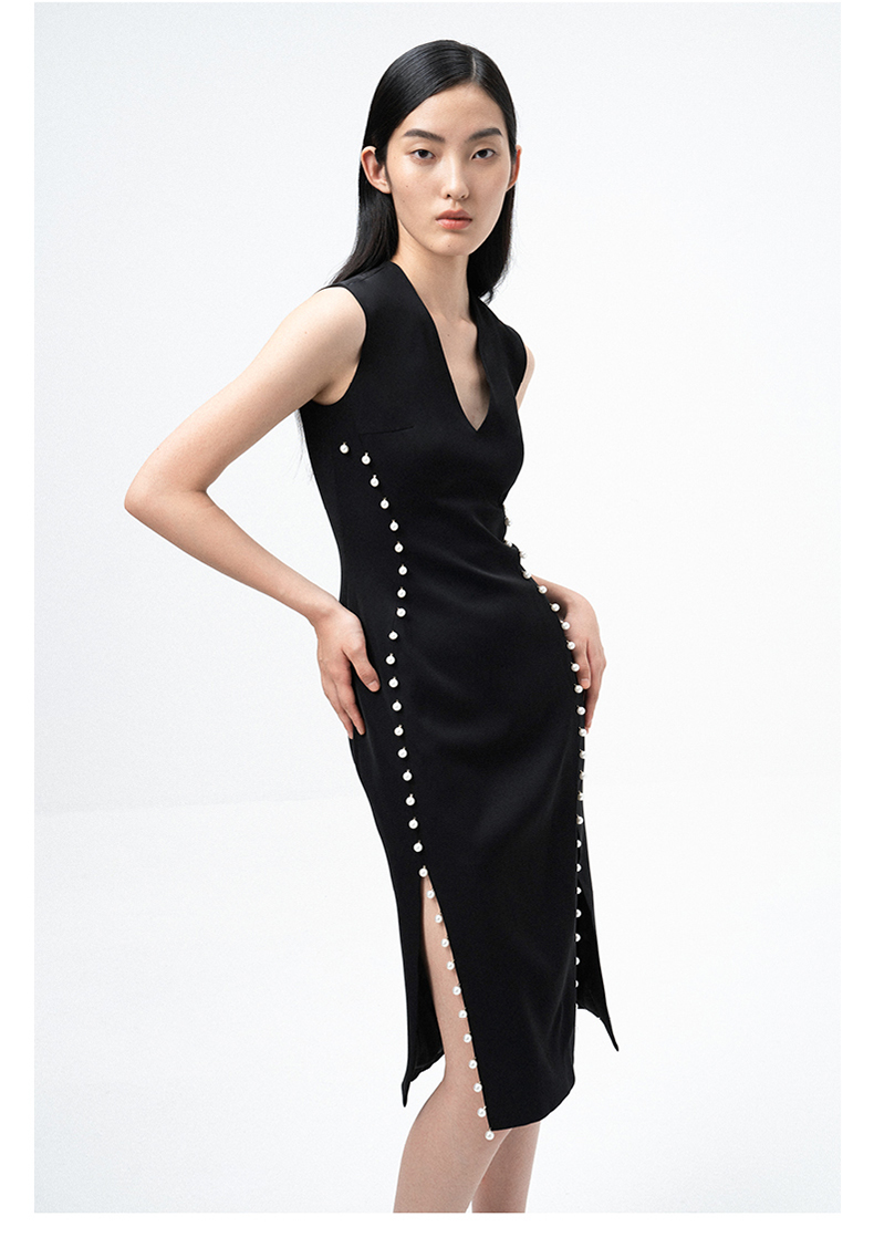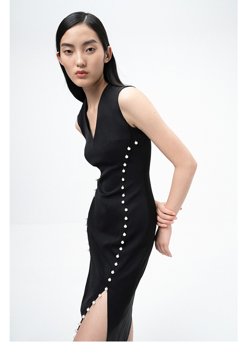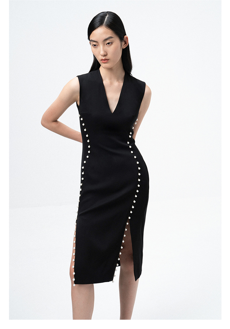 【润夜】AtelierMissLu设计师V领珍珠手订开叉黑色修身连衣裙/0000673A