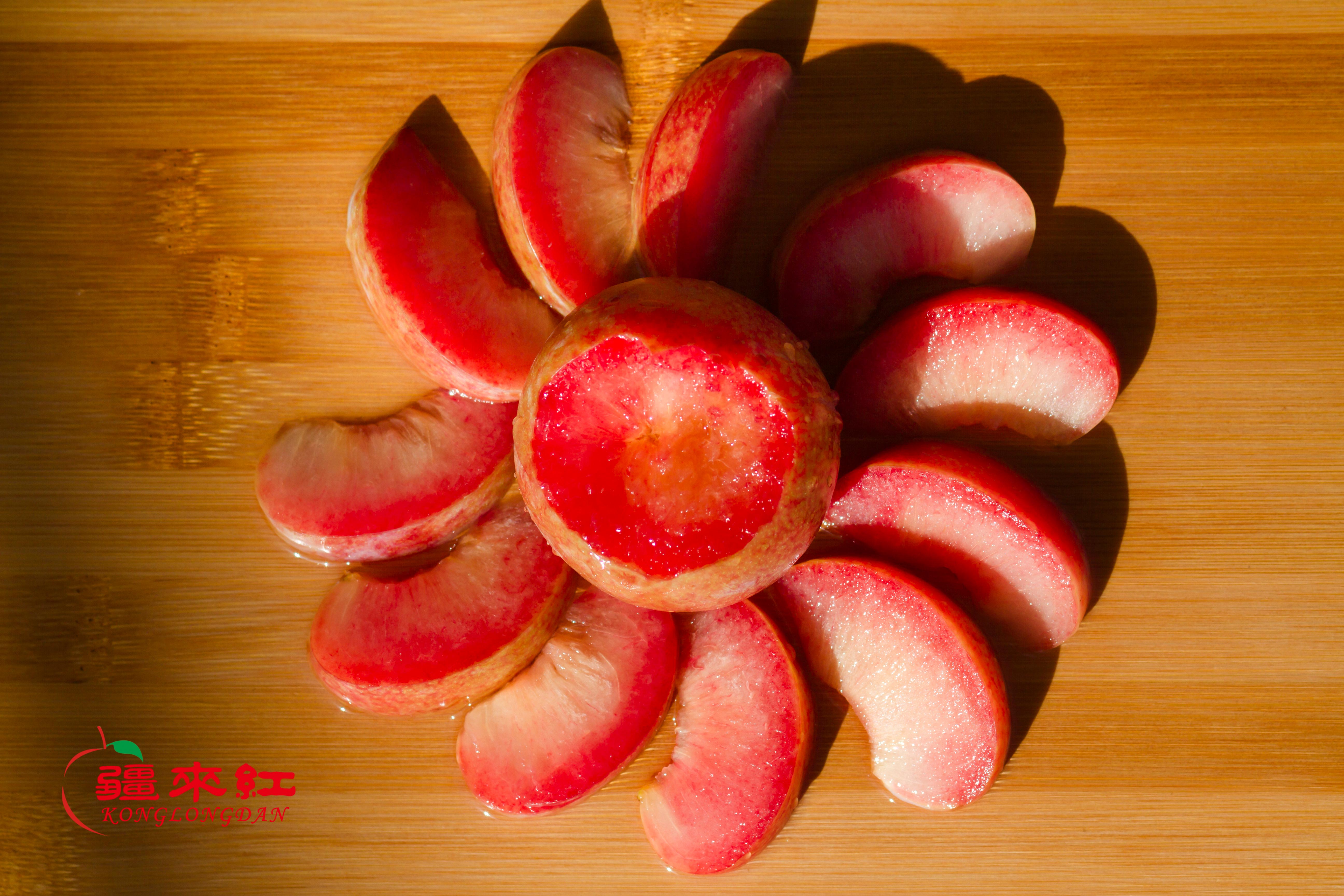 一口咬下,鲜红色的果肉露出了真面目,与微青的果皮形成了巨大的反差,宛如红宝石,格外悦目。