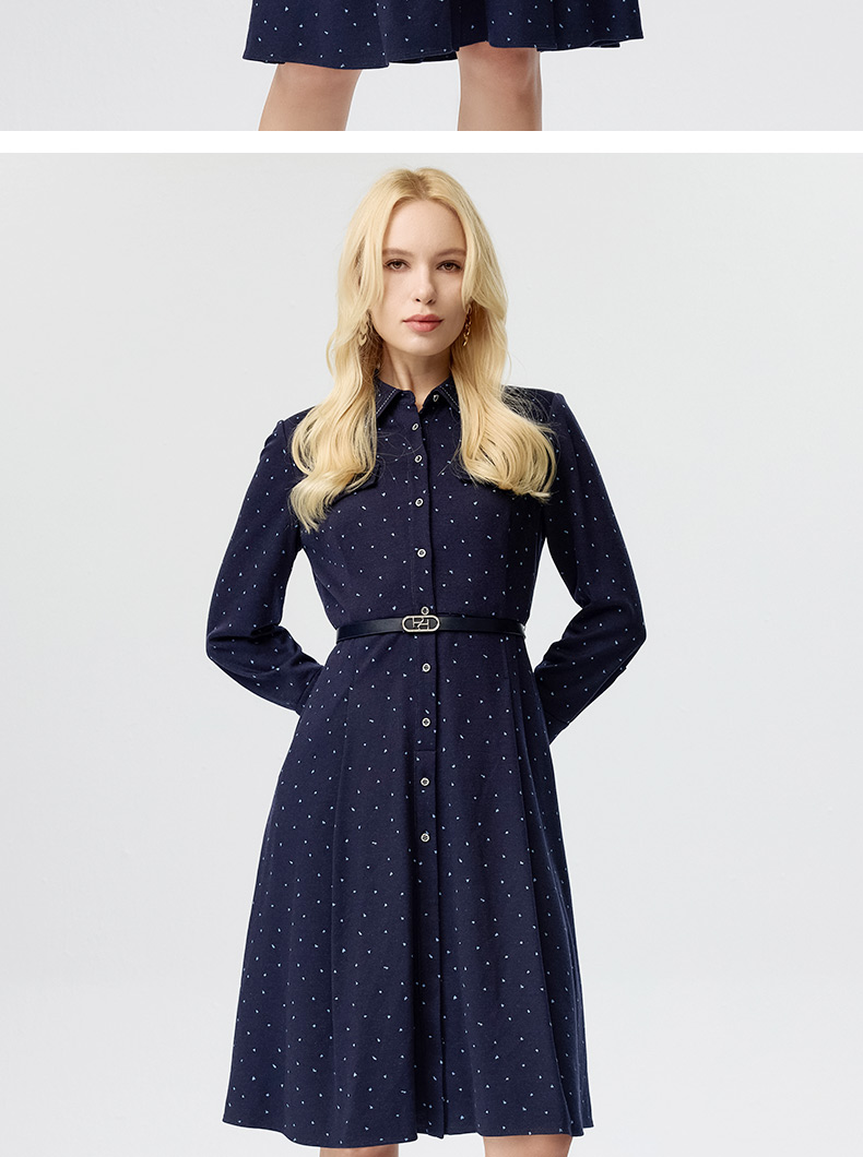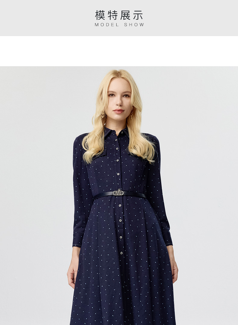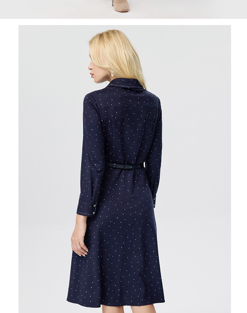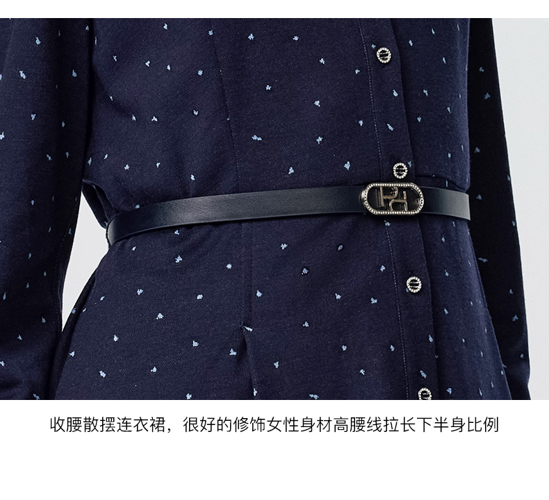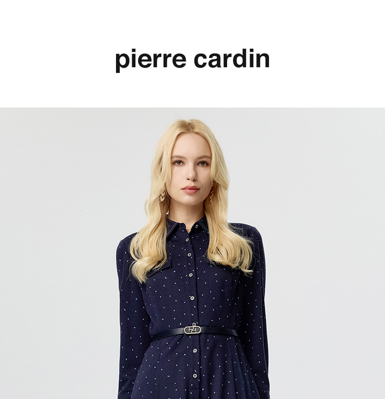 皮尔卡丹女装连衣裙蓝色白点花纹年轻时尚商务衬衫裙P3433E3835N3