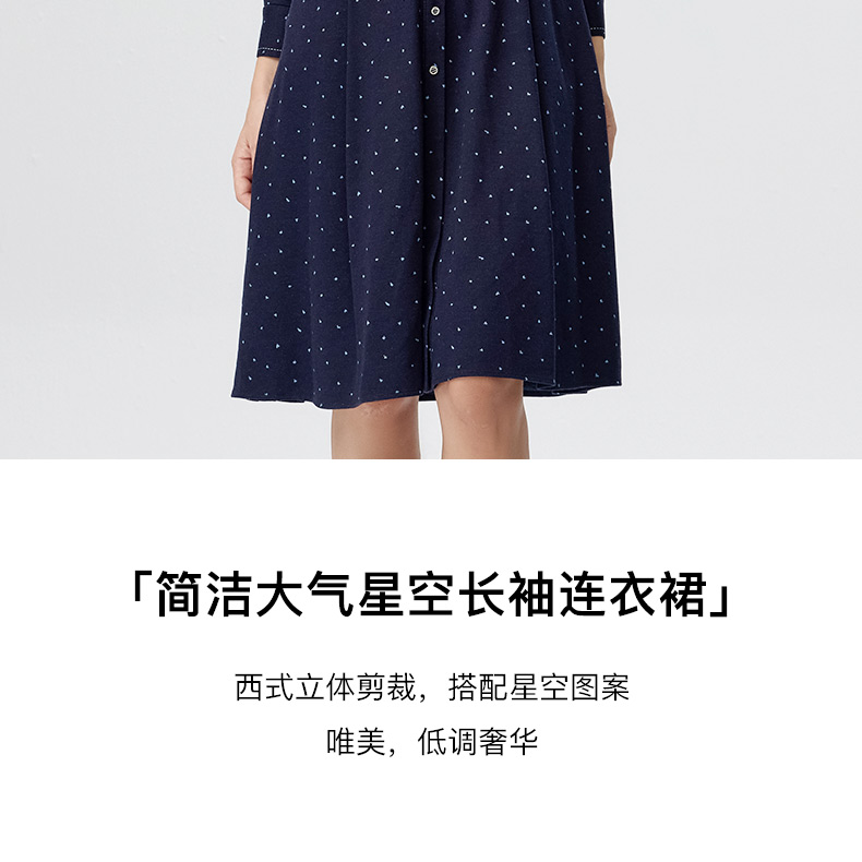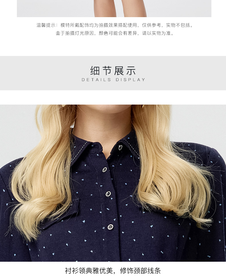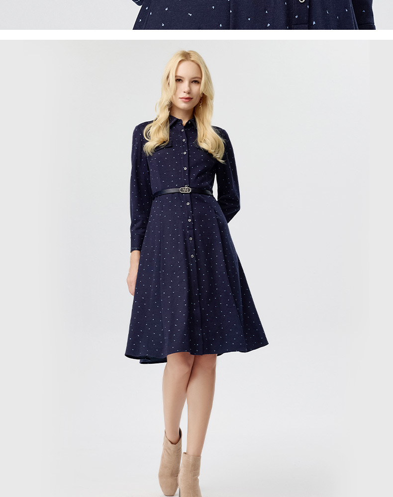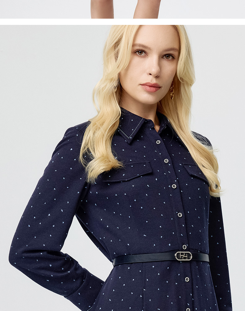 皮尔卡丹女装连衣裙蓝色白点花纹年轻时尚商务衬衫裙P3433E3835N3