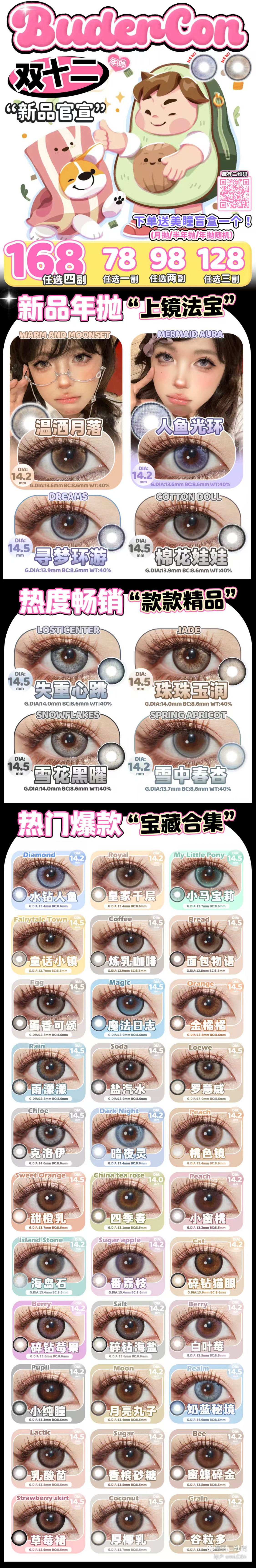 Budercon年抛双12活动·98¥/2副 128¥/3副·0-800度(无525/575)·寻梦环游&棉花娃娃&水钻人鱼&皇家千层&小马宝莉&童话小镇&面包物语&魔法日志&炼乳咖啡&草莓裙&小纯瞳