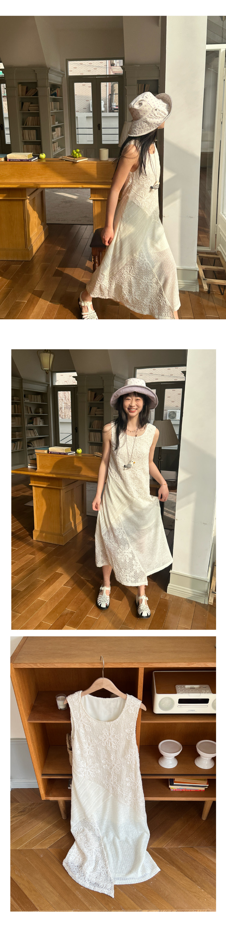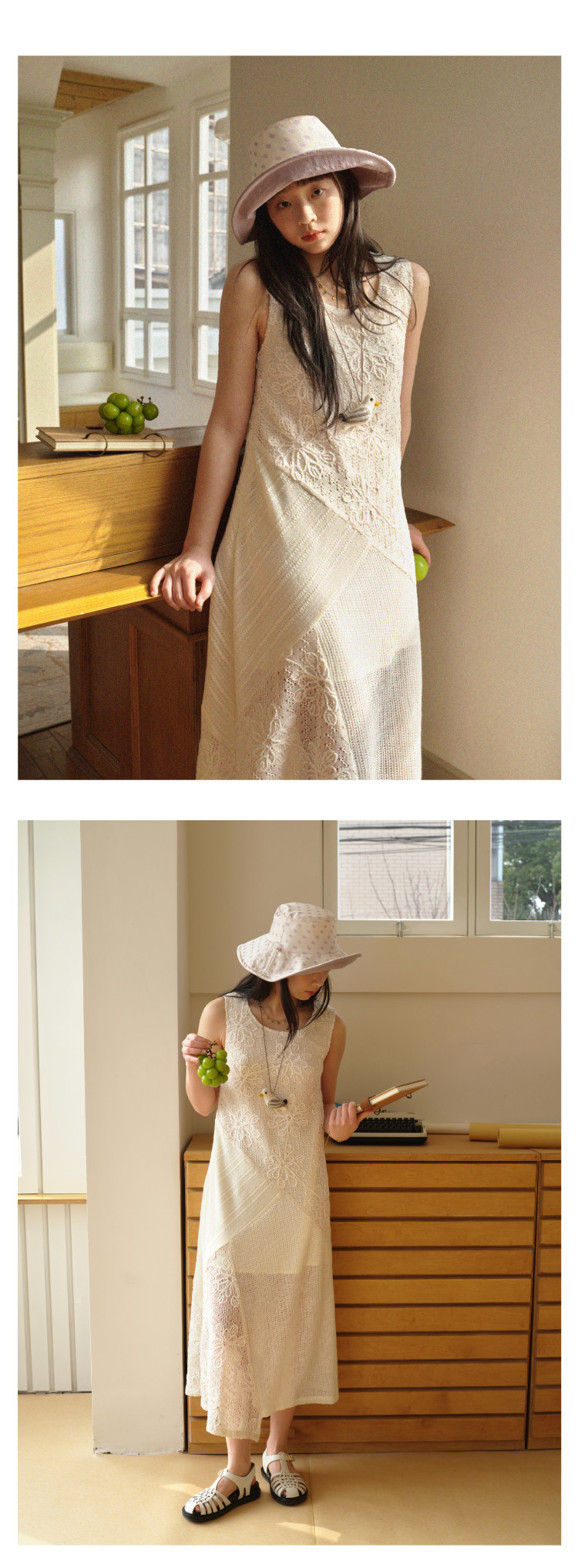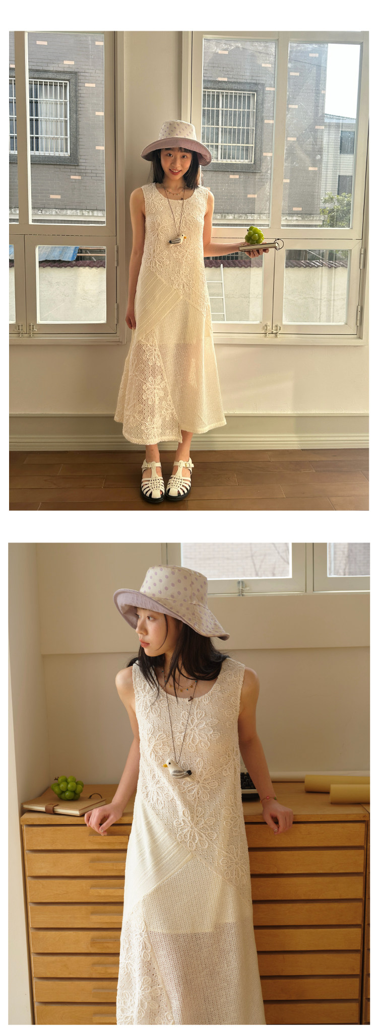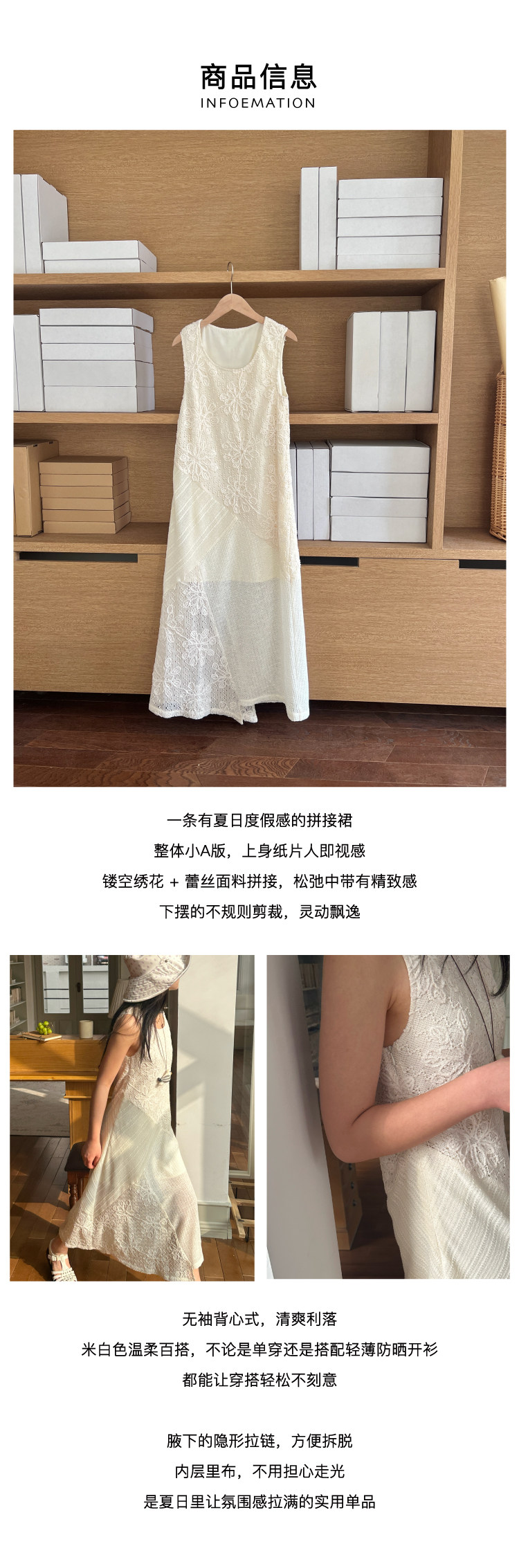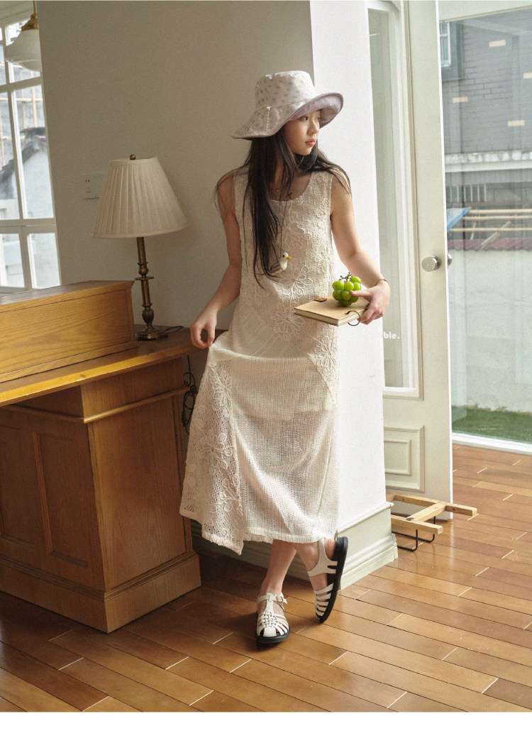 nothe Case布然/NC261813/ 「沙滩轻语」米白色度假感无袖拼接蕾丝绣花针织连衣裙