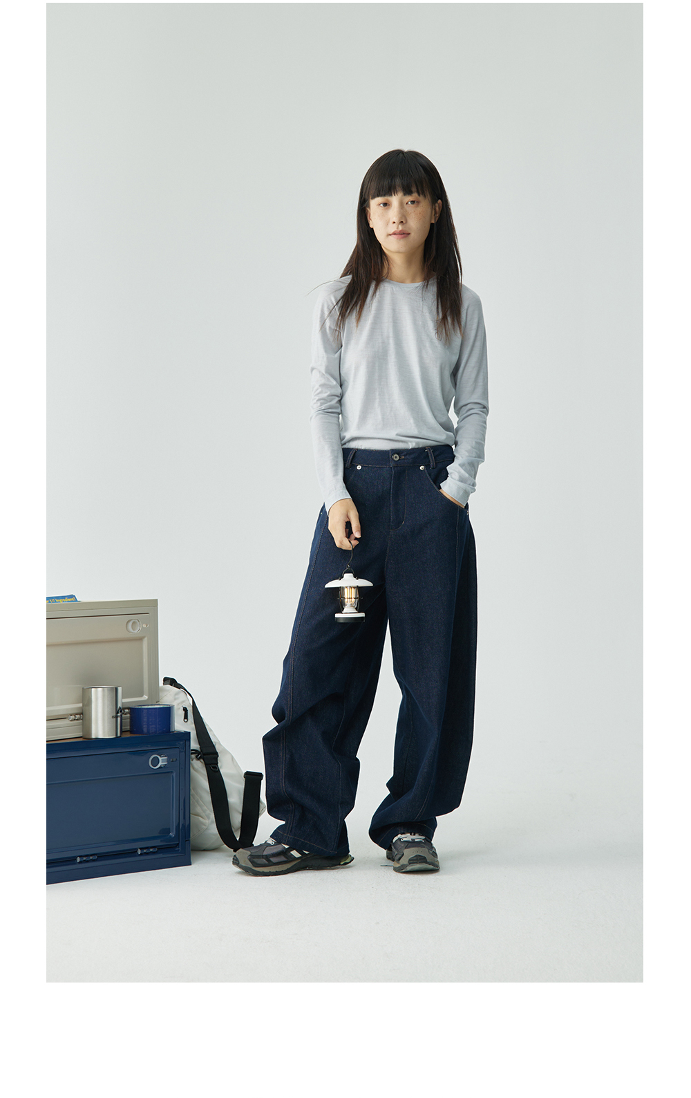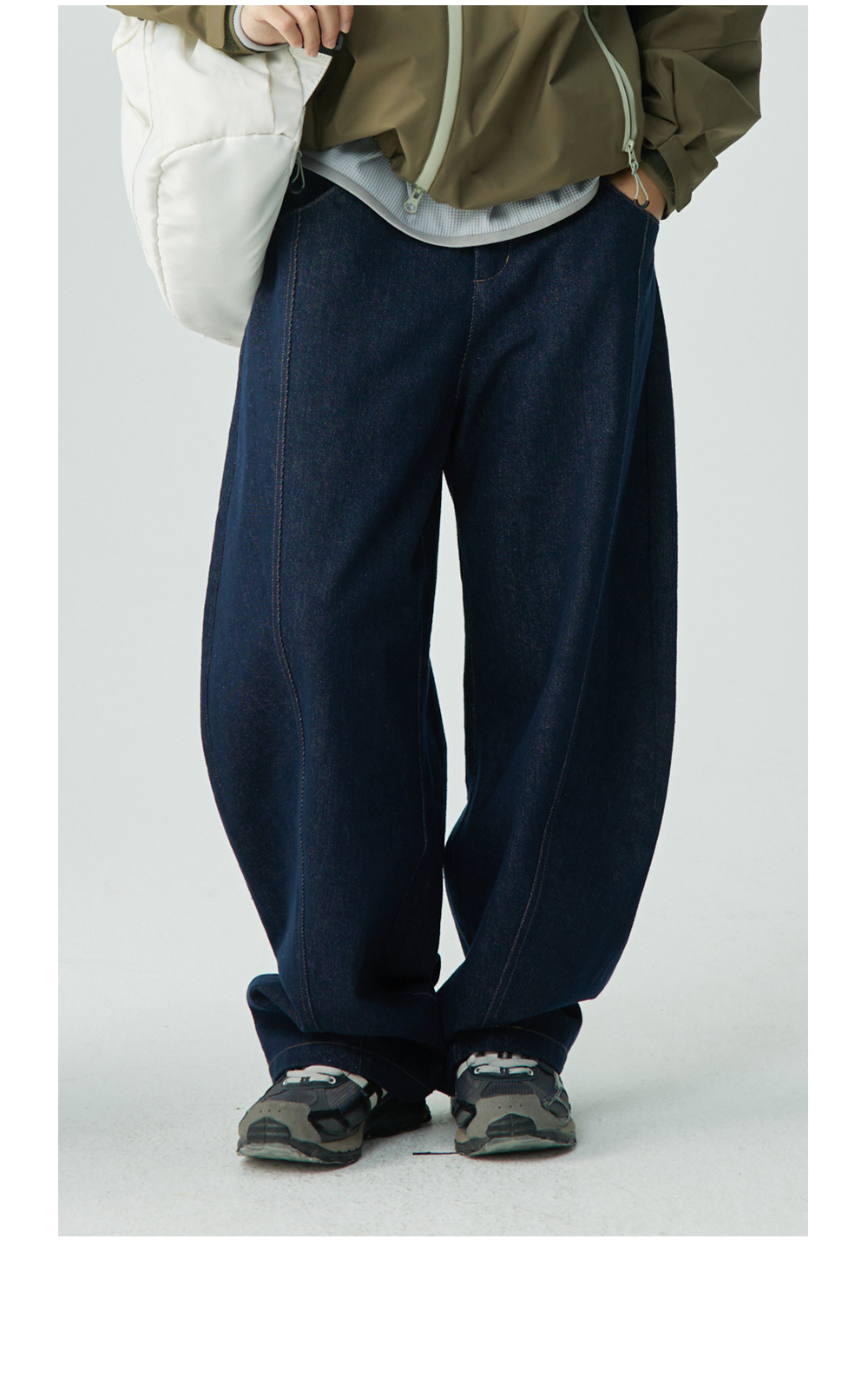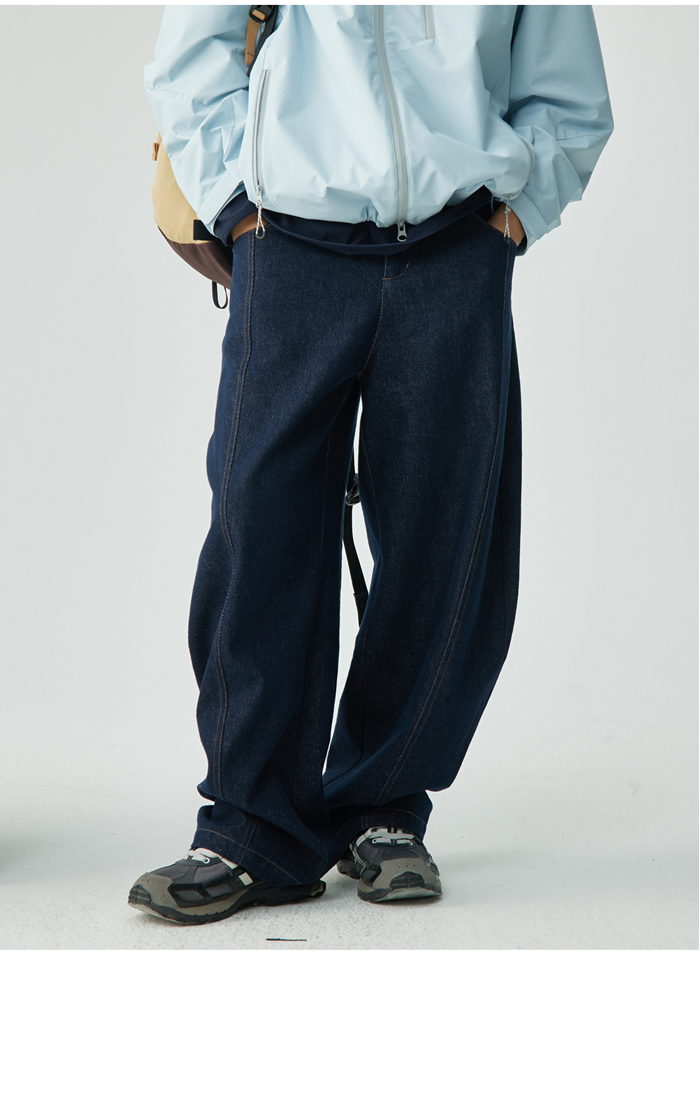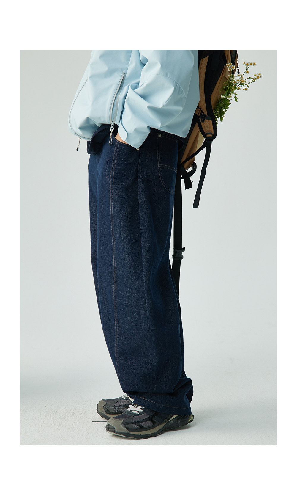 步履不停/4C42085C/阔腿深蓝色水洗弯刀牛仔裤