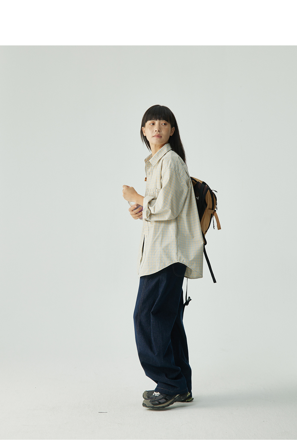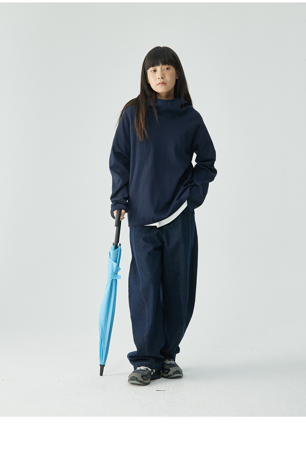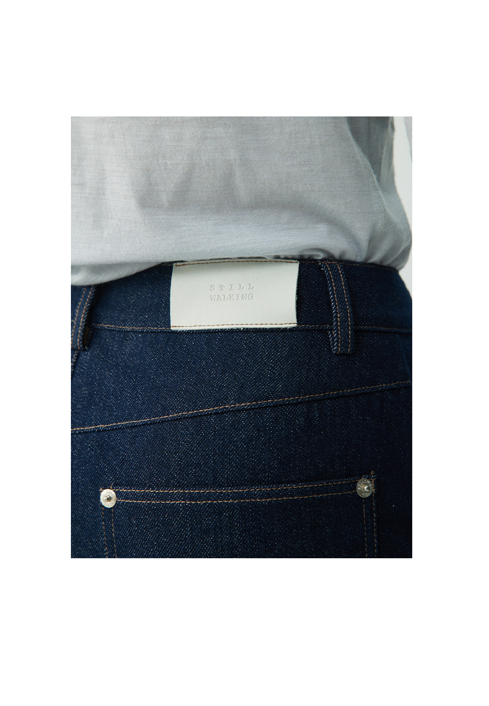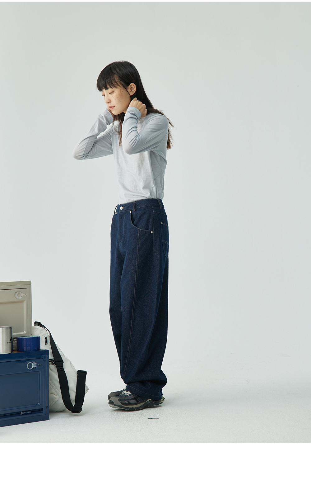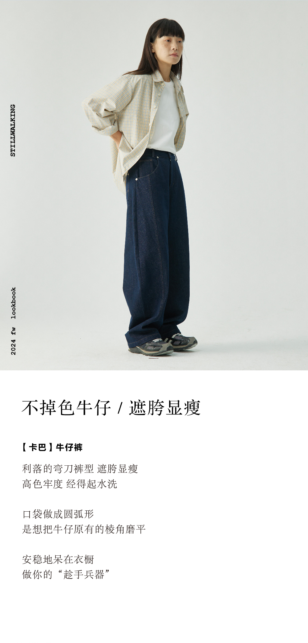 步履不停/4C42085C/阔腿深蓝色水洗弯刀牛仔裤
