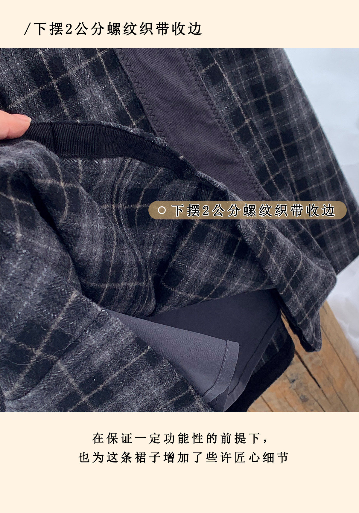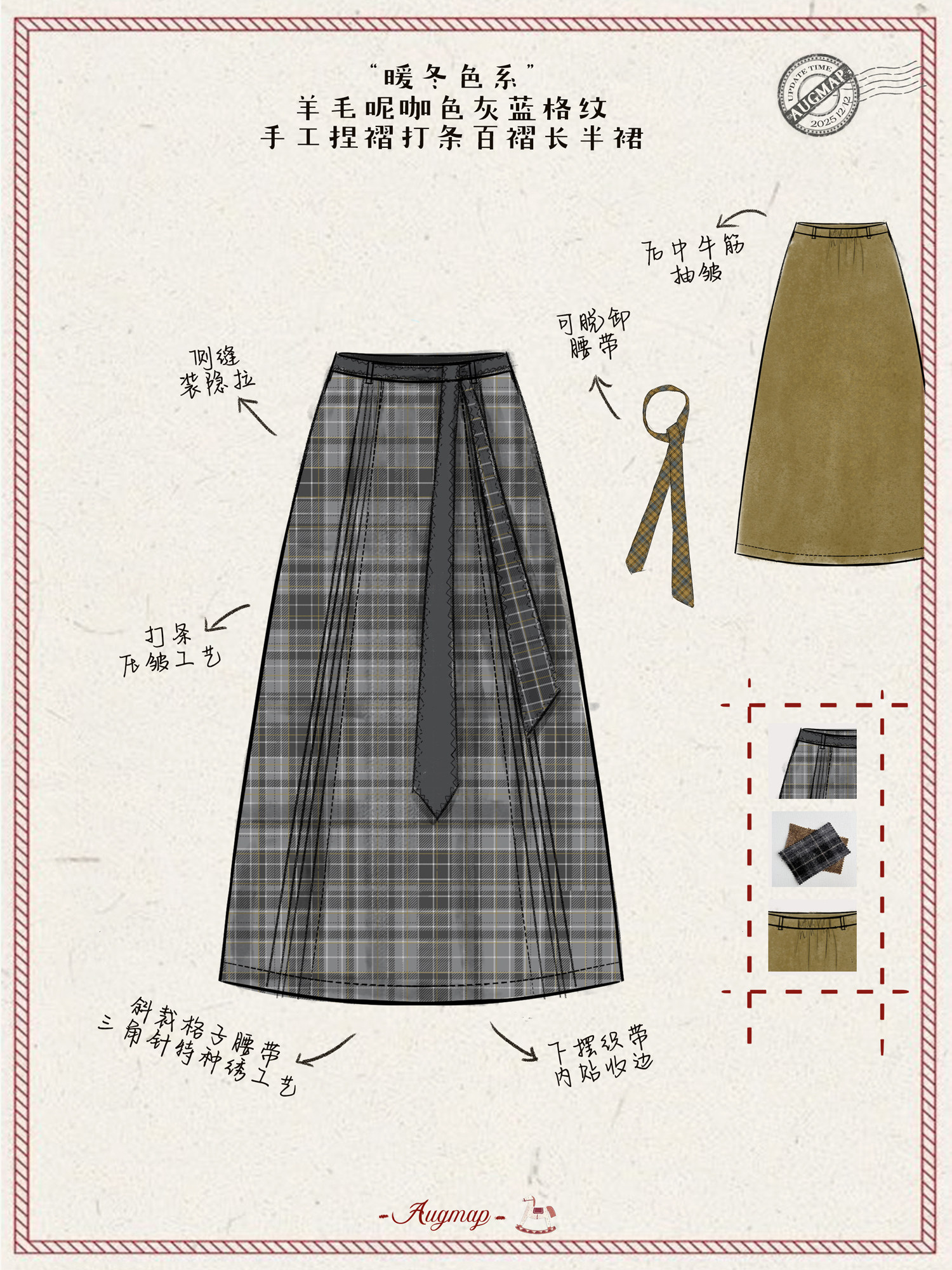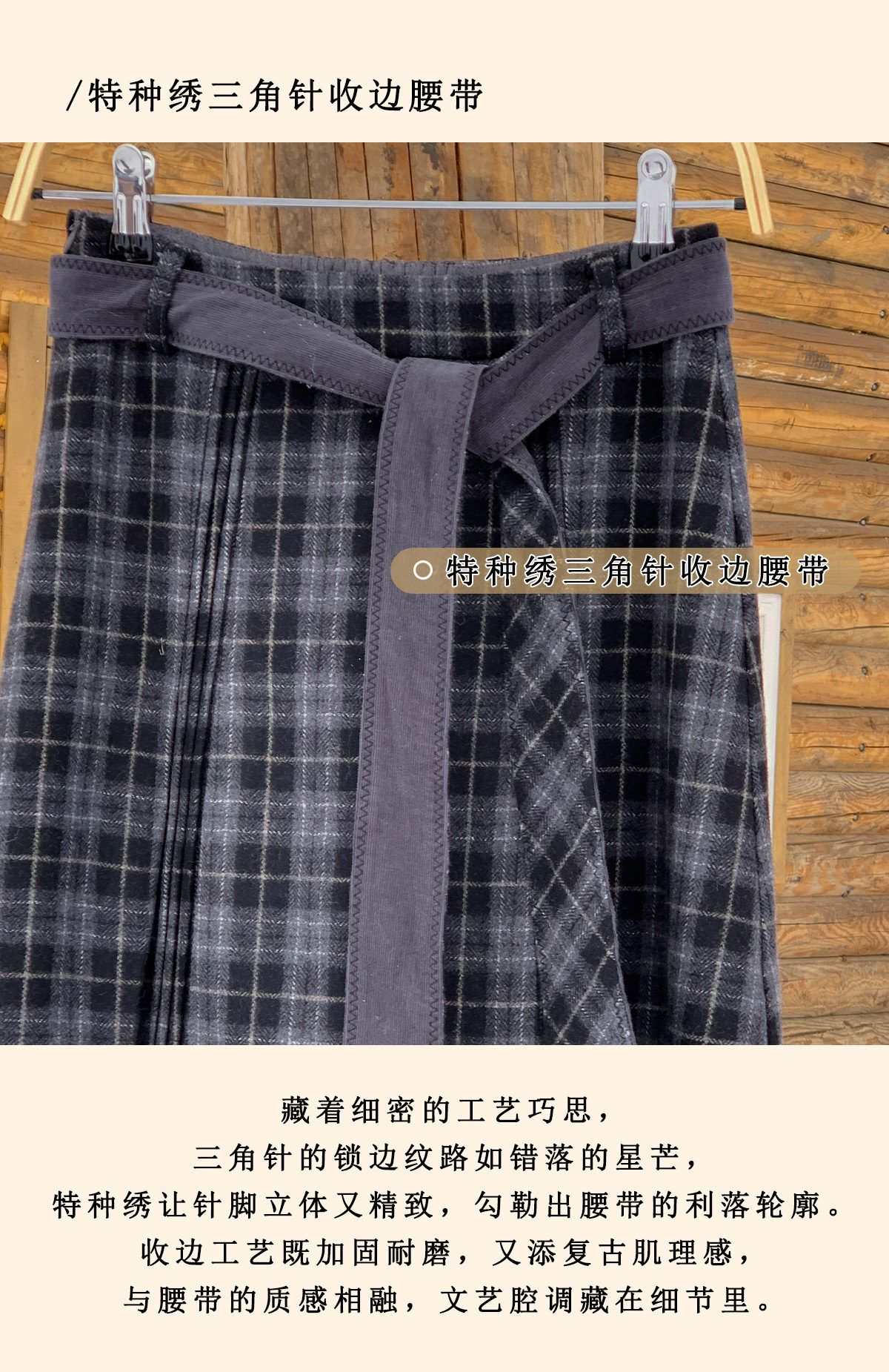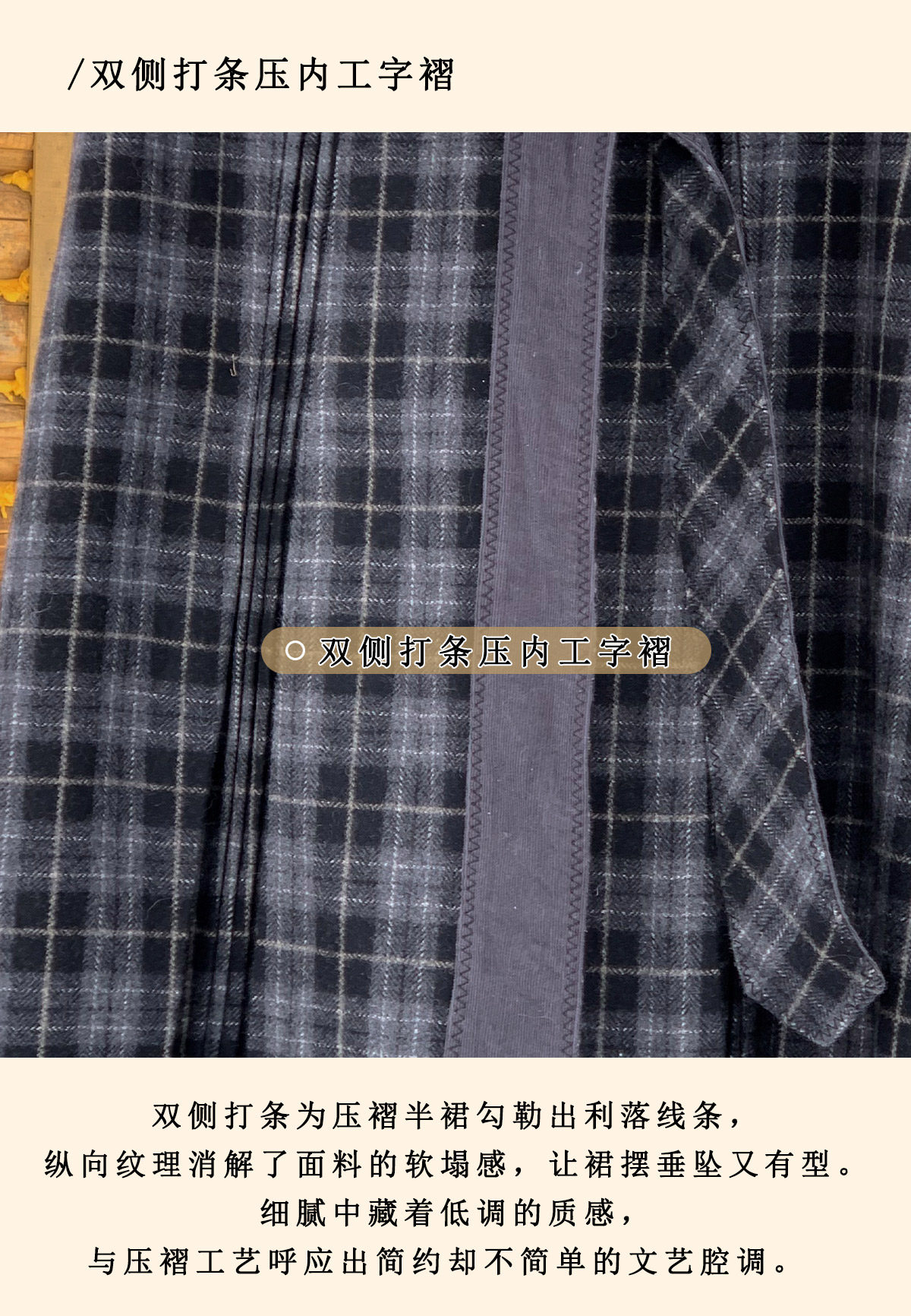 浮生八记/25D287/羊毛呢咖色灰蓝格纹手工捏褶打条百褶长半裙