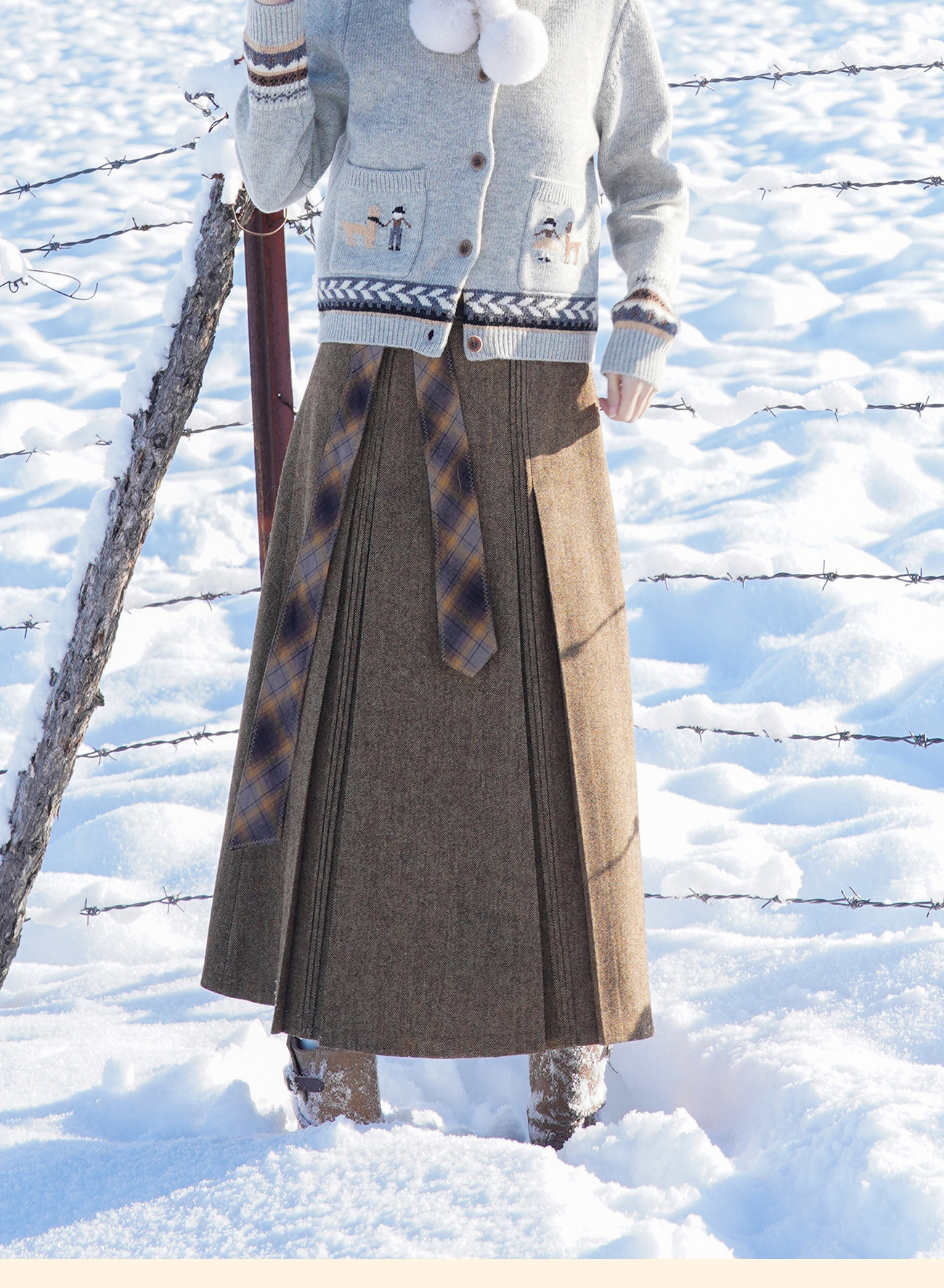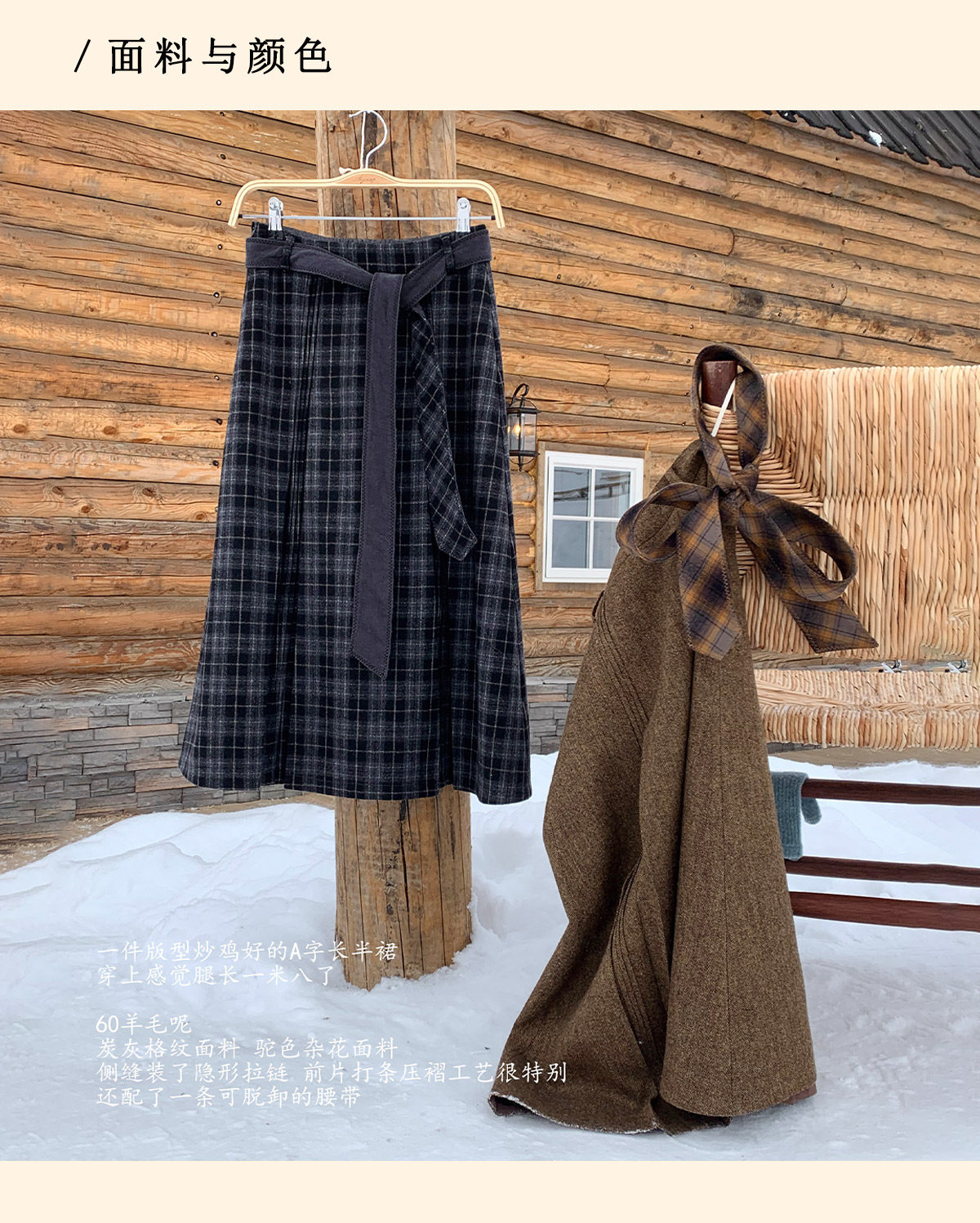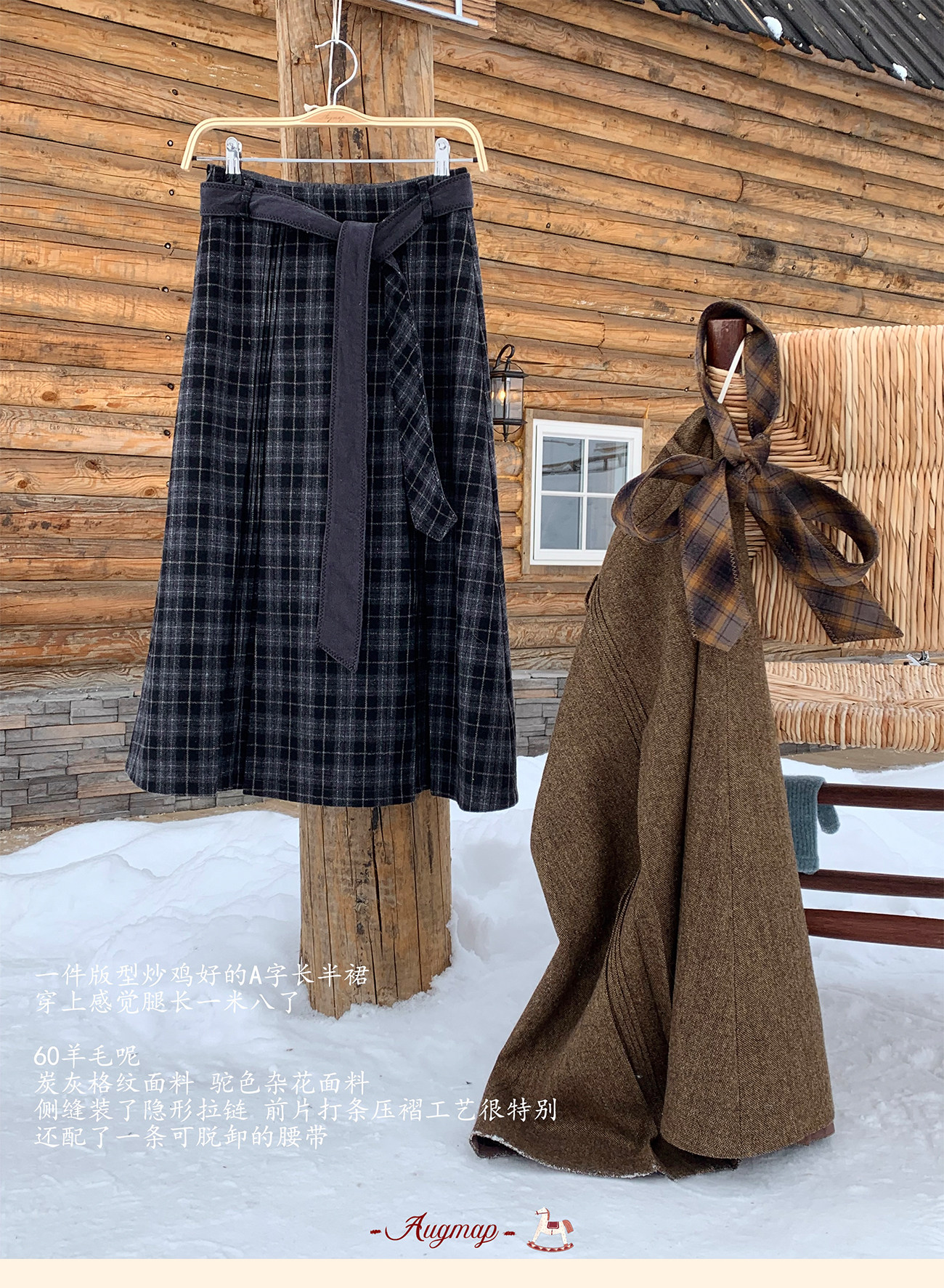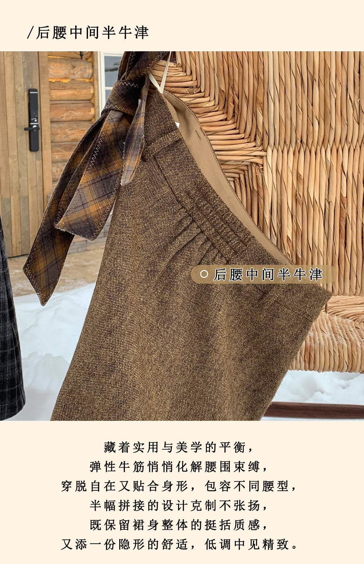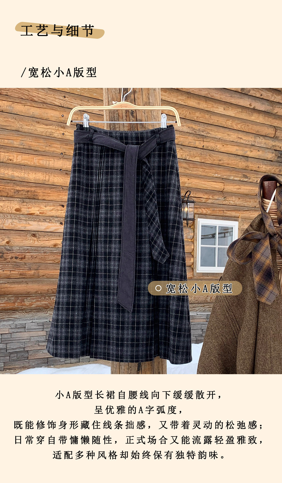 浮生八记/25D287/羊毛呢咖色灰蓝格纹手工捏褶打条百褶长半裙