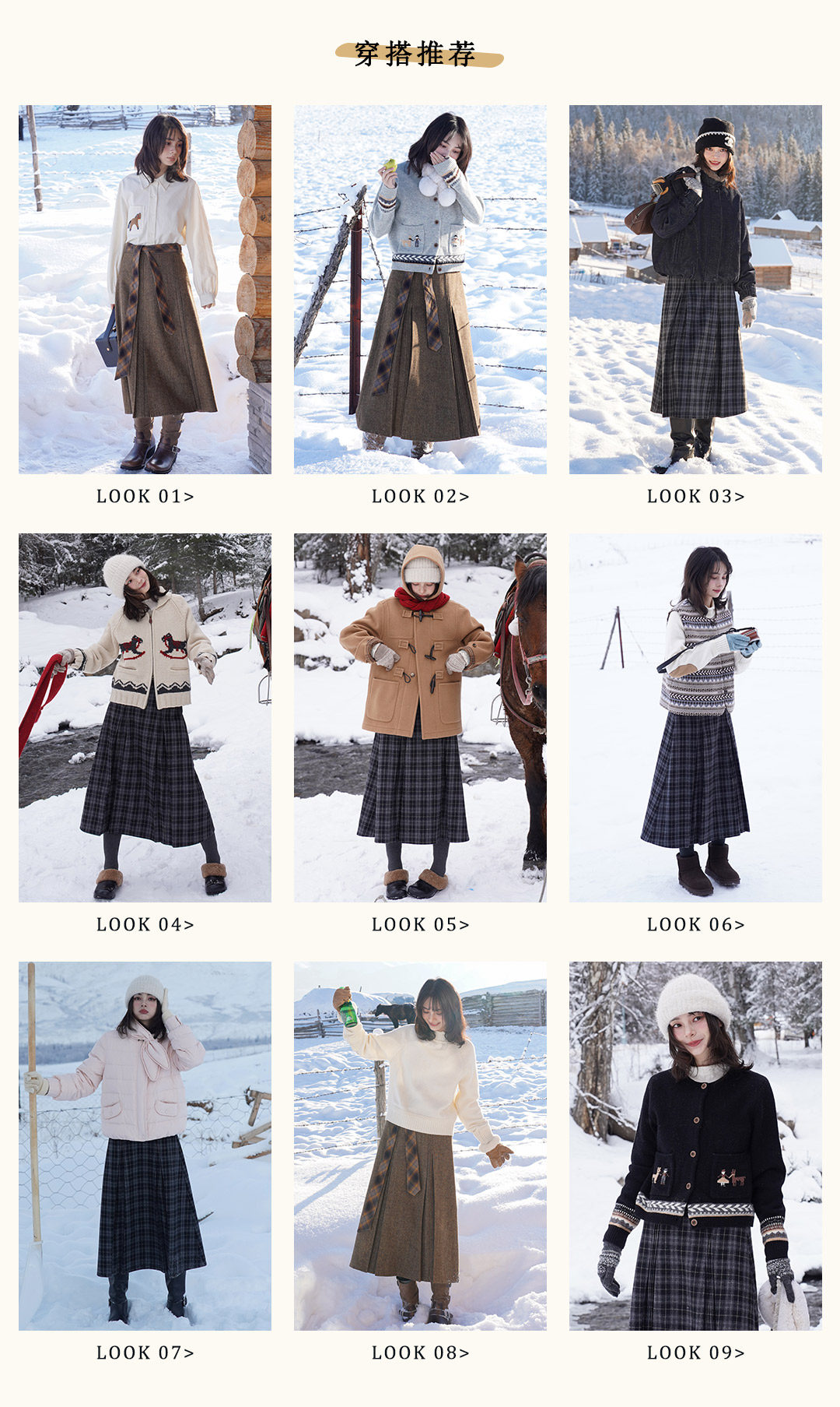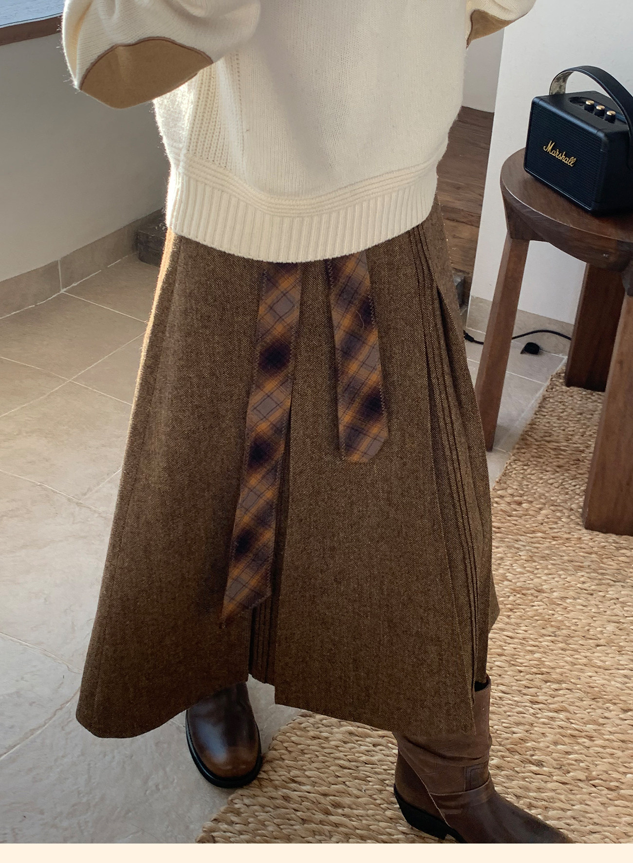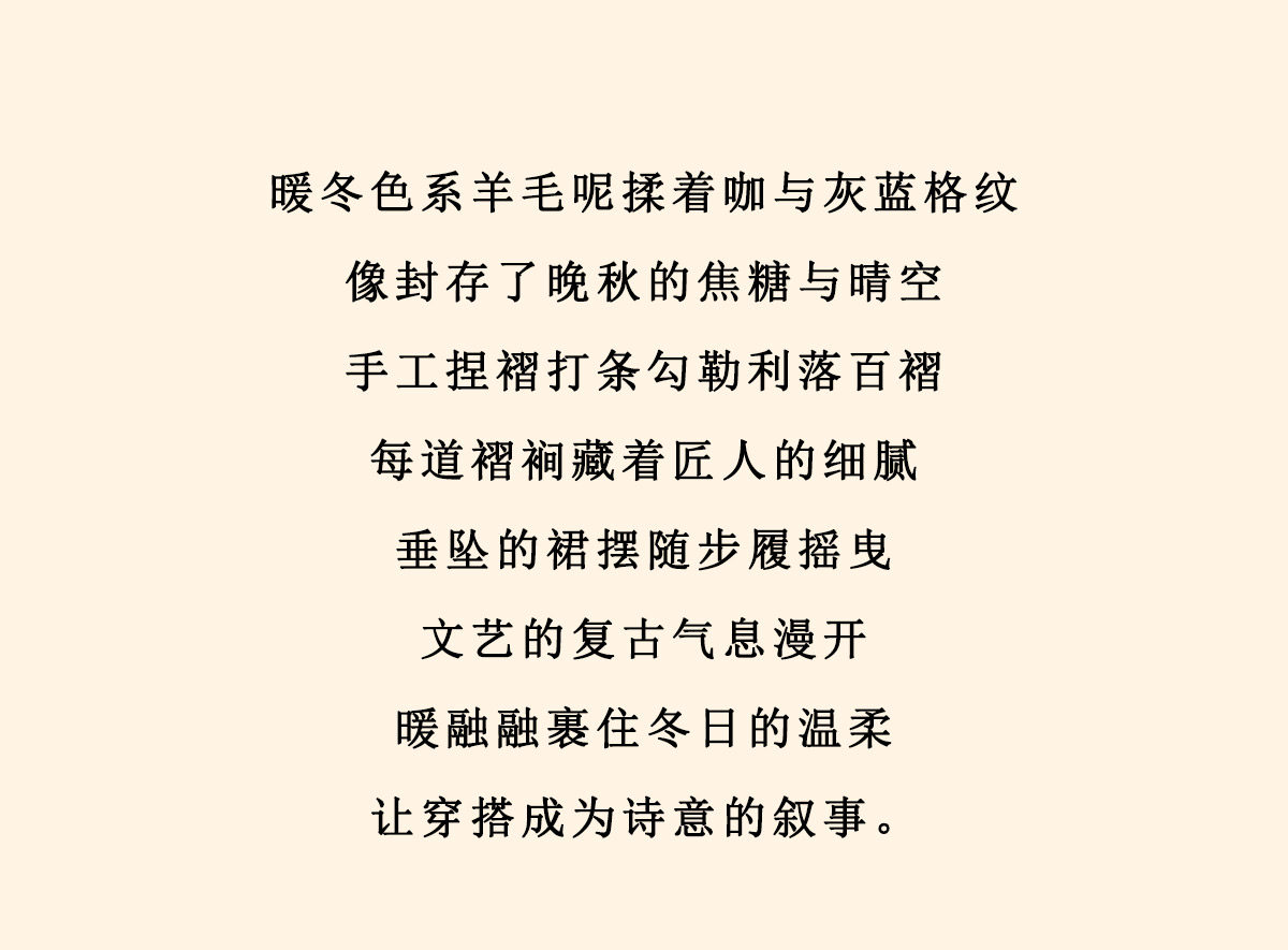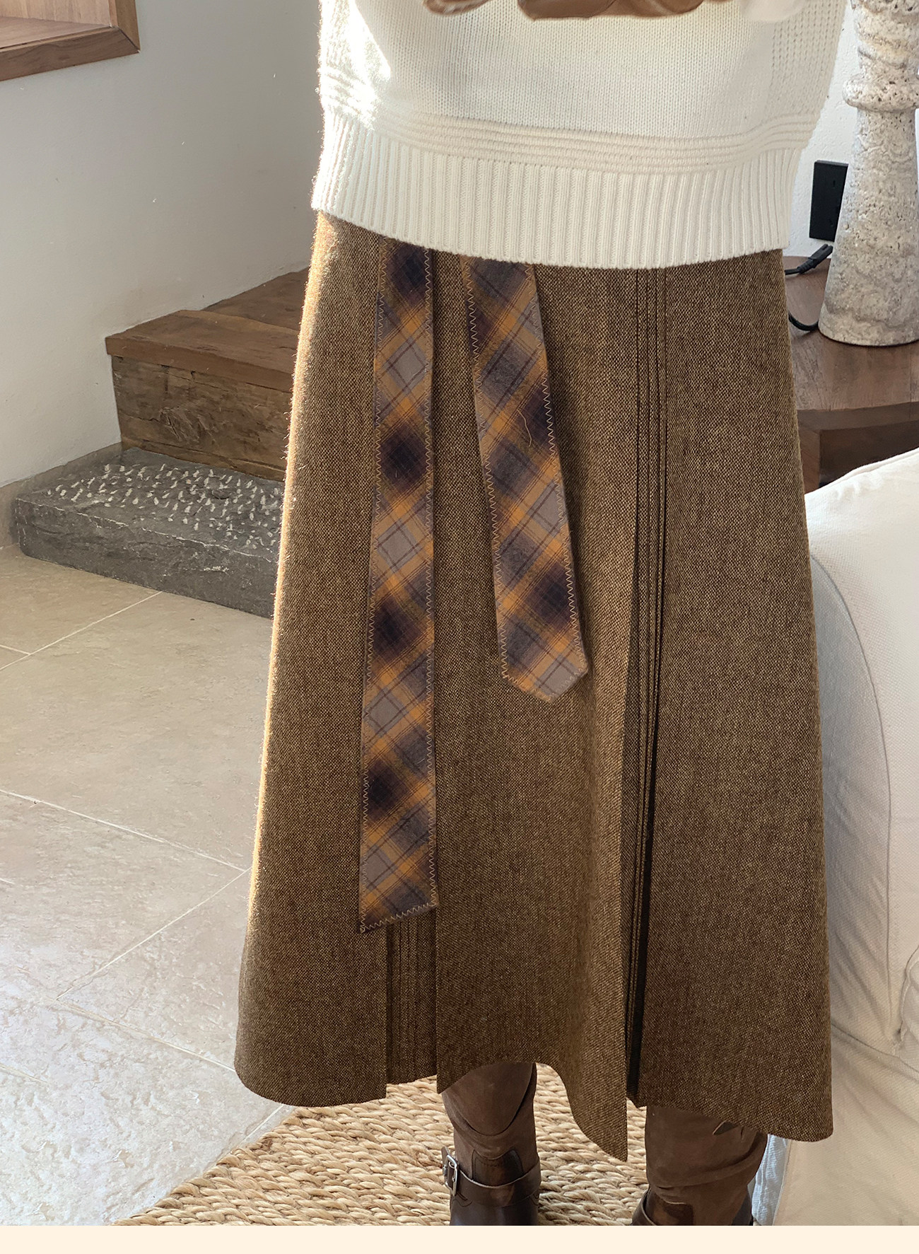 浮生八记/25D287/羊毛呢咖色灰蓝格纹手工捏褶打条百褶长半裙