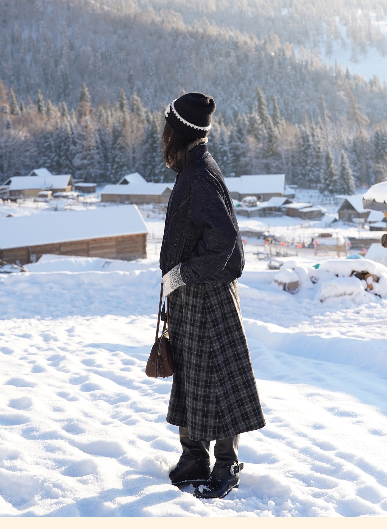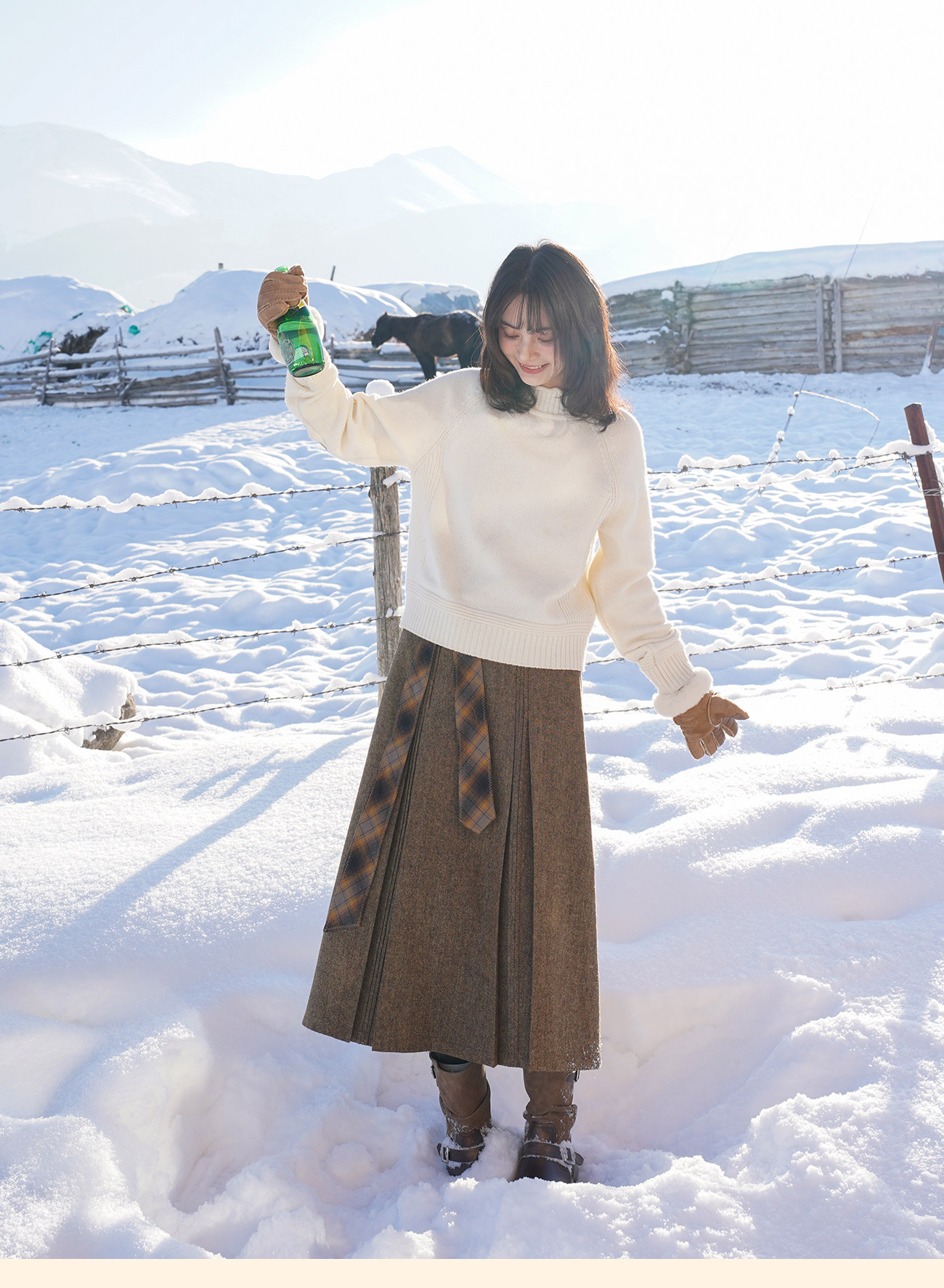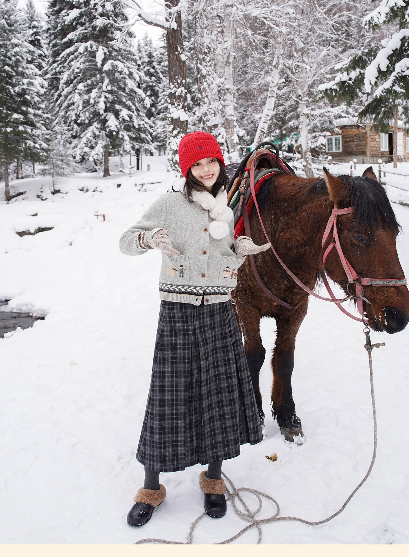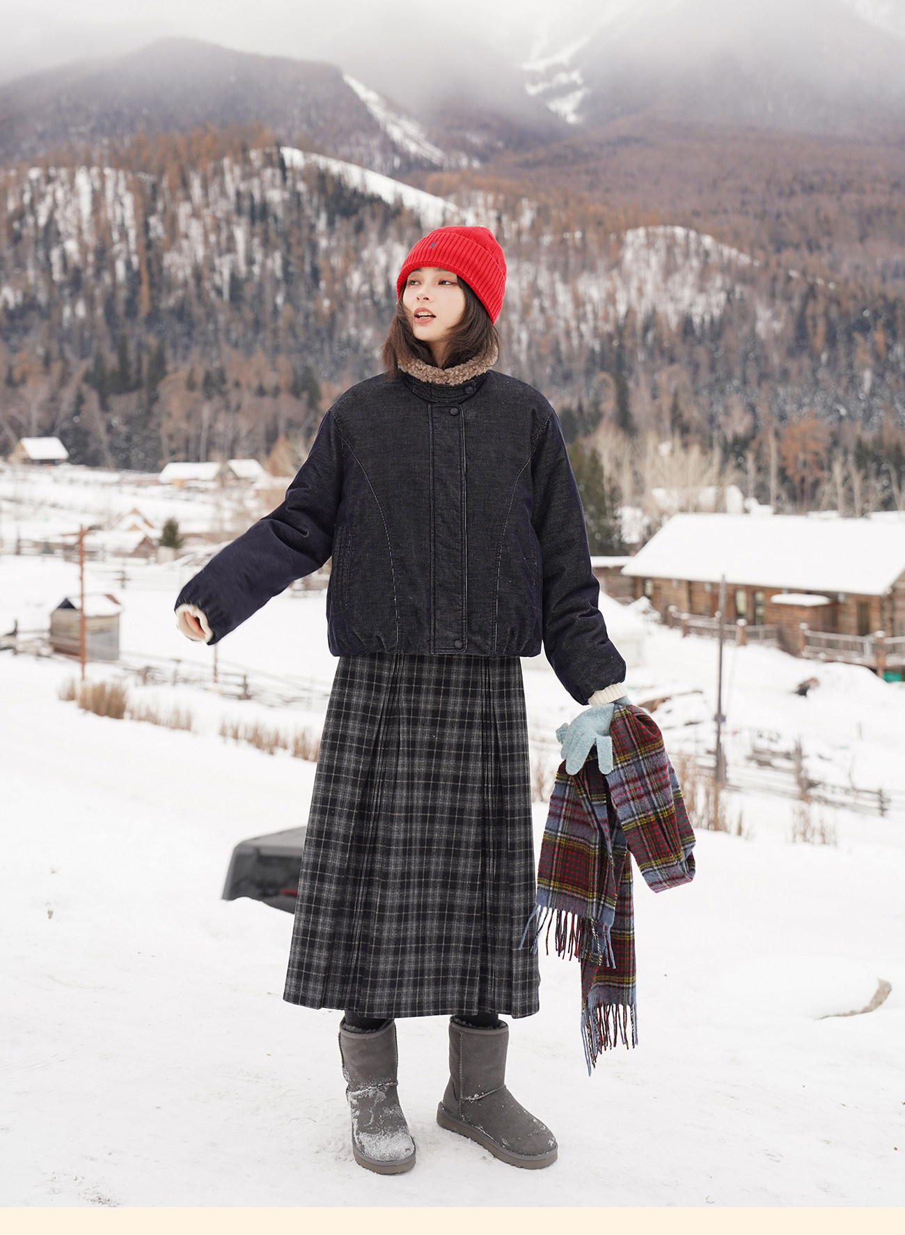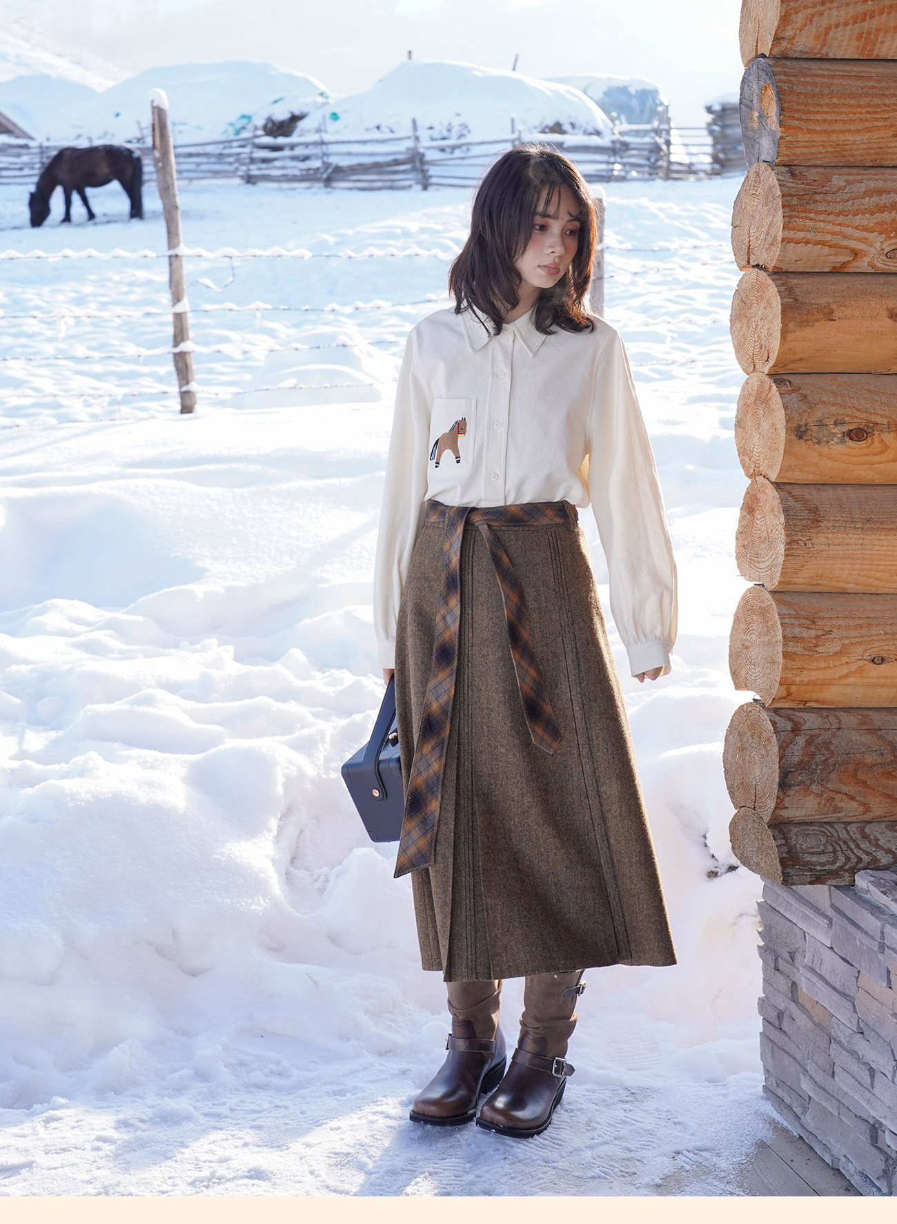 浮生八记/25D287/羊毛呢咖色灰蓝格纹手工捏褶打条百褶长半裙