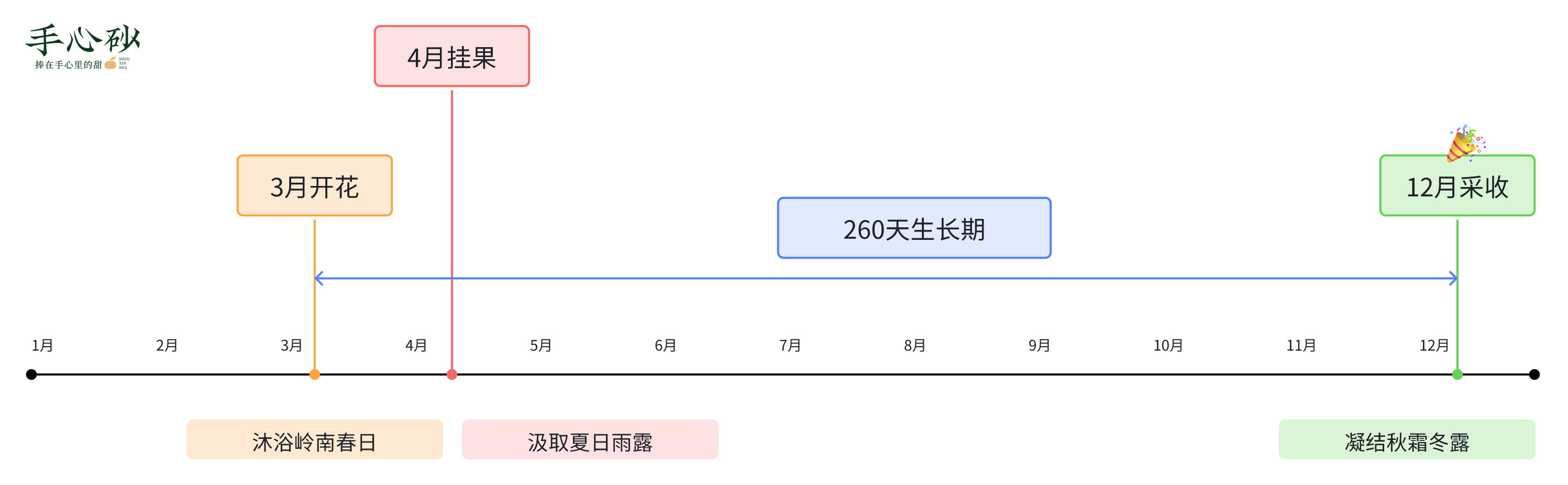 ✅260天超长生长期,三月开花,四月结果,十二月采收,可谓“怀胎十月”不为过,风味攒足了劲儿
