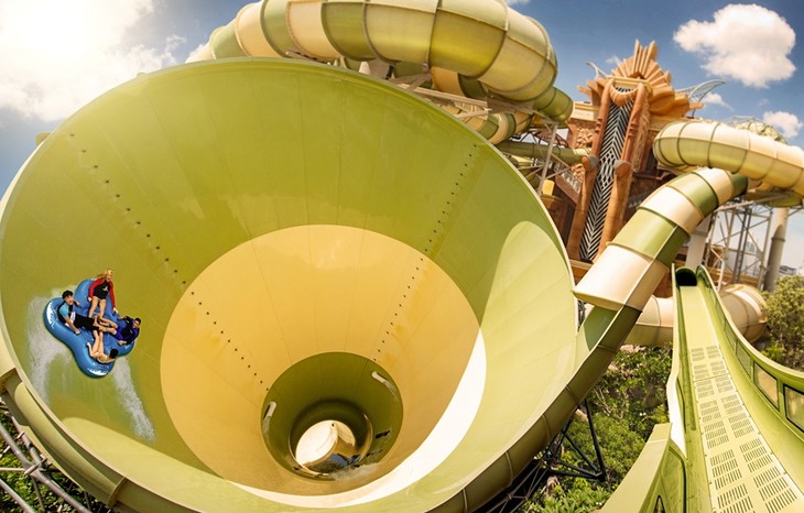 位于海神塔与公主塔之间,提升机将浮筏升至顶点,突然环绕而下,任由重力和湍流的摆布,在滑道上高速下落。通过一个急转弯后,又是另一个急转,滑道弯全长230米,总落差12.7米,天旋地转,精彩刺激!