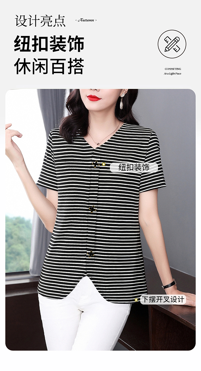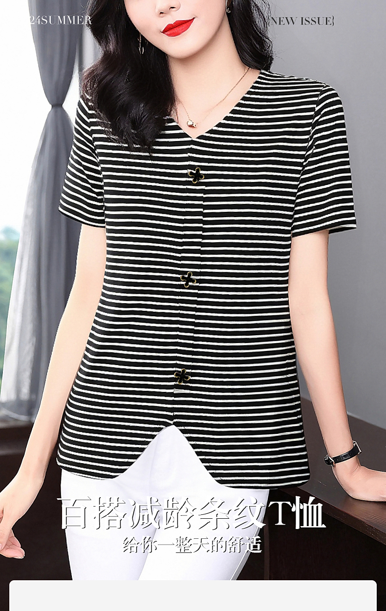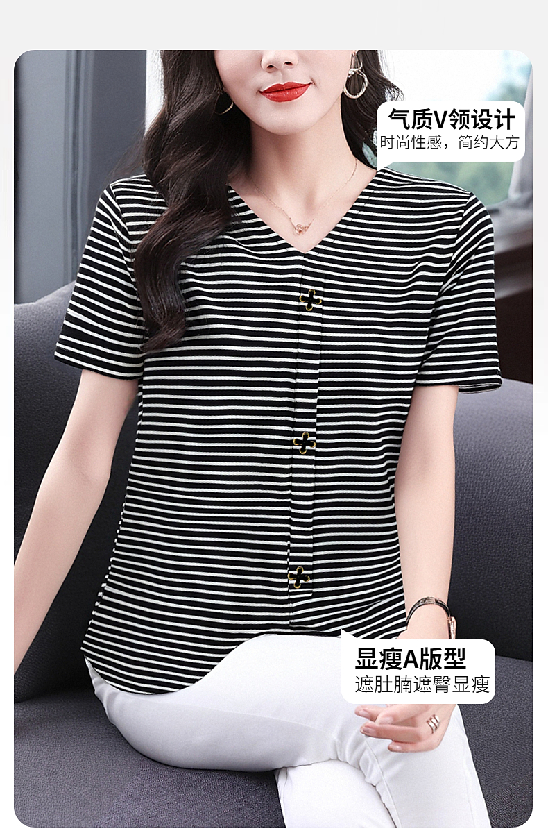 夏季2025新款V领短袖t恤女洋气条纹大码女装休闲女士上衣宽松体恤