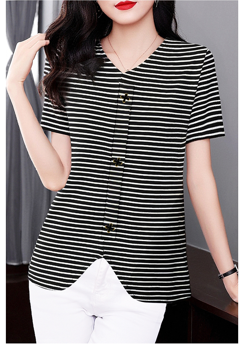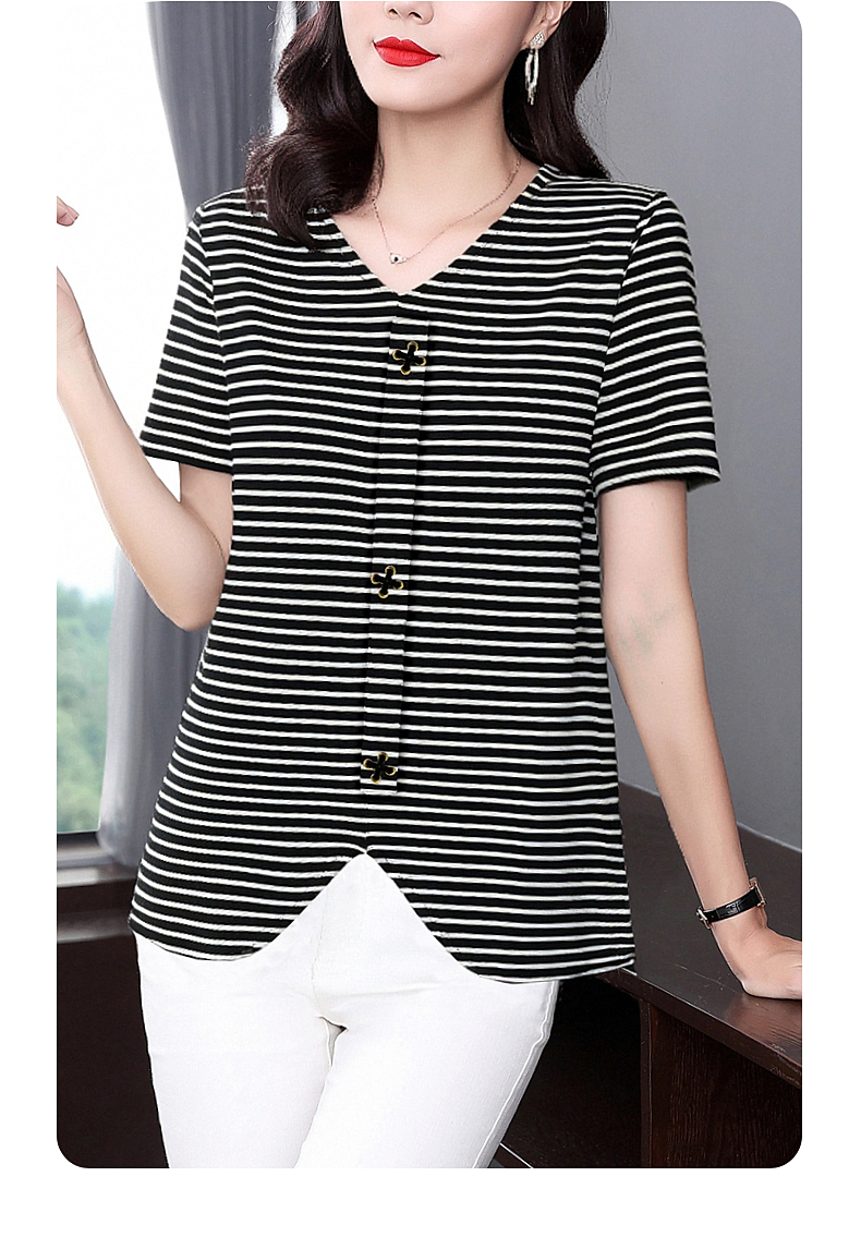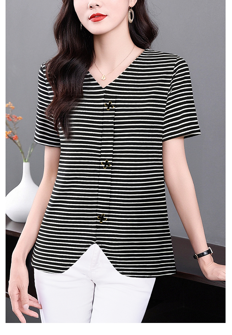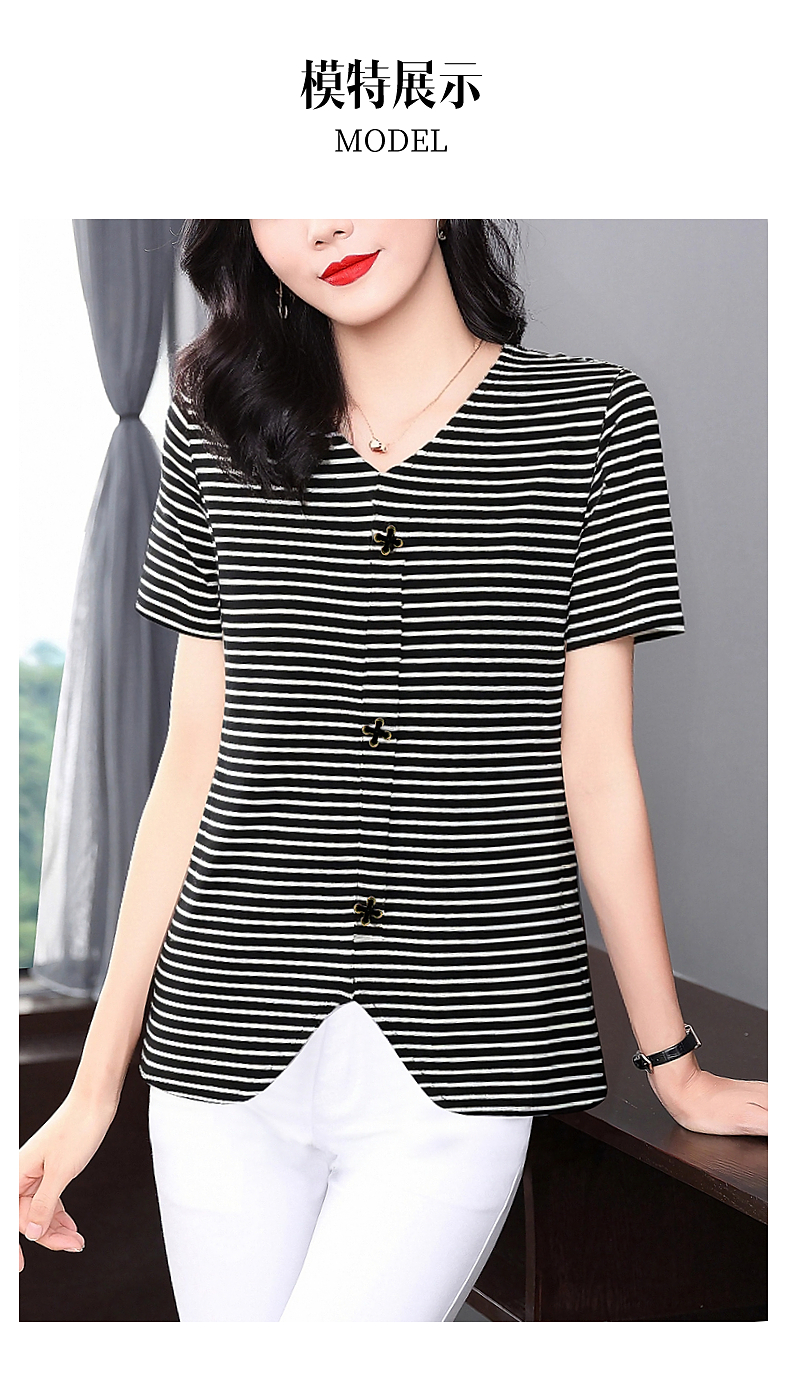 夏季2025新款V领短袖t恤女洋气条纹大码女装休闲女士上衣宽松体恤