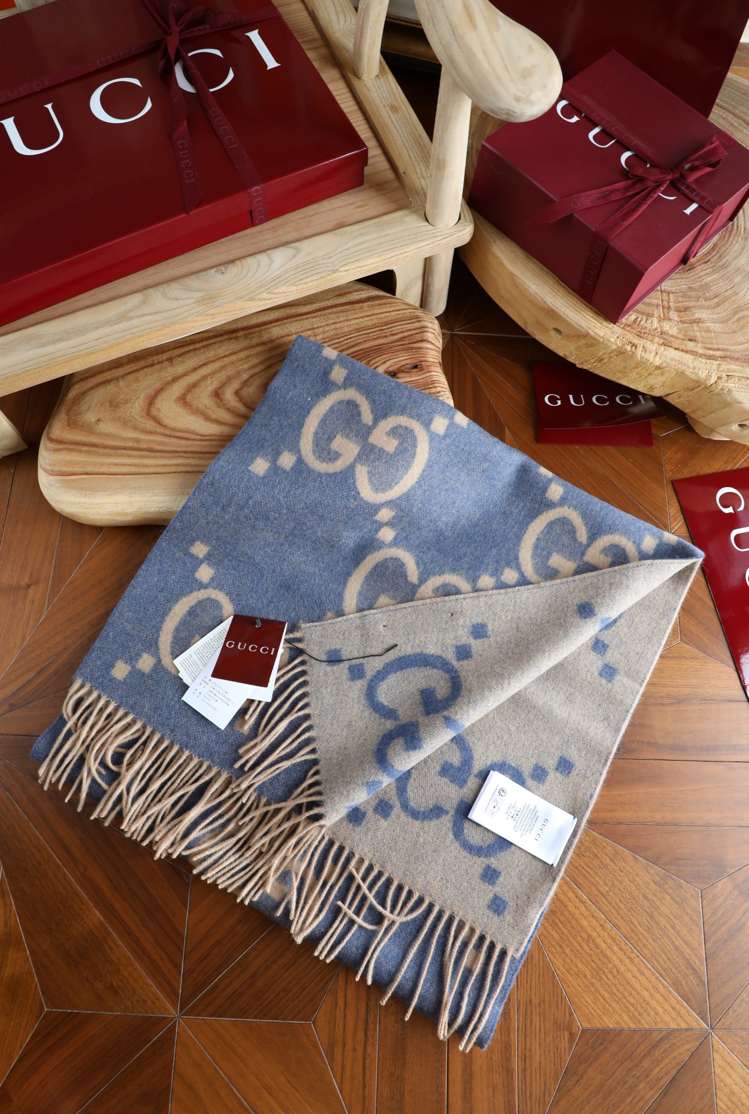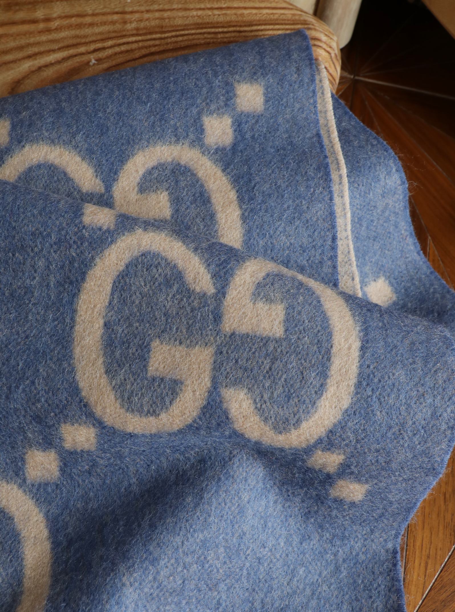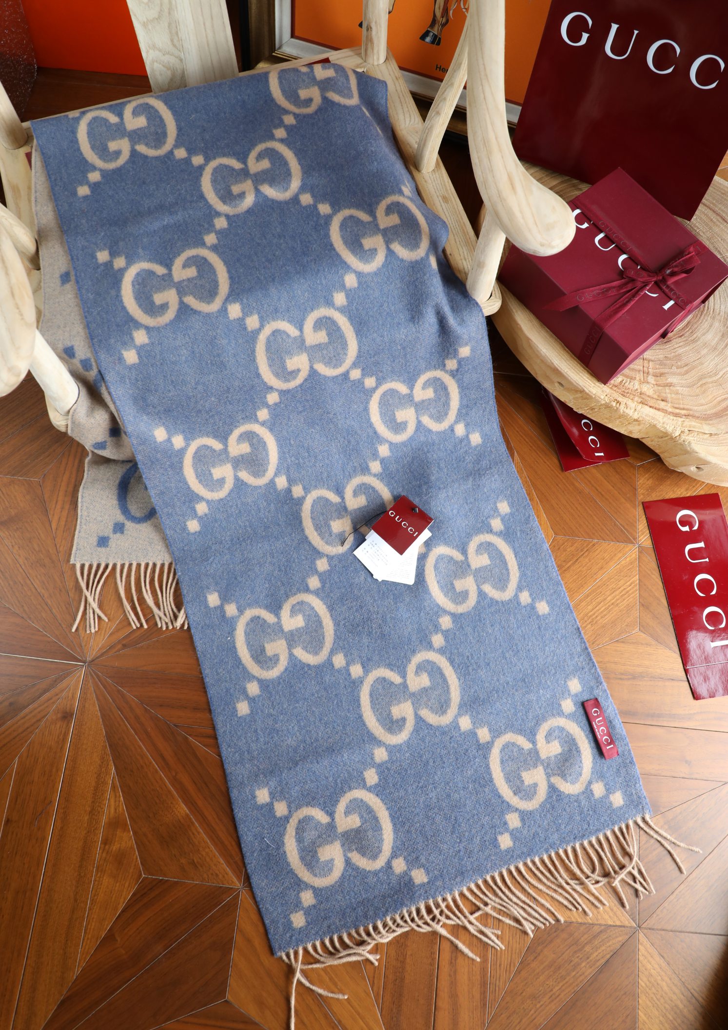 【代购级 出入专柜无压力】古驰经典大G 双面提花流苏围巾 无敌显气质 日常百搭还显质感!越看越爱! 比传统的棕色还要好看 棕色围巾太多了尝试一下牛仔蓝拼棕色 清新的秋冬不挑人 !