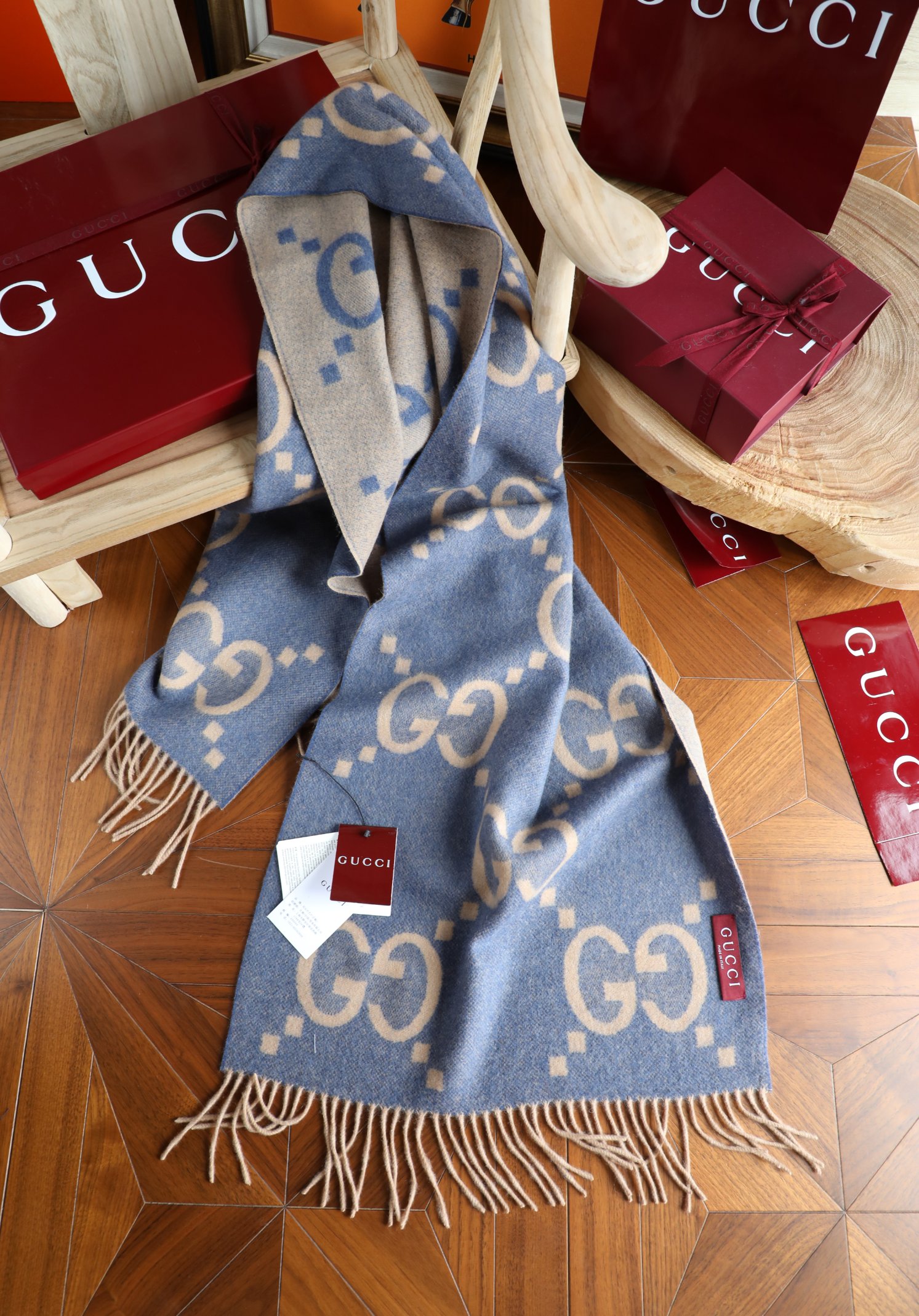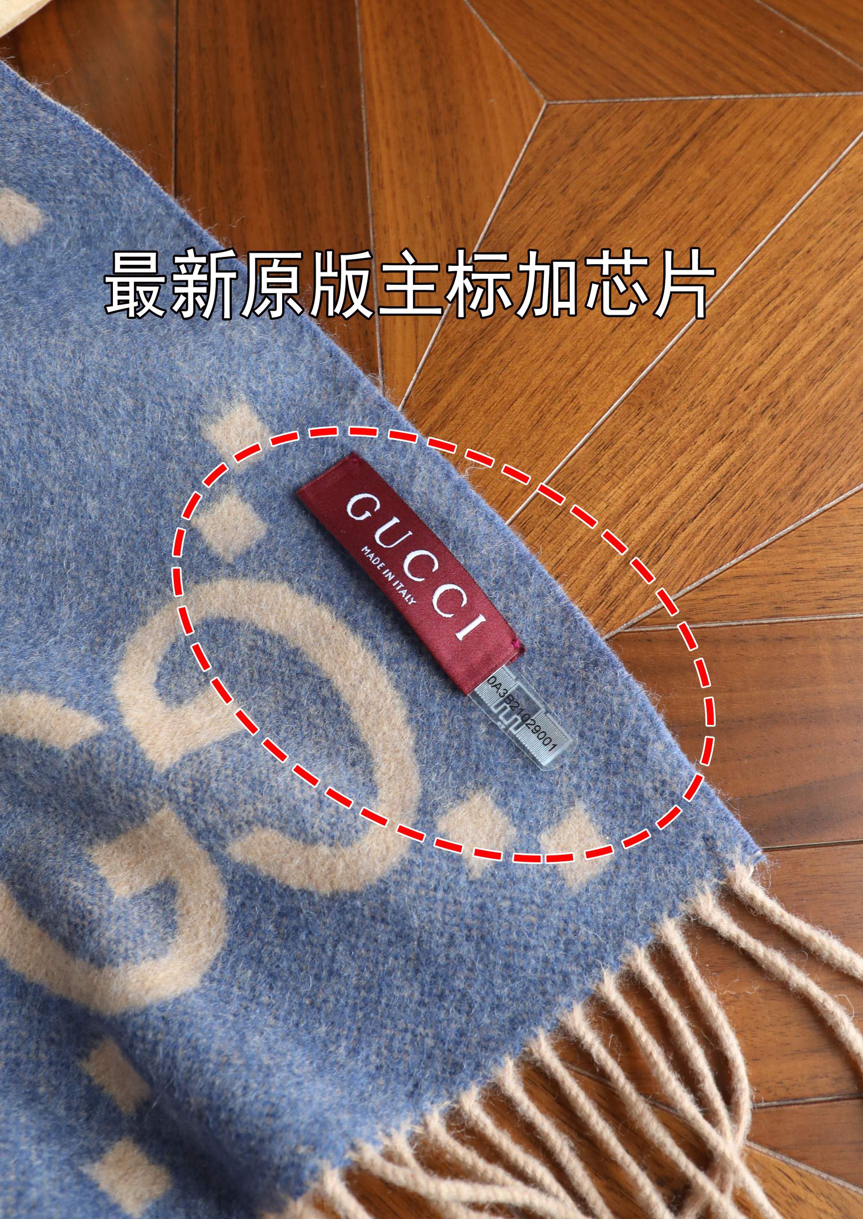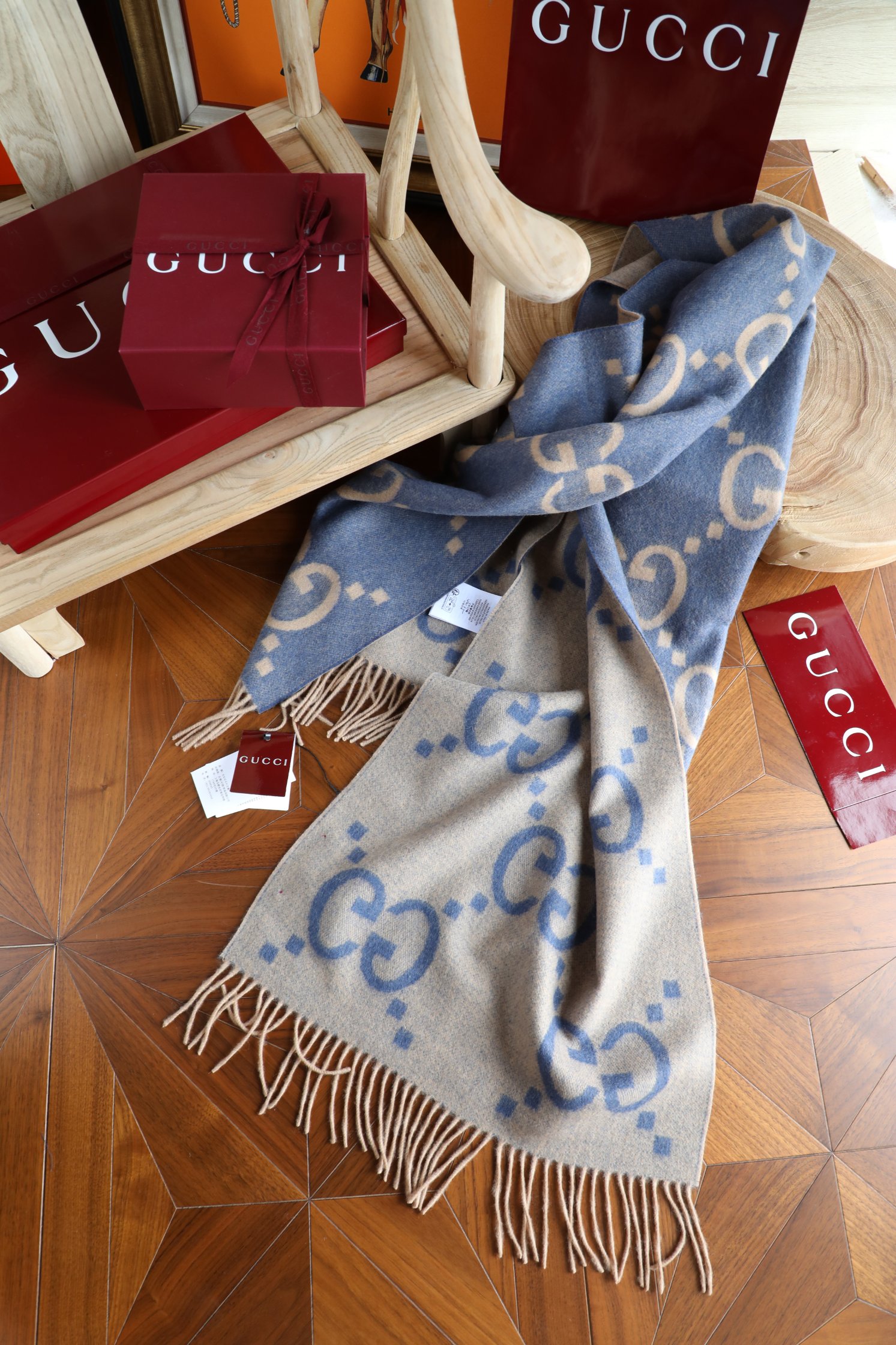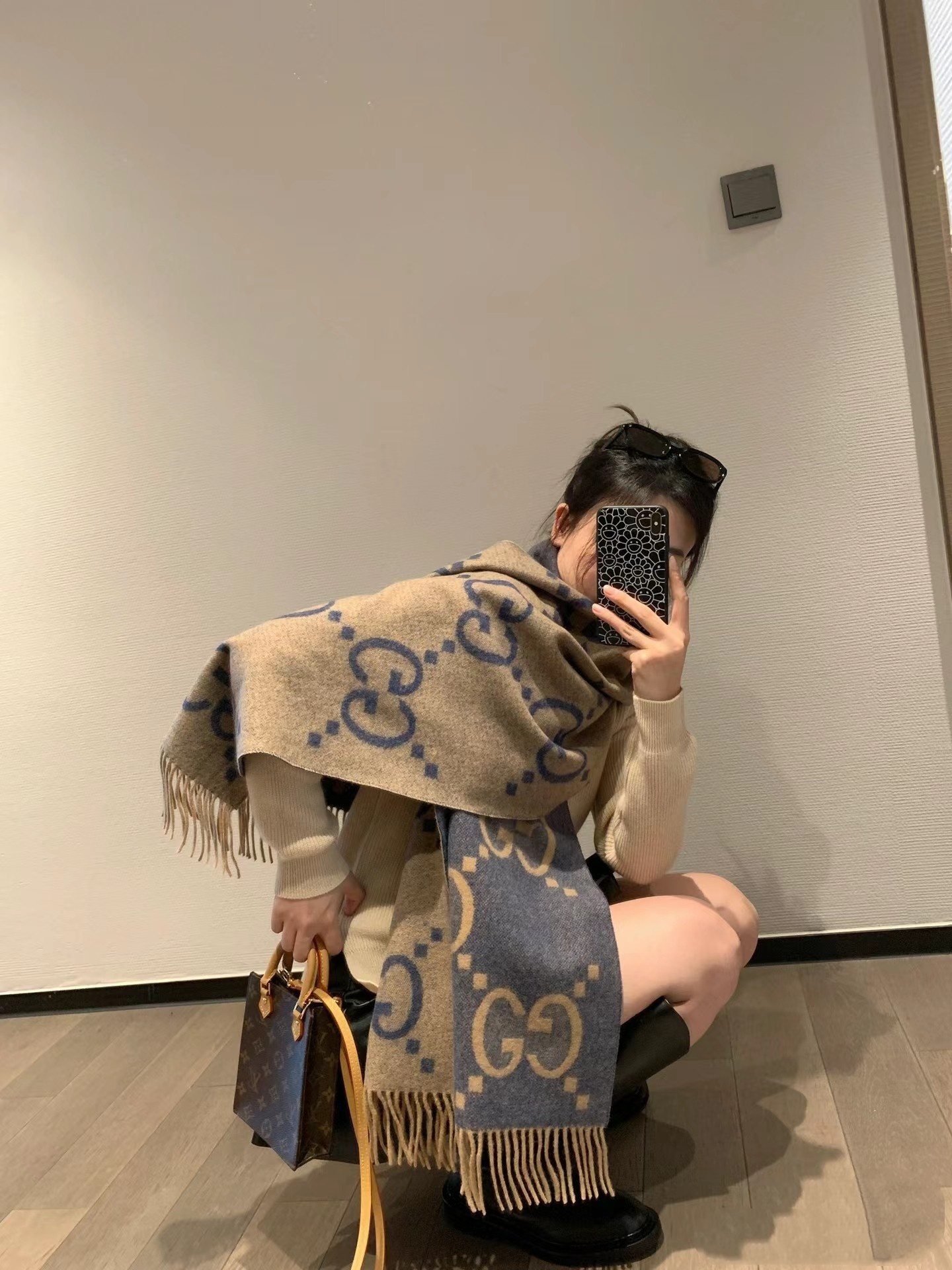 【代购级 出入专柜无压力】古驰经典大G 双面提花流苏围巾 无敌显气质 日常百搭还显质感!越看越爱! 比传统的棕色还要好看 棕色围巾太多了尝试一下牛仔蓝拼棕色 清新的秋冬不挑人 !