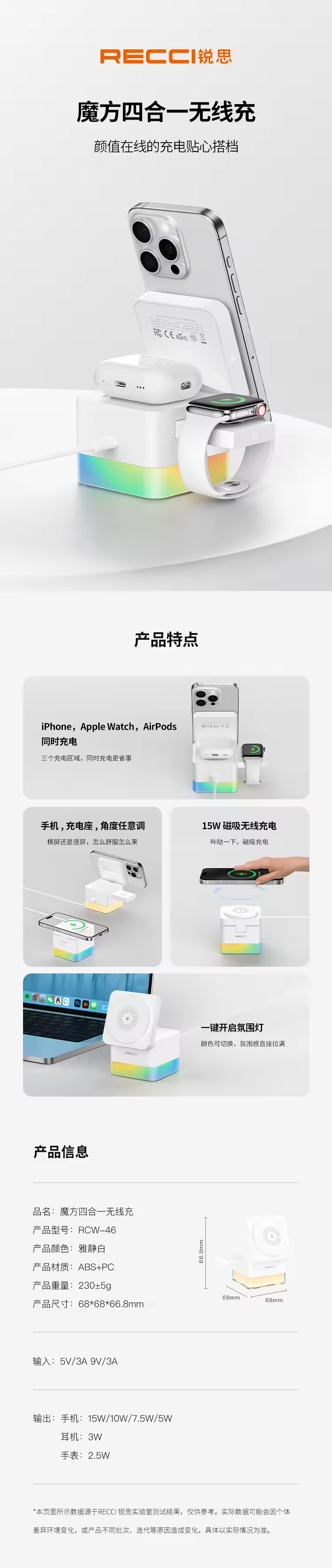 【仅拆封,非全新】RECCI锐思 RCW 46 魔方四合一无线充